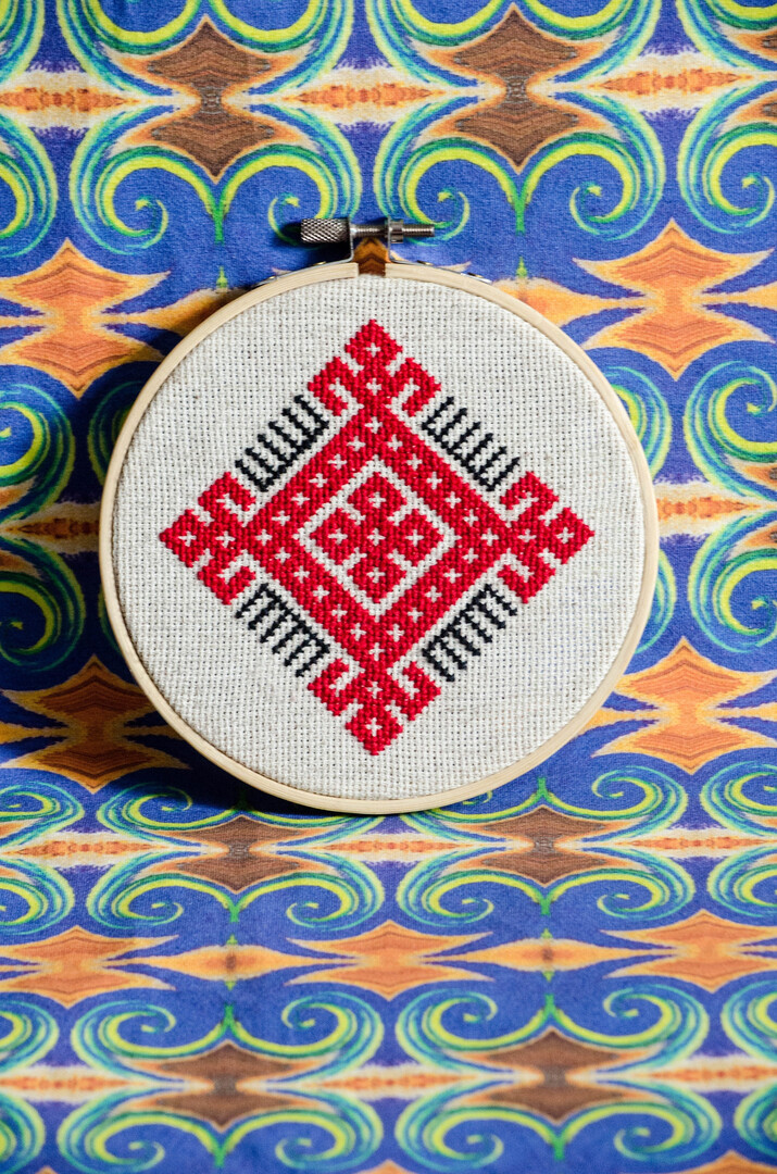 The embroidery hoop measures 5.3"- 5.1" (13.5 -13 cm), and the back has been left uncovered.