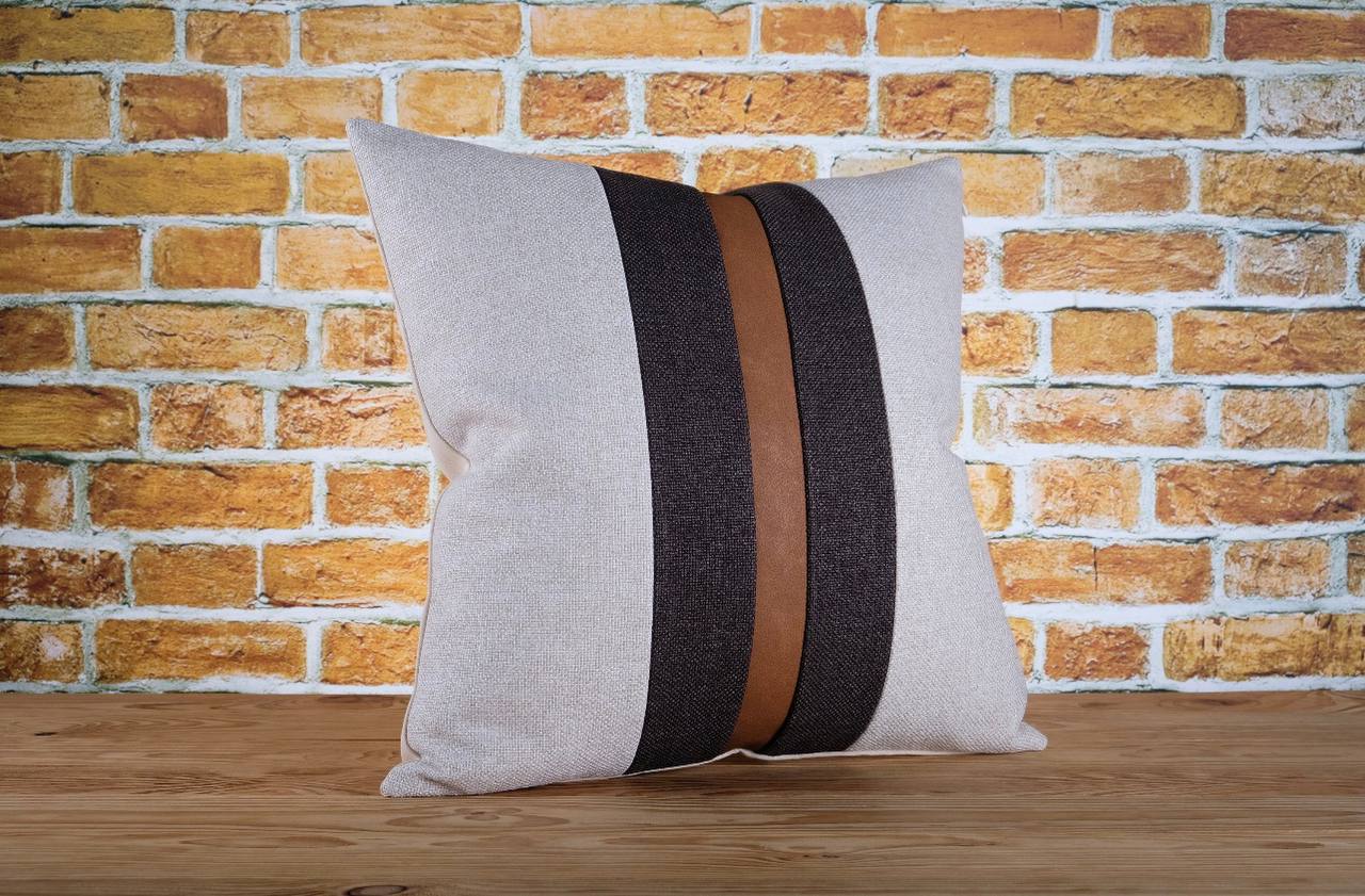 Set of 4 Pillow Covers, Faux Leather Stripe, Charcoal and Beige Cushions