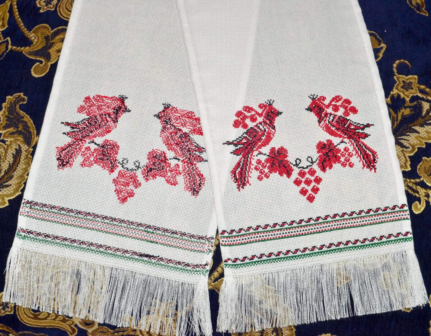 Embroidered with traditional Ukrainian symbols - symbolizing harmony, prosperity, love, abundance - A pair of Firebird with grapes.