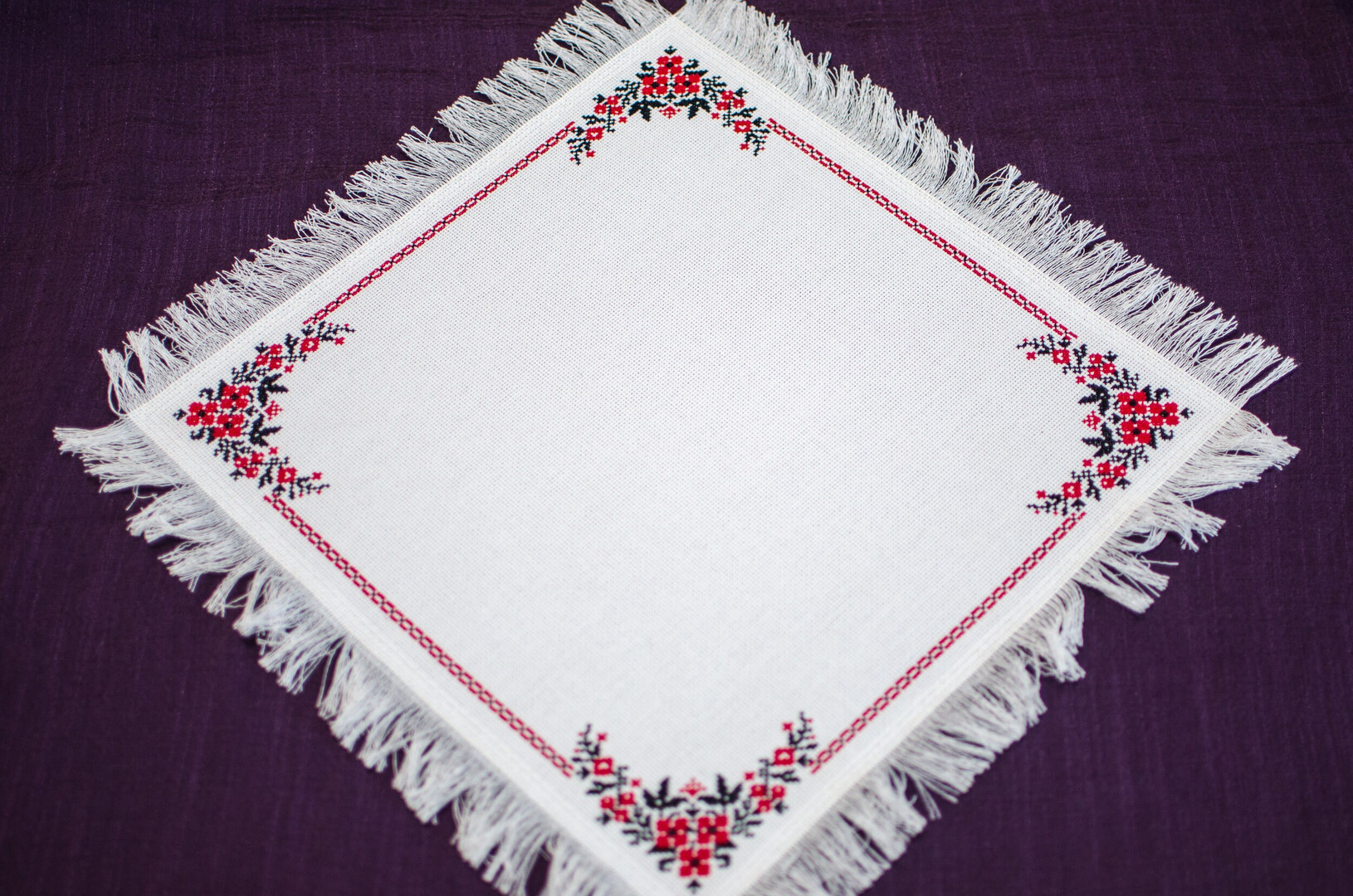 The table cloth is made of high quality cotton, the threads for the cross-stitch embroidery are cotton.