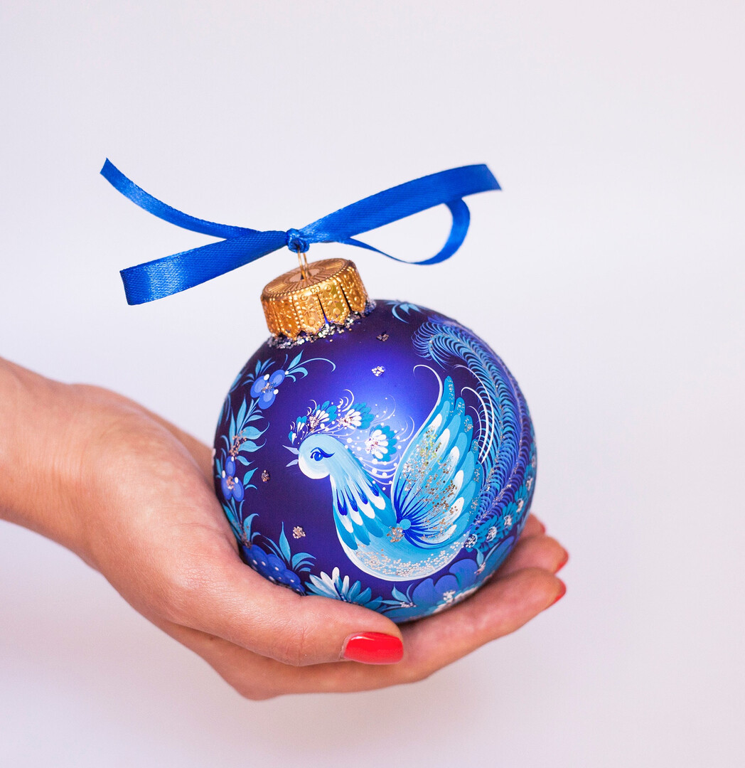 Hand painted Christmas ornament with peacock design in Ukrainian folk style, Christmas grandma colleague family gift, glitter blue bauble