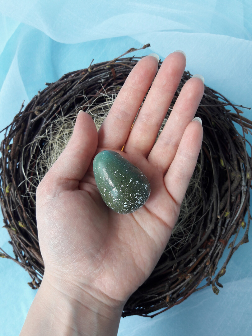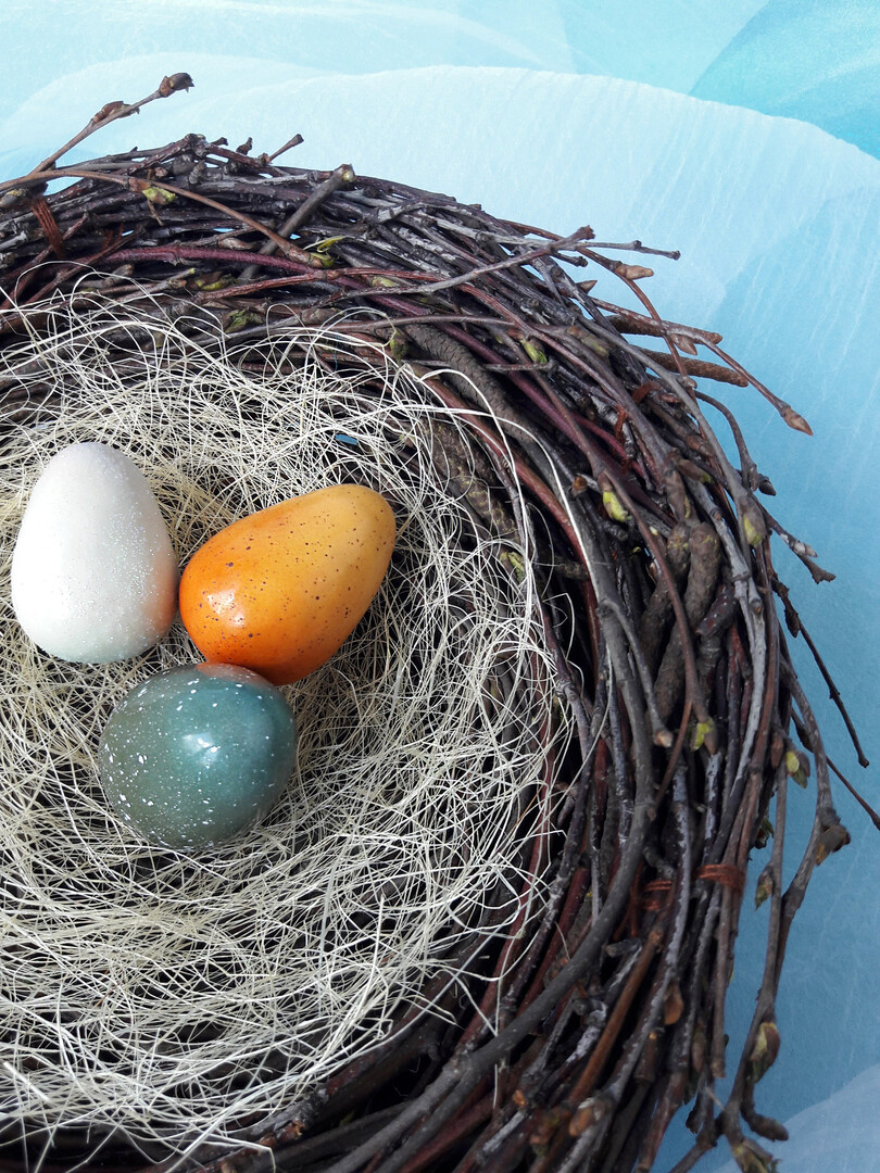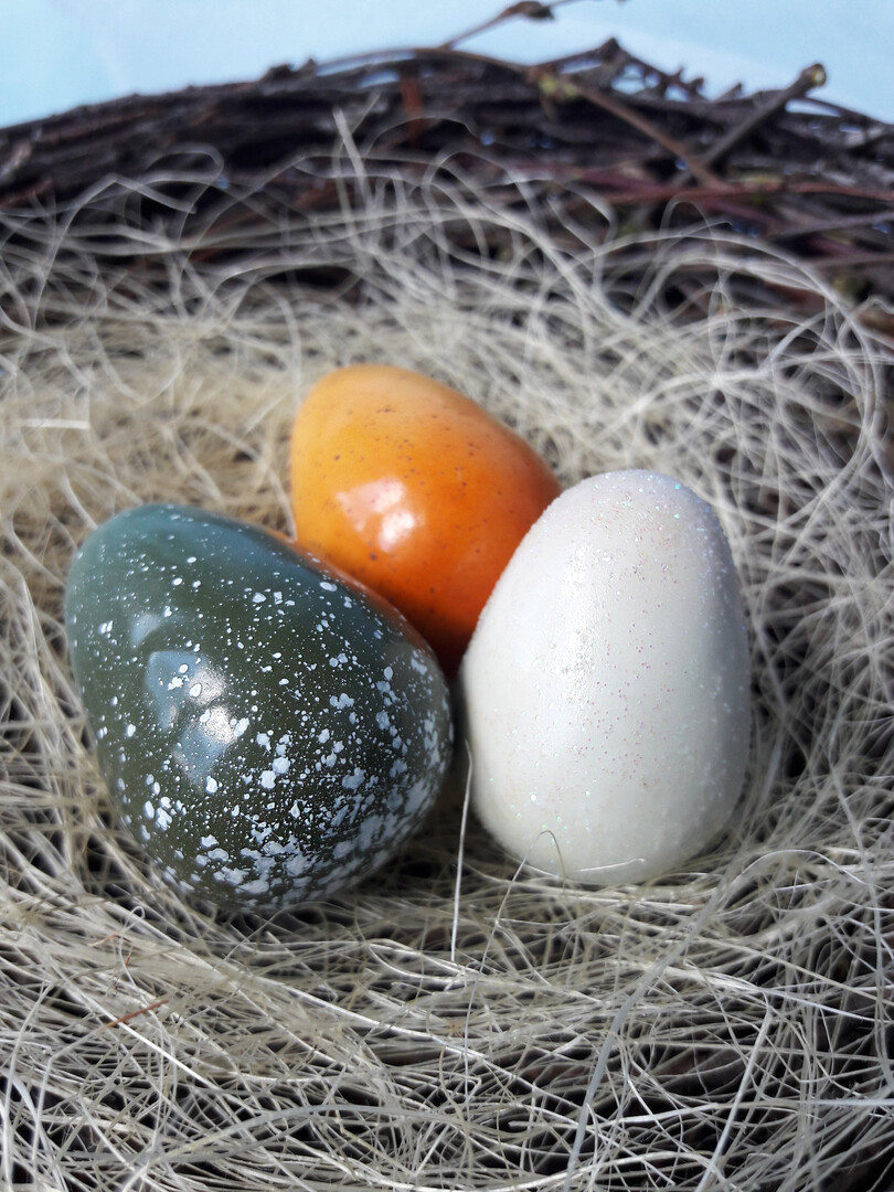 The nest is made by hand from birch branches. Sisal is also used to fill the nest. The eggs are made by hand from polymer clay, painted with acrylic.