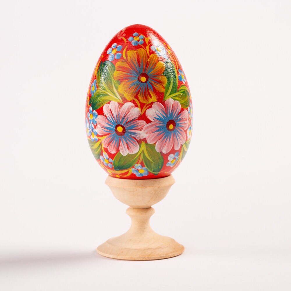 Wooden egg with hand-painted Easter illustration with Petrykivka elements.