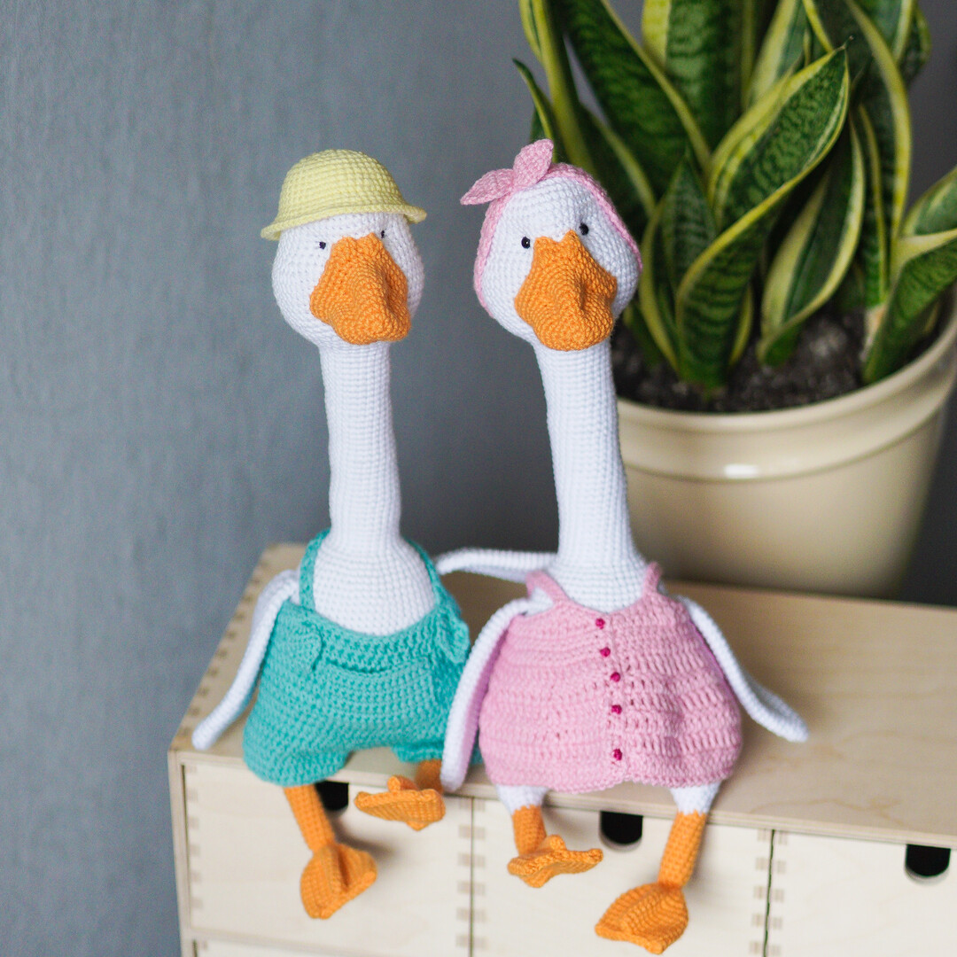 This is a DIGITAL PATTERN in English on crochet a goose toy in dress and pants, and hat in pdf format, this is not a finished toy.