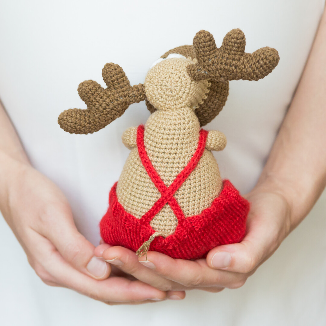 This is a DIGITAL PATTERN in English on crochet a moose toy in red pants in pdf format, this is not a finished toy.