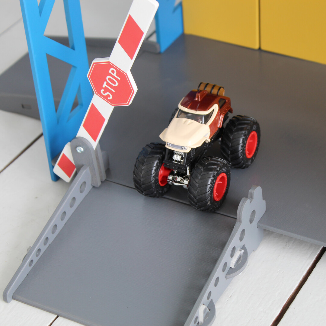 - three mobile put-any-where-you-want ramps and one with white-red "stop" gates making toy cars ride on and off the toy garage smoother