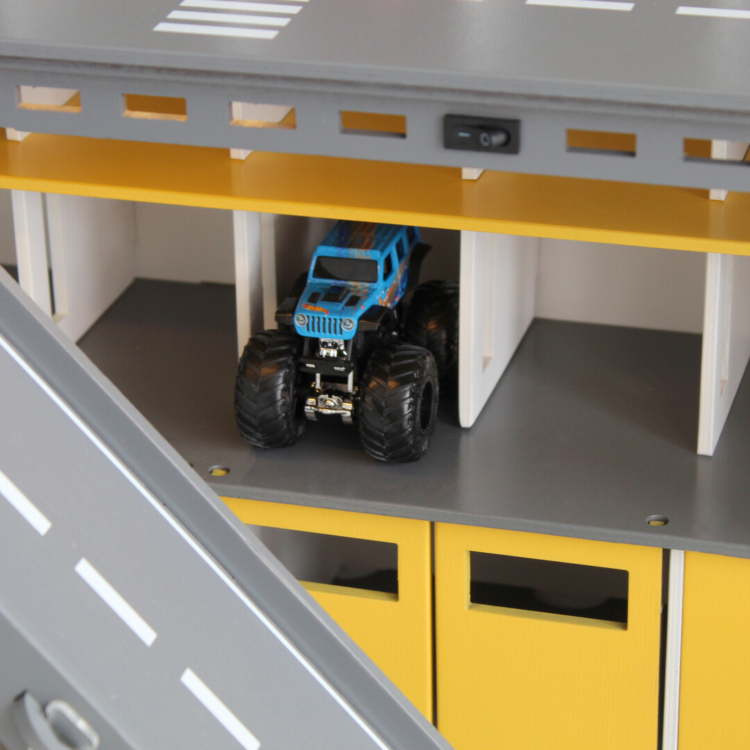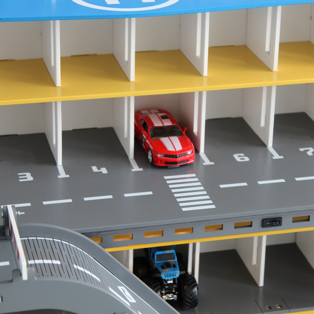 Every parent of a boy knows how obsessed with toy cars the child could be. Collection grows constantly and all those toy cars capture space on shelves, sofas, beds and under them. Some parents use toy boxes to store them but it is barely intersting for kid to put his toys in it. My product is made to kill two birds with one stone 1) store the toy cars in a one single place 2) beautiful interactive playset