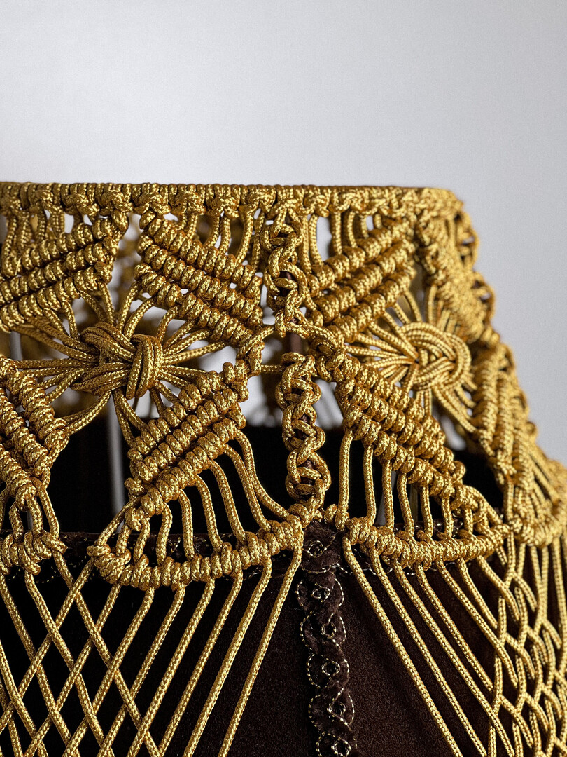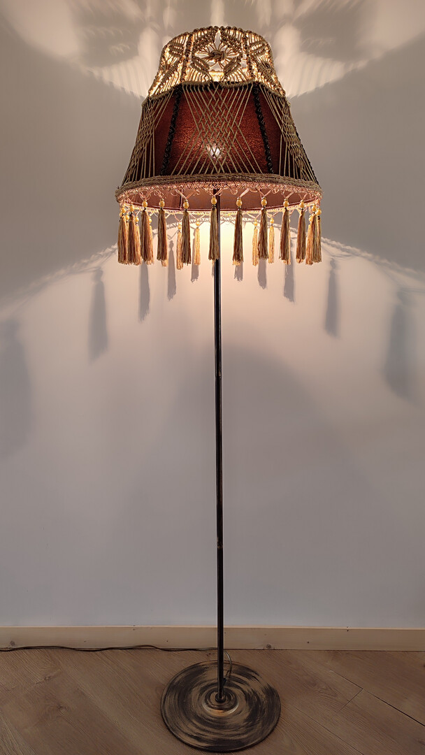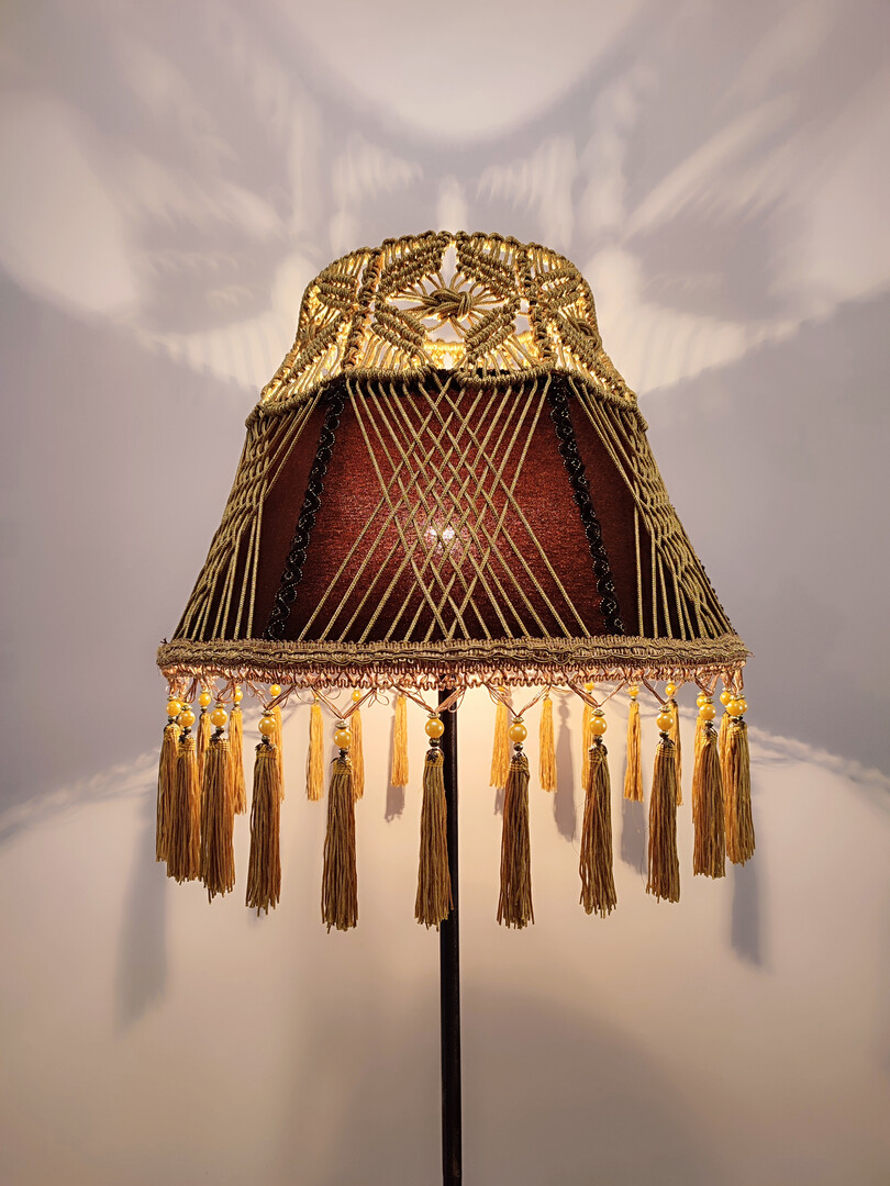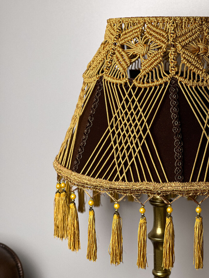 Lampshade: metal frame, material - brown base with decorative elements, made in macrame technique. Decorated with a decorative ribbon and fringe with tassels and beads. The lampshade can be damp cleaned.