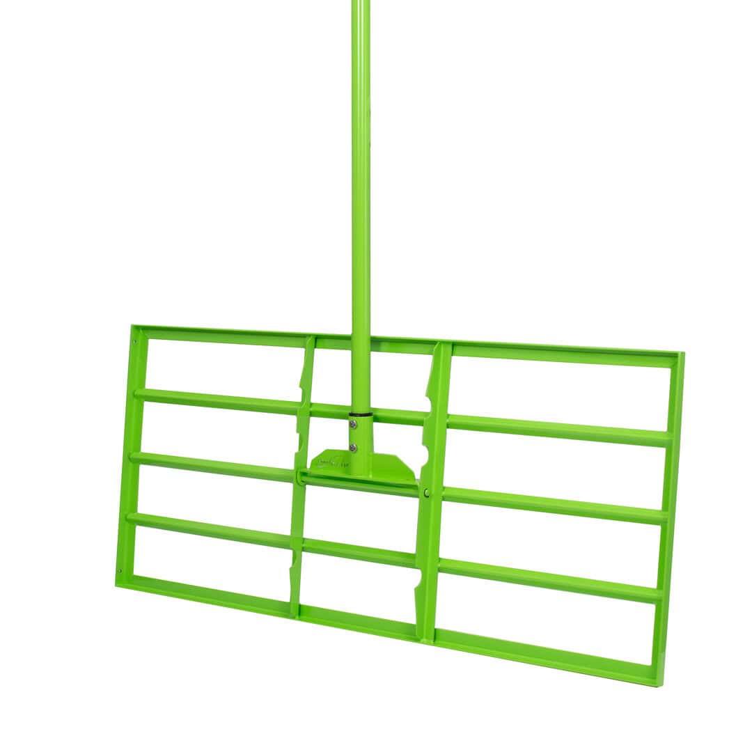 A hand-held soil leveler has a simple design consisting of a long handle and a wide blade. The blade frame is made of metal angle iron, which allows soil and sand to slide evenly through the structure.