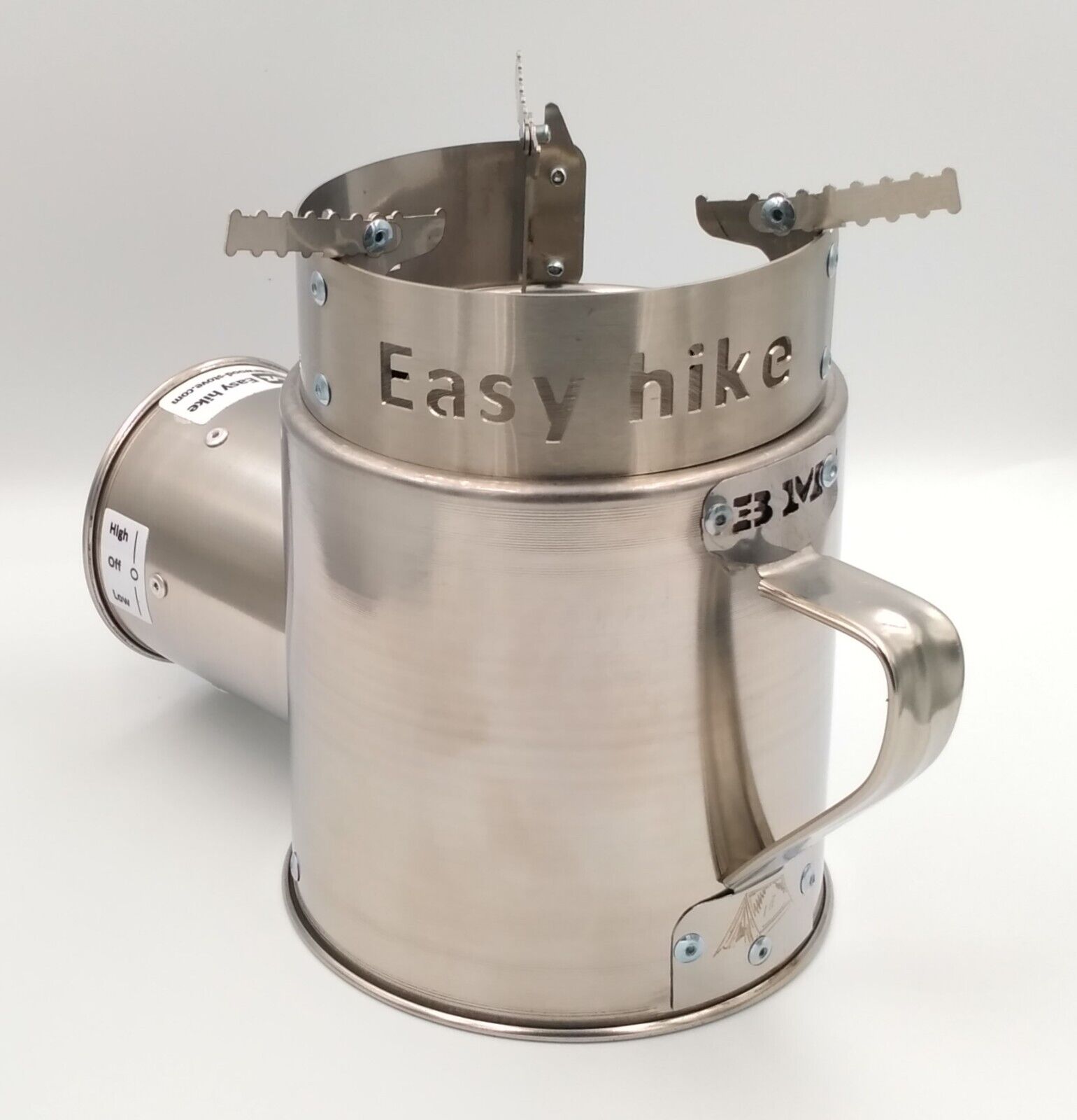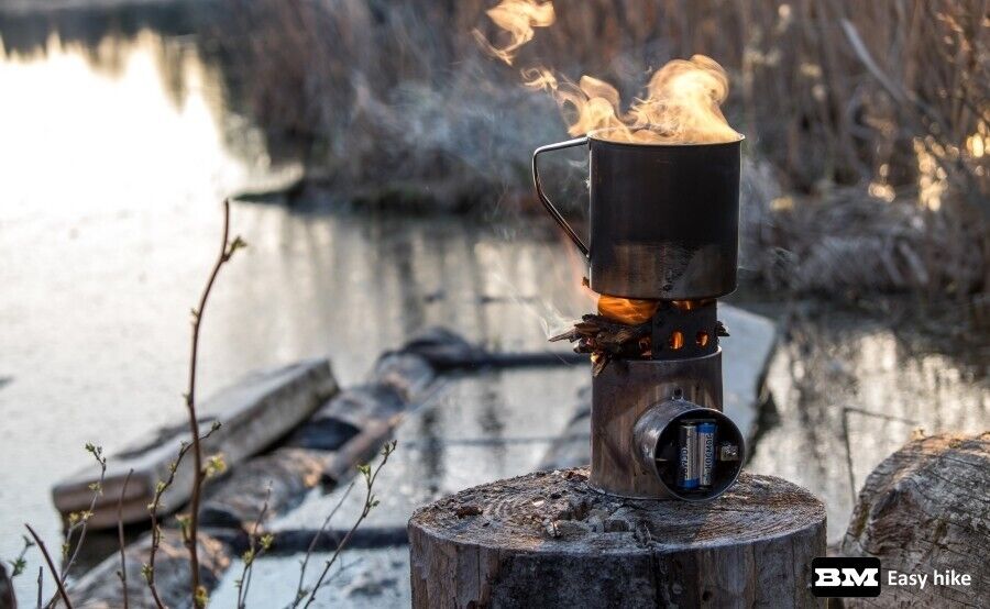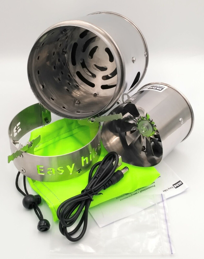 The solid fuel camping stove "Airwood Heavy Duty UP-h BM" will become a reliable companion for travelers who enjoy extended trips (a month or more) in marine, tropical climates or other aggressive environments for metal products. All connections of the stand for the dishes and combustion chamber are made with stainless steel fasteners. All the most vulnerable nodes of the burner are made of highly corrosion-resistant stainless steel! The forced air supply unit of the "Airwood Heavy Duty UP-h BM" stove can be powered by batteries, Power Bank, solar panel with built-in battery or a smartphone connected via an OTG cable."