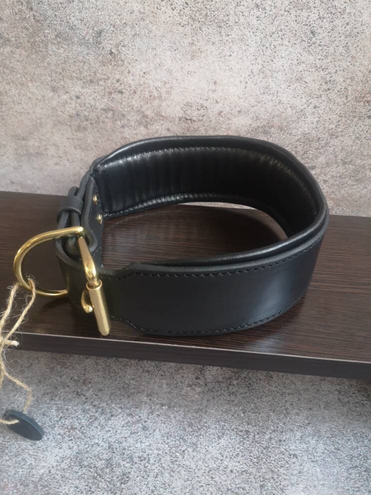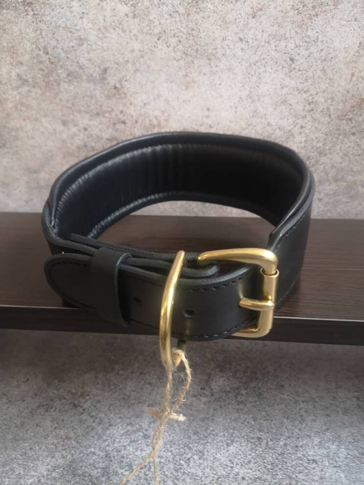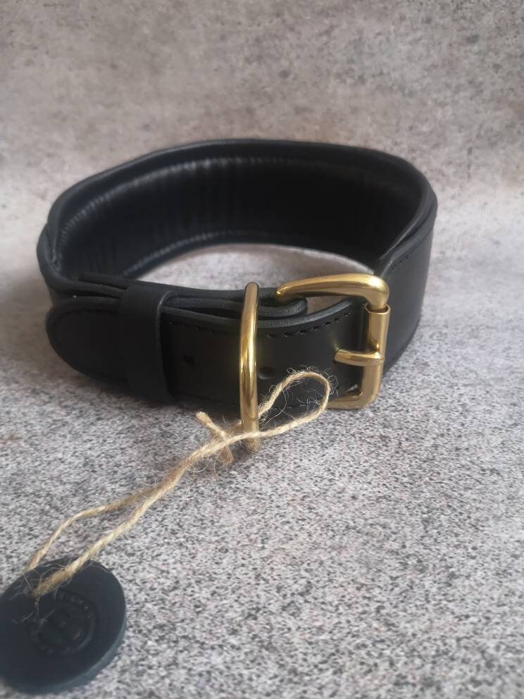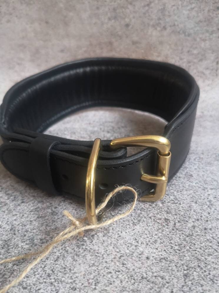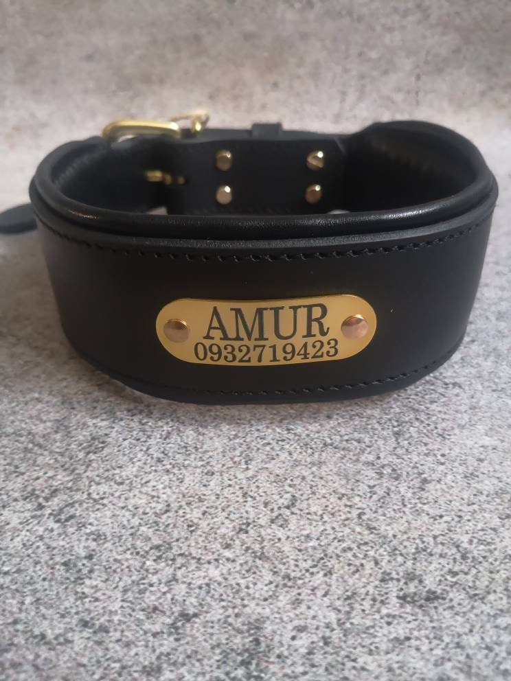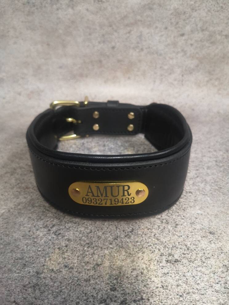 Black Leather 3 inches Wide Dog Collar with Solid Brass Name Plate and Hardware, Engraved Golden Tag Dog Collar Personalized, Custom Gear