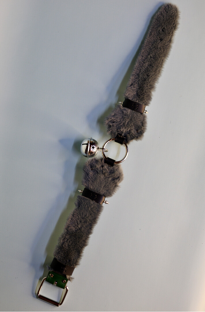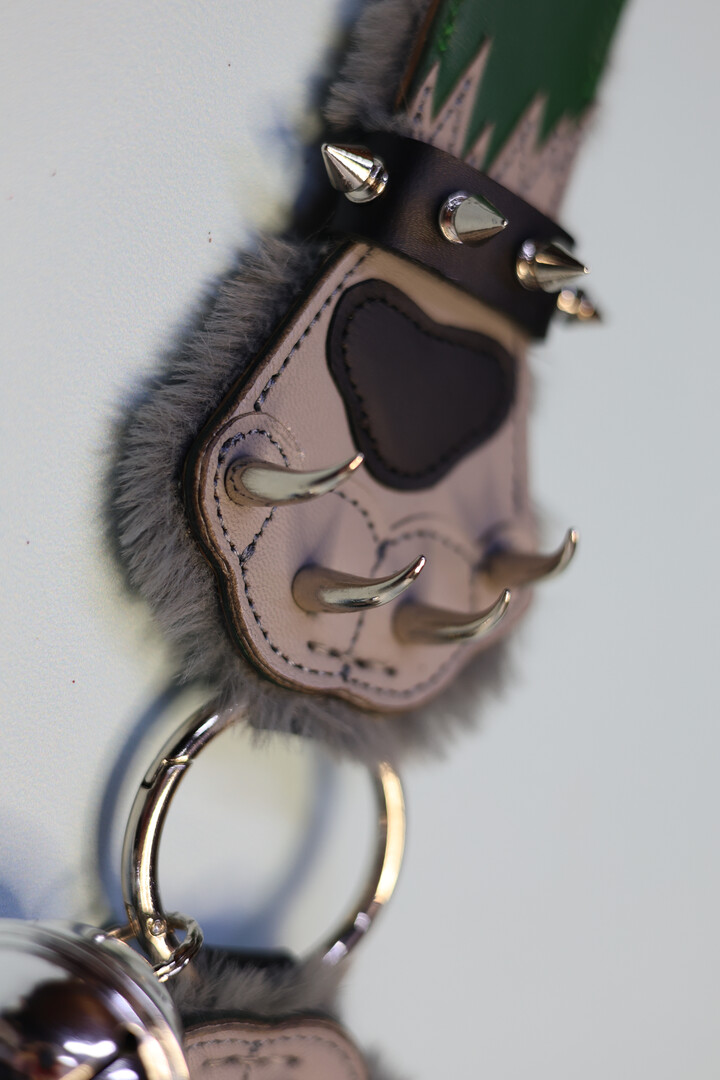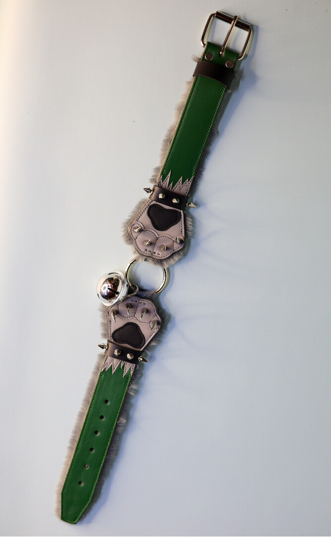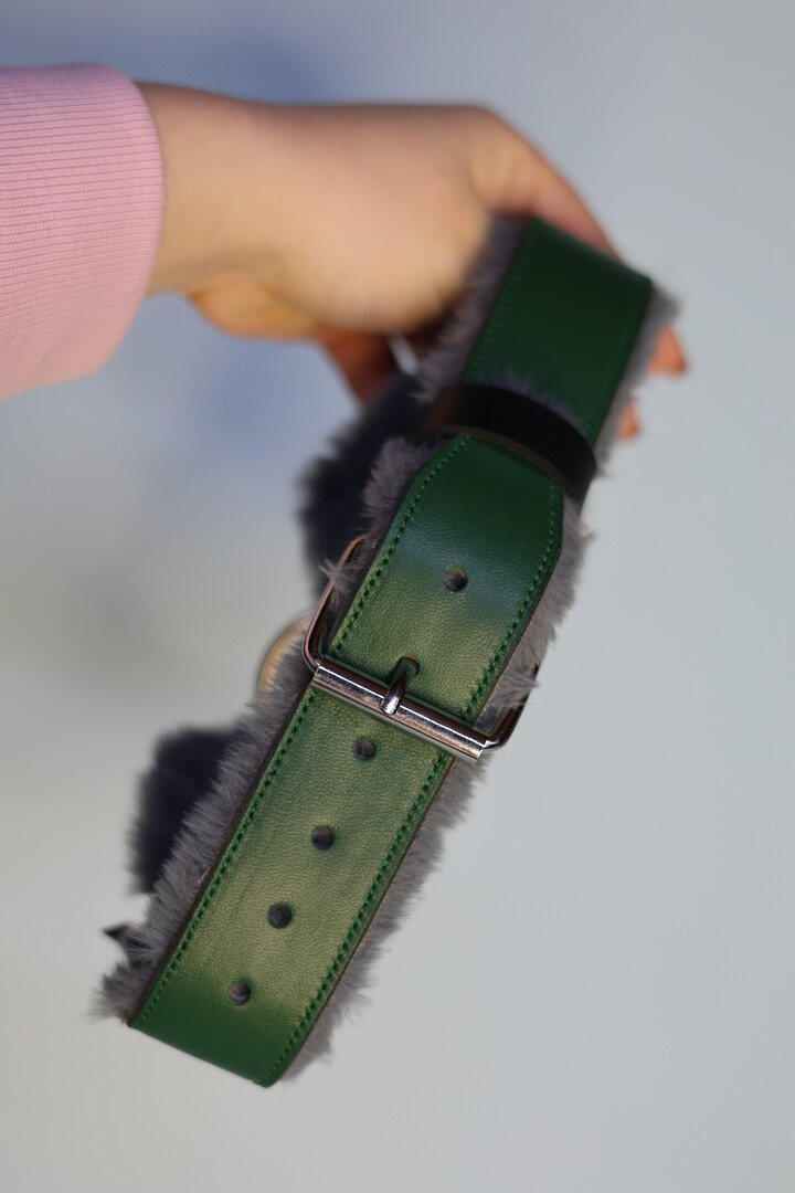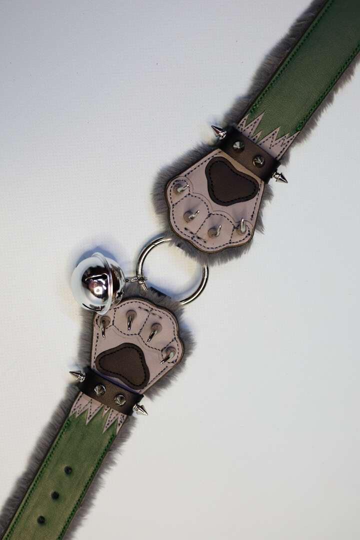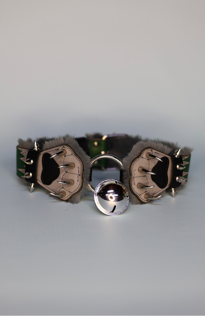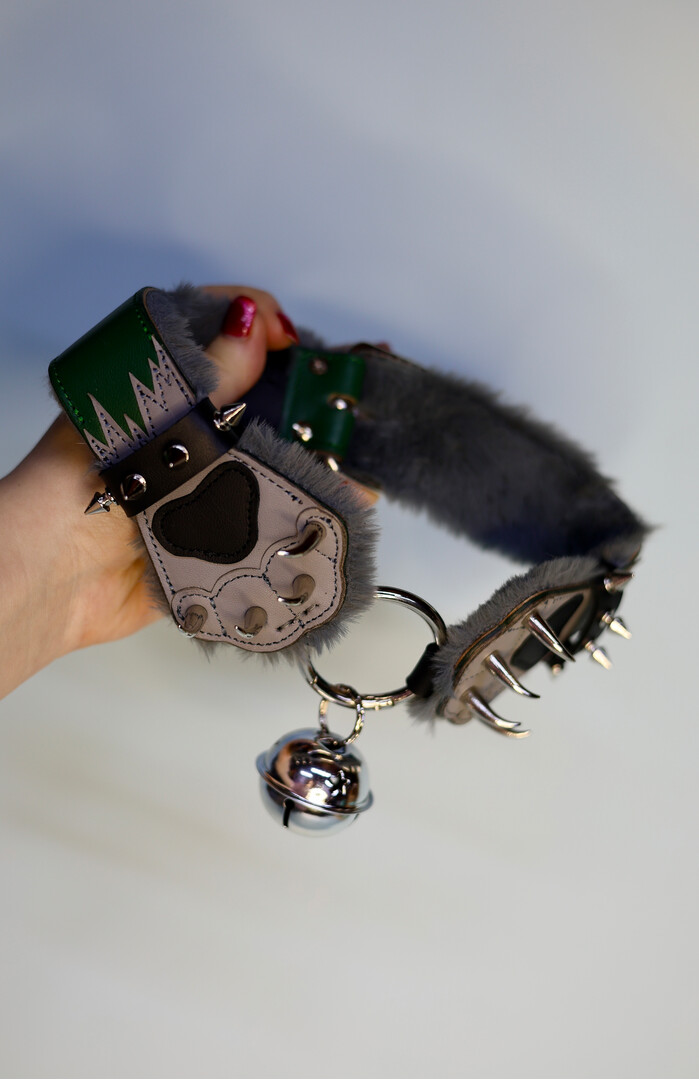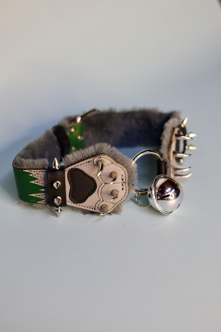 Made to order! Green-gray Collar in the shape of a paws with fur lining