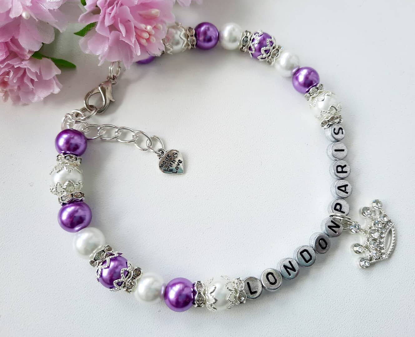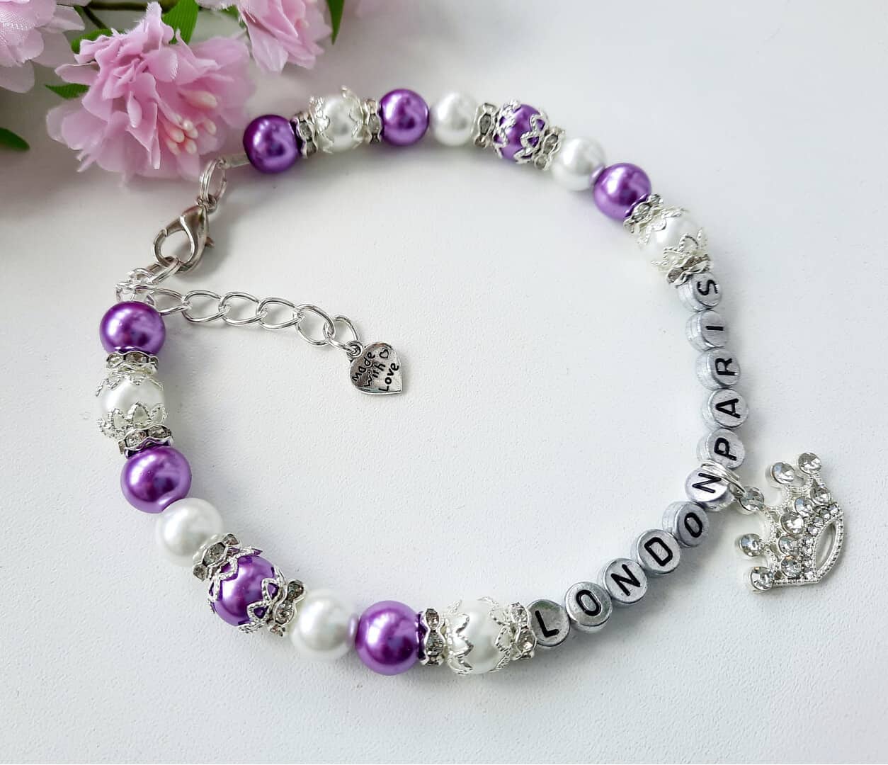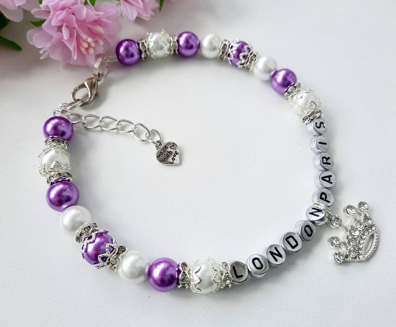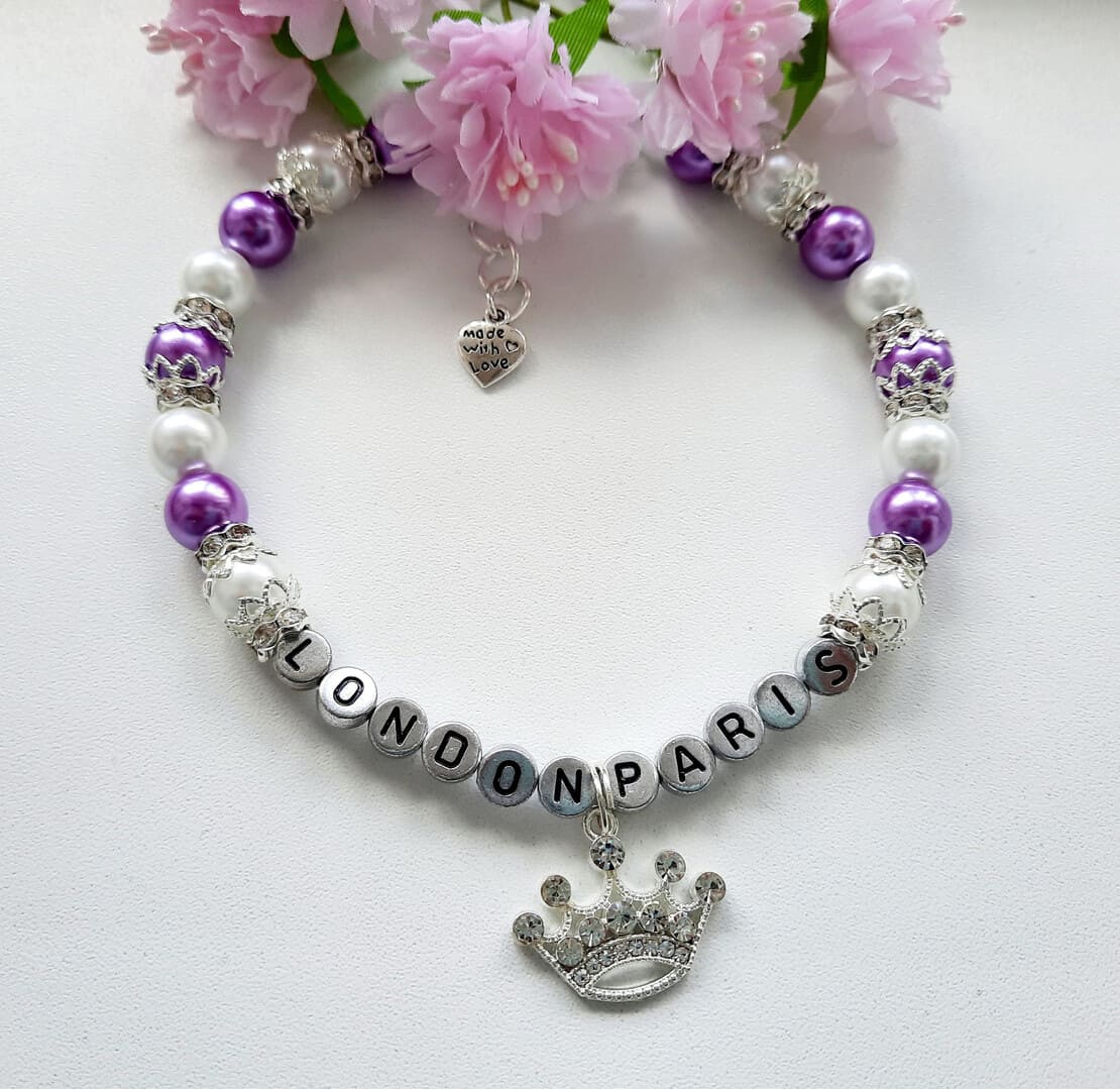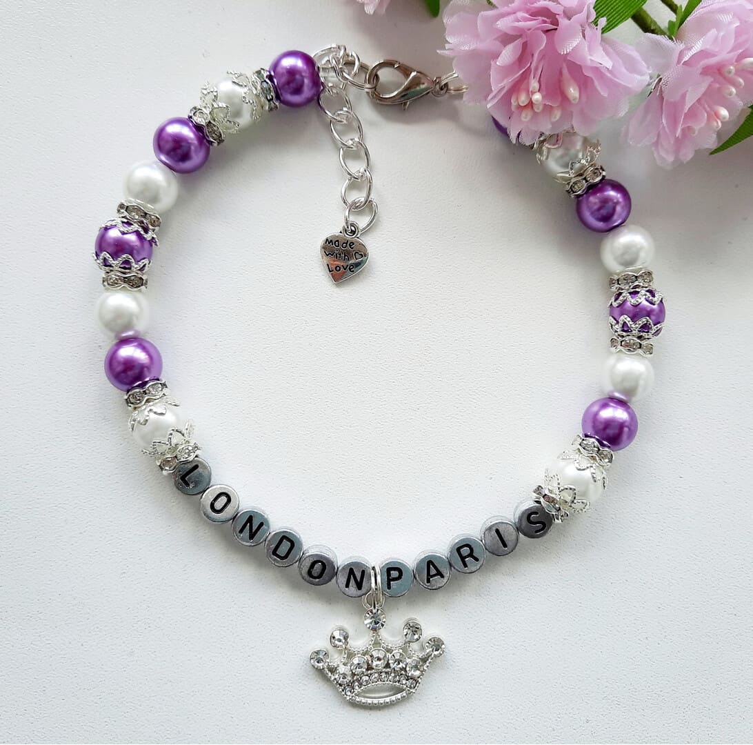 Personalized white and purple pearl necklace for dogs with crown charm and rhinestone roundels
