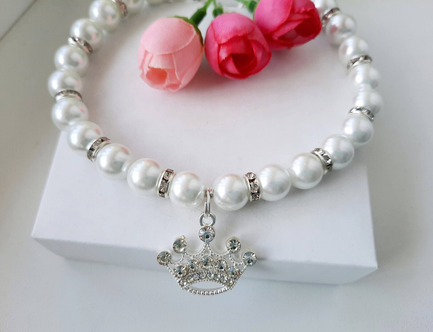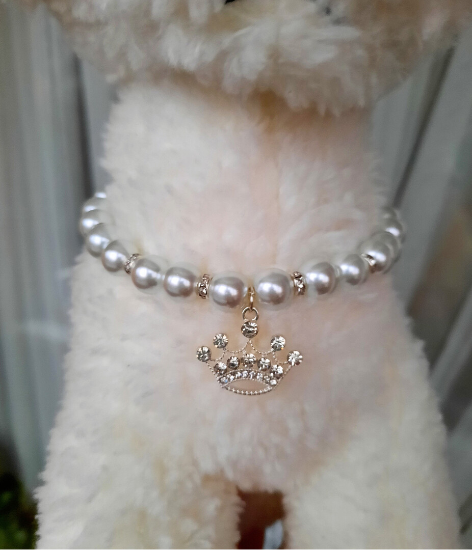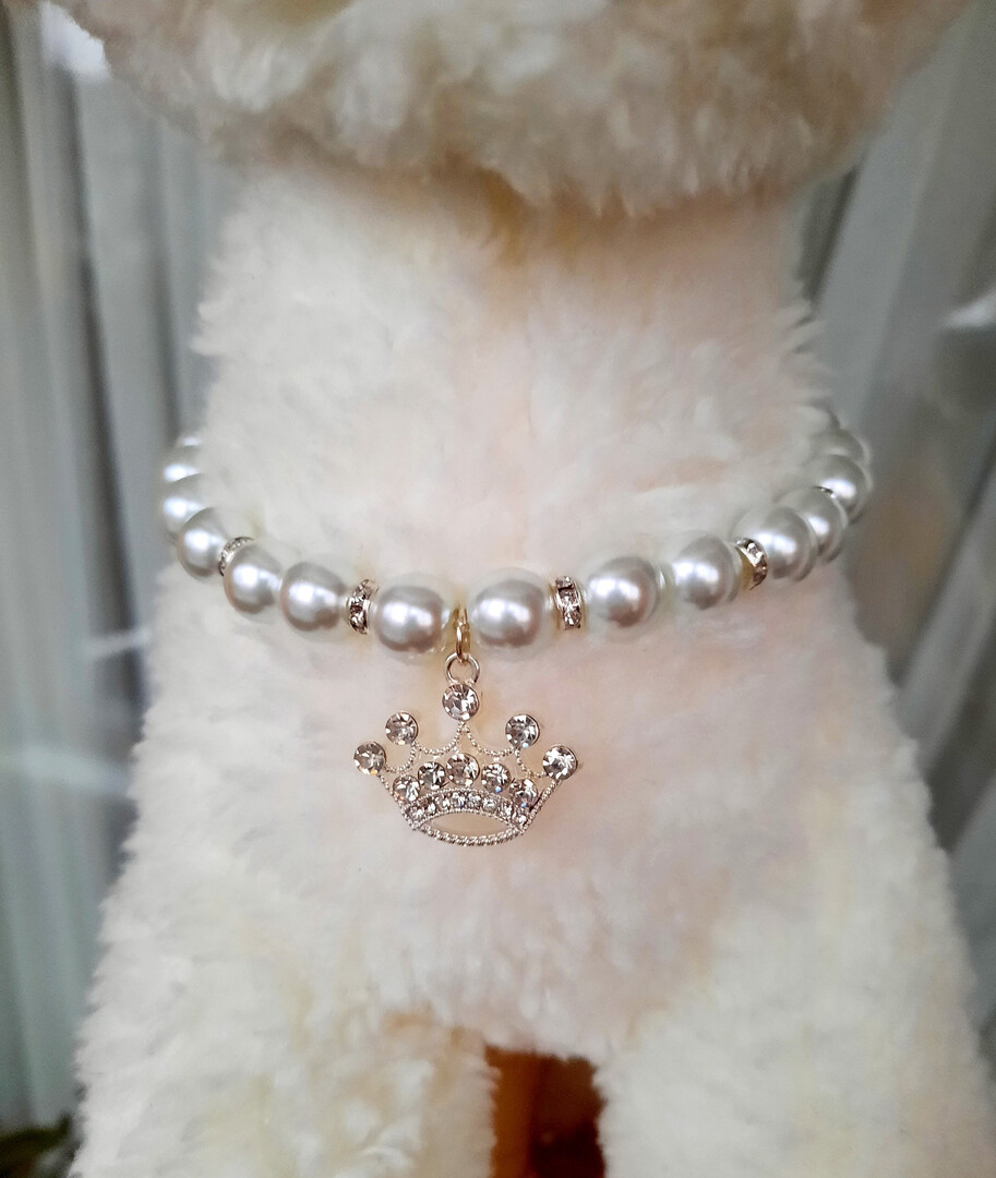 White pearl necklace for dogs and cats with crown charm and rhinestone roundels