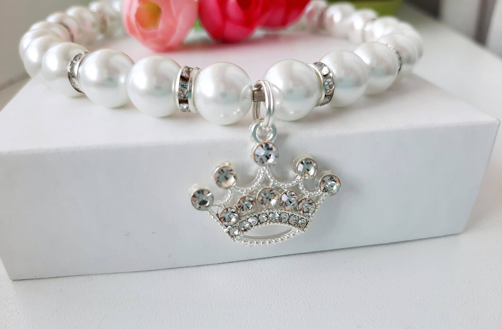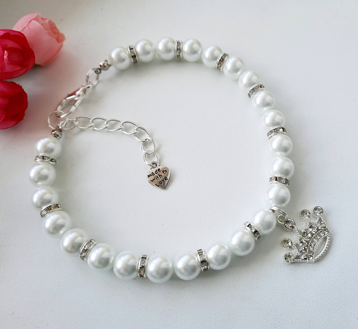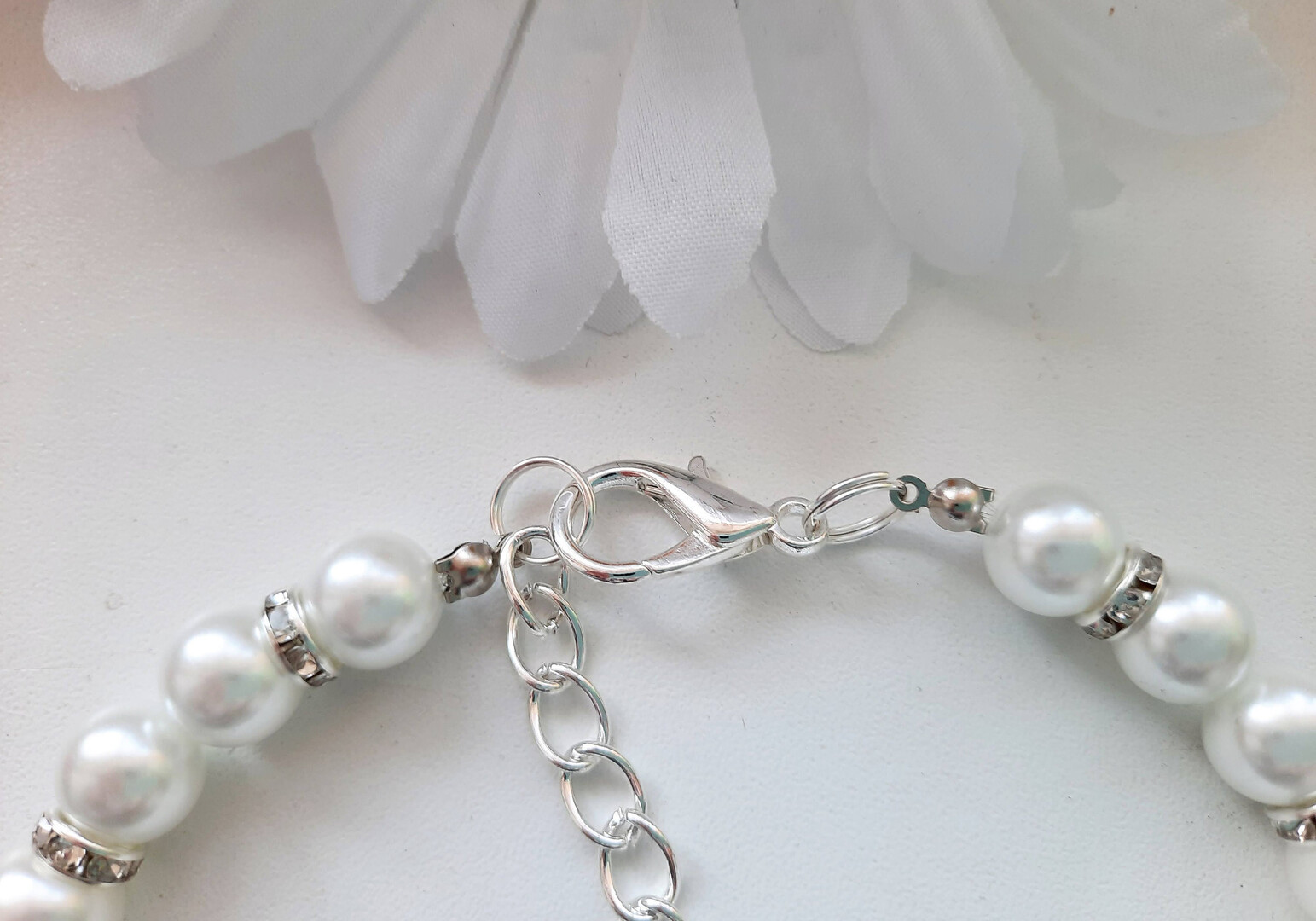 White pearl necklace for dogs and cats with crown charm and rhinestone roundels