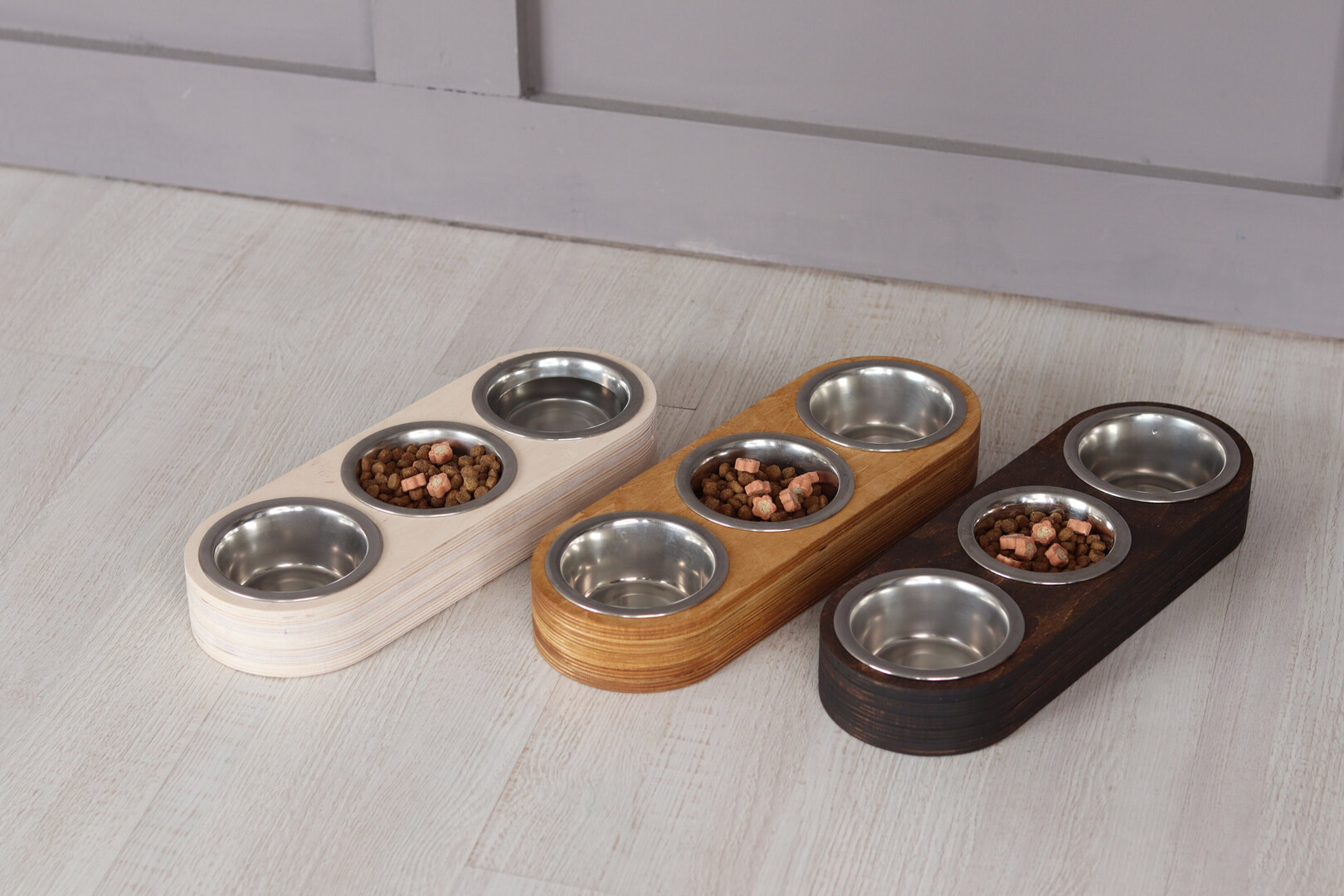 The feeding station for cats and small dogs is made of plywood and includes 3 steel bowls with a volume of 200 ml. The bowls can be taken out and washed separately. This bowl holder can be used for two pets.