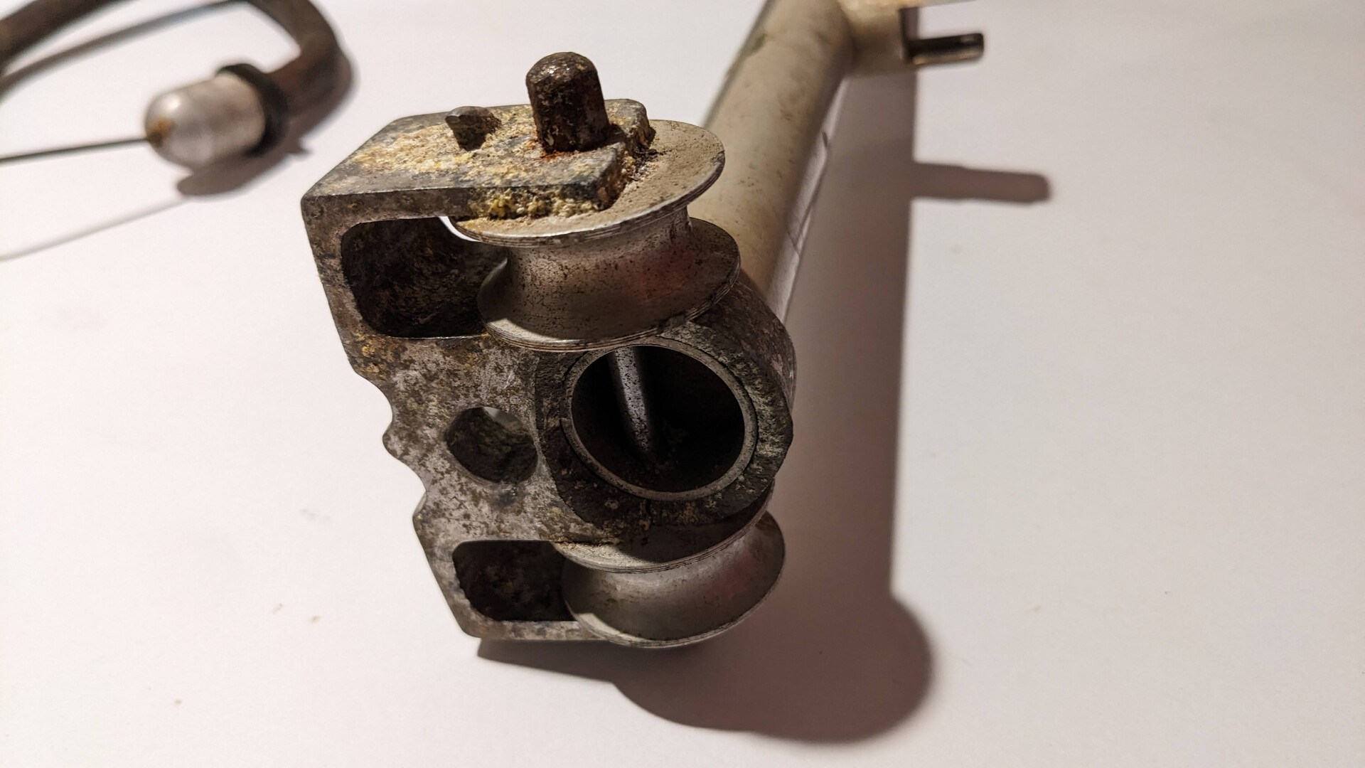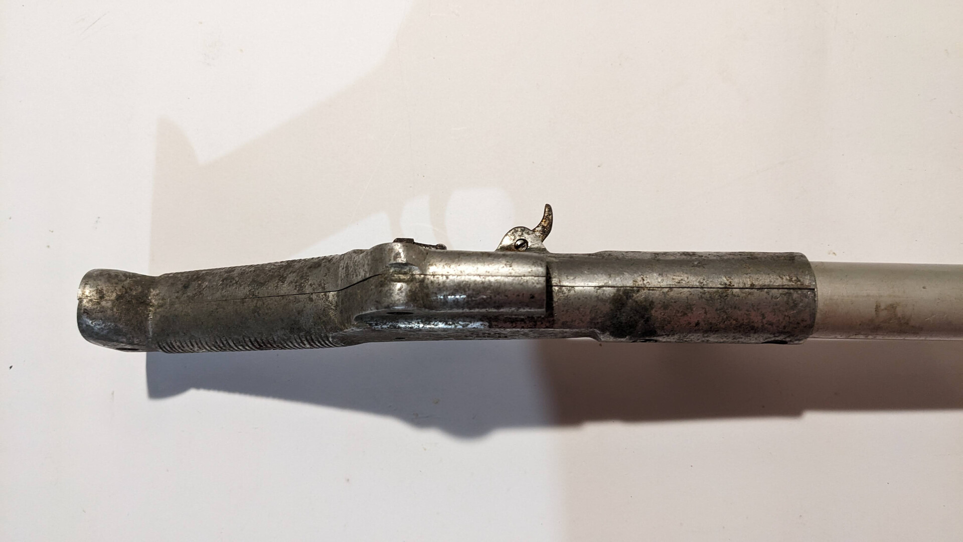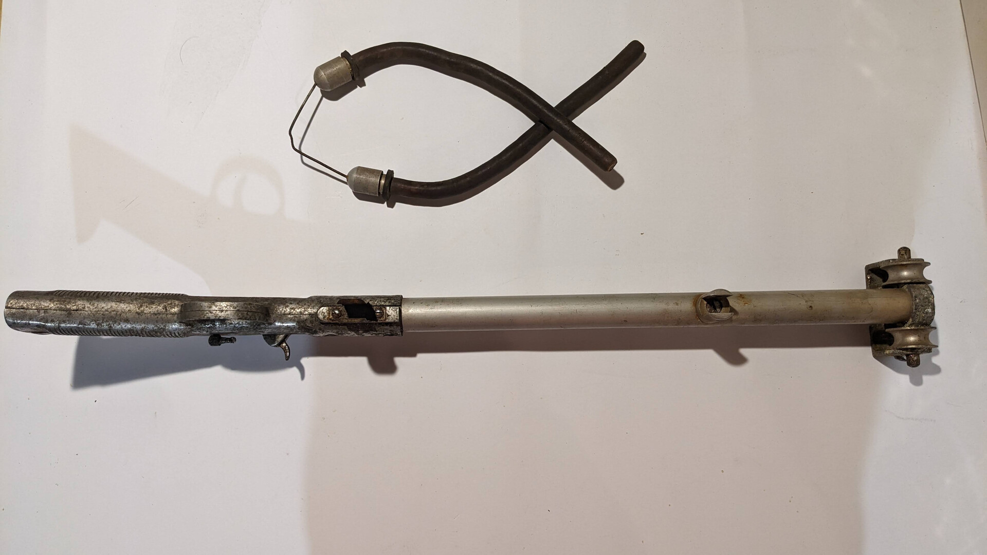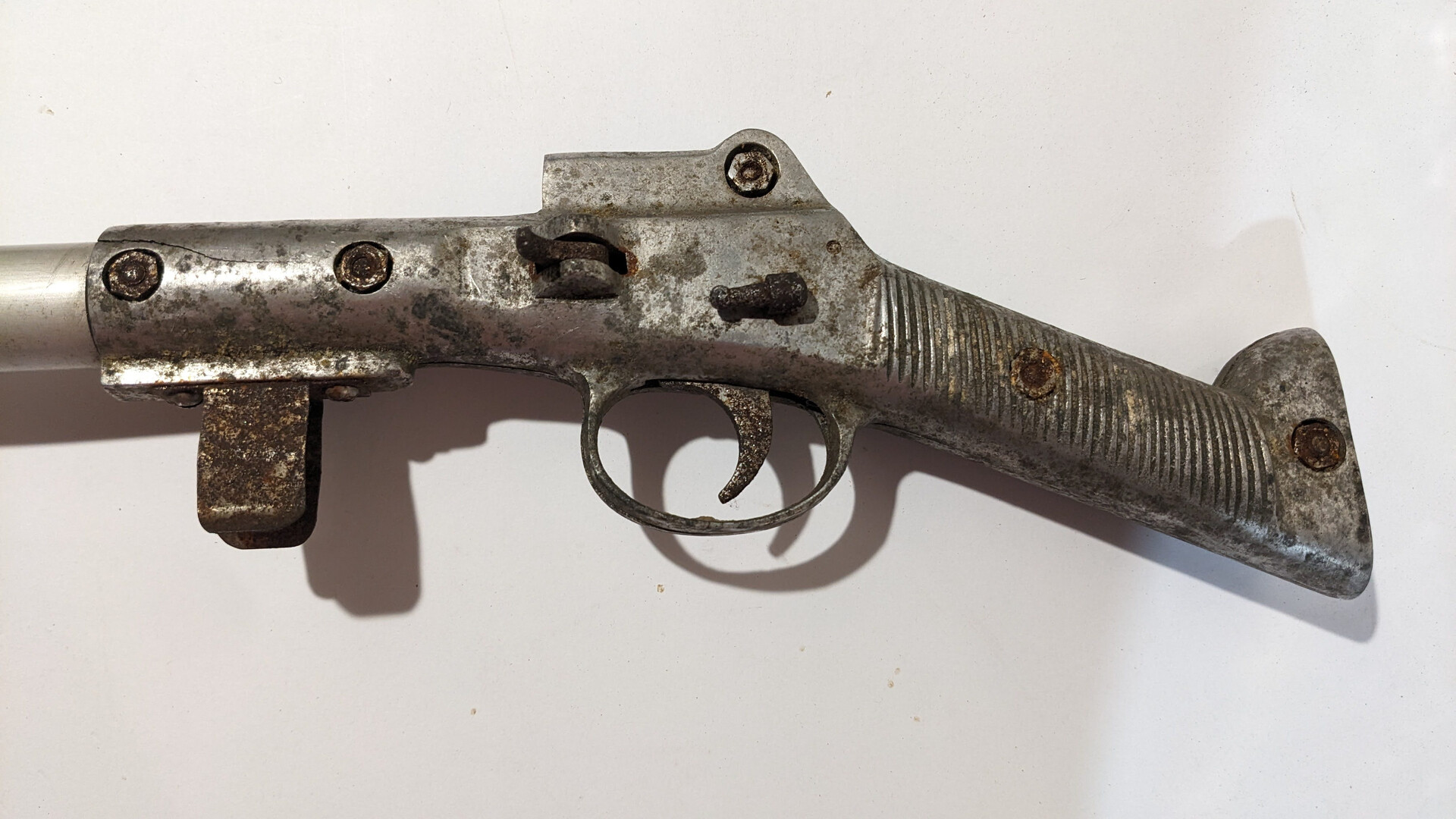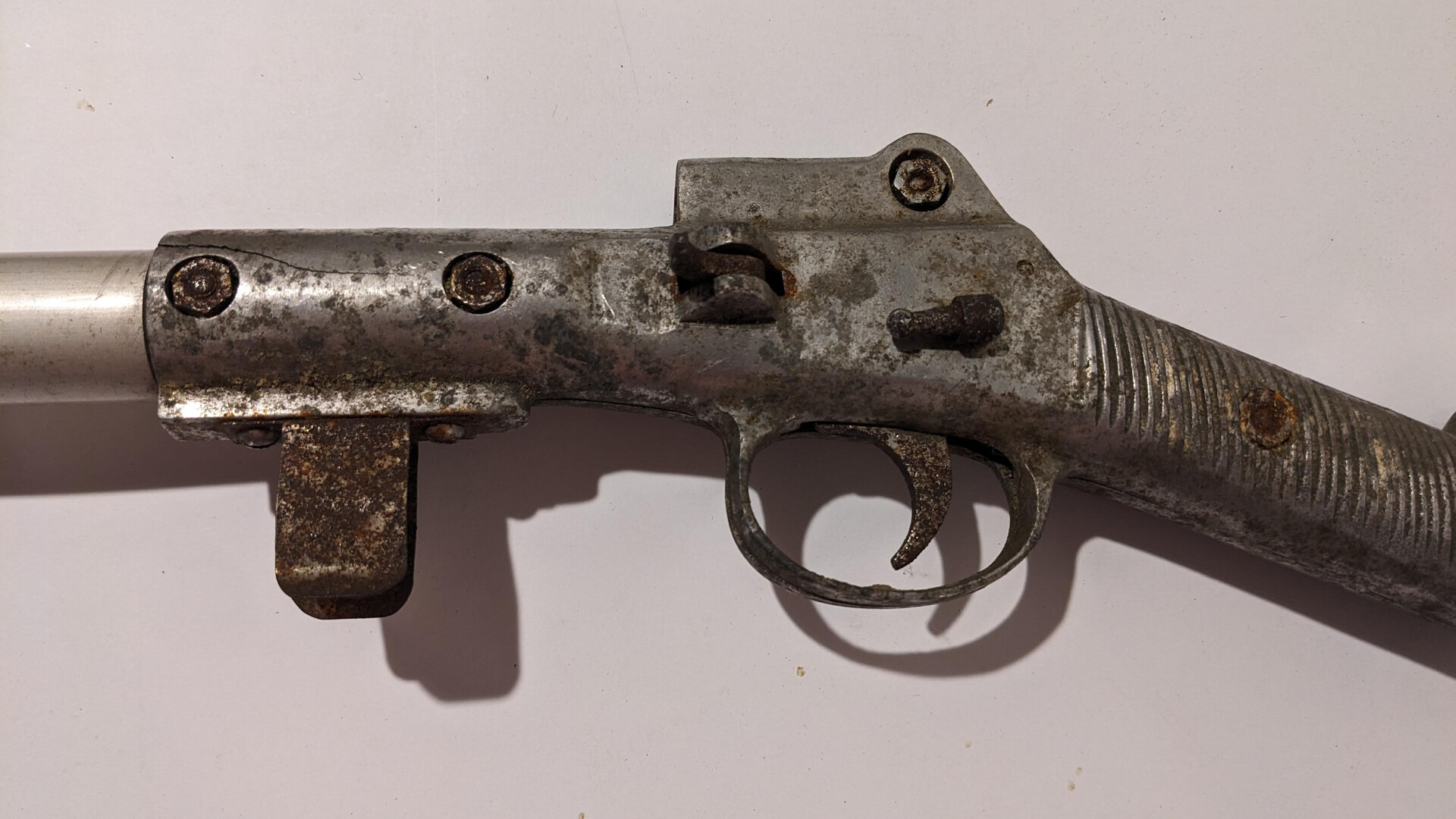 This speargun was used. The condition is bad. It is selling as not working for collection.The body has scratches, rust spots, lost of paint, small damages and cracks. The rubber tubes are not usable. The lever is missing. The trigger system is working.
