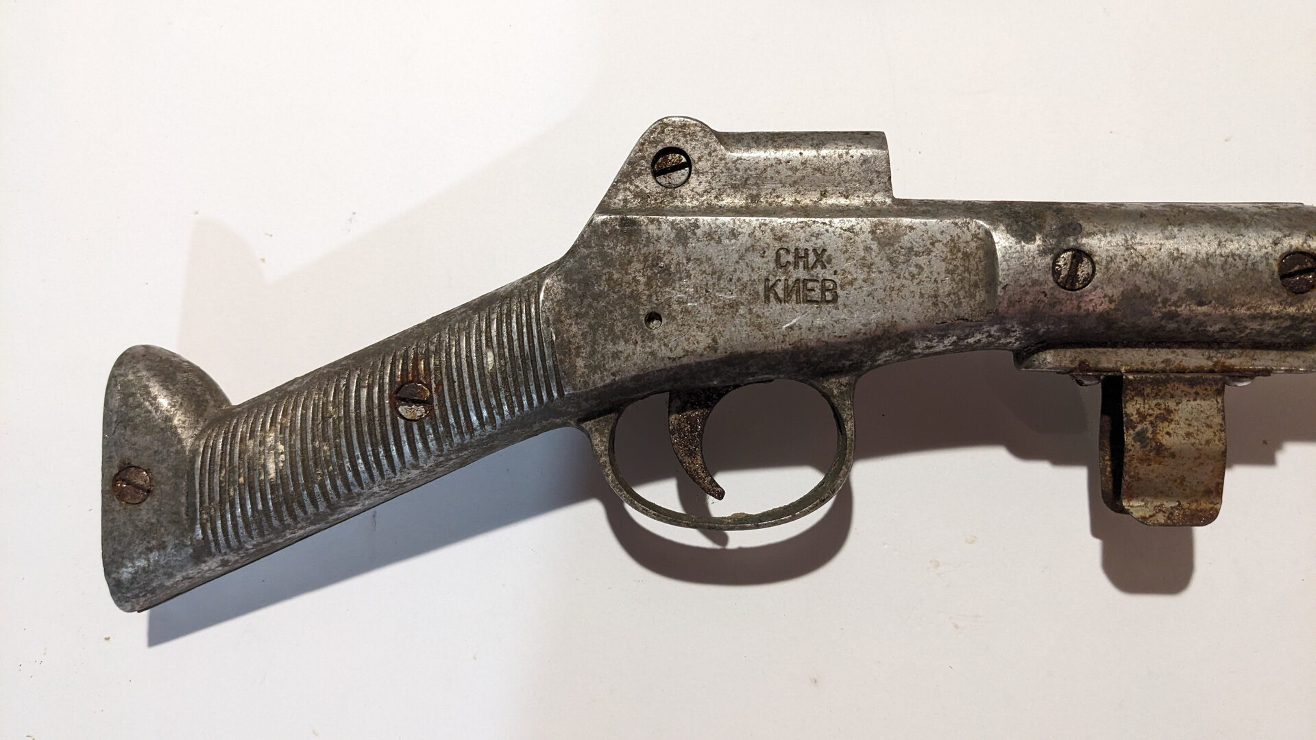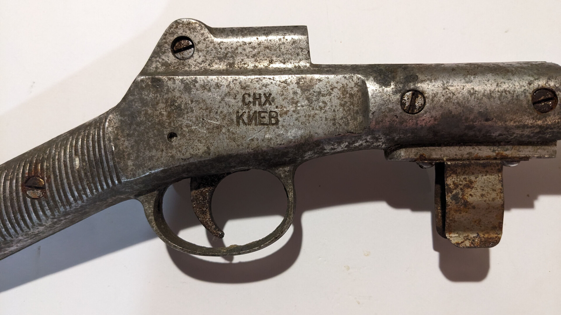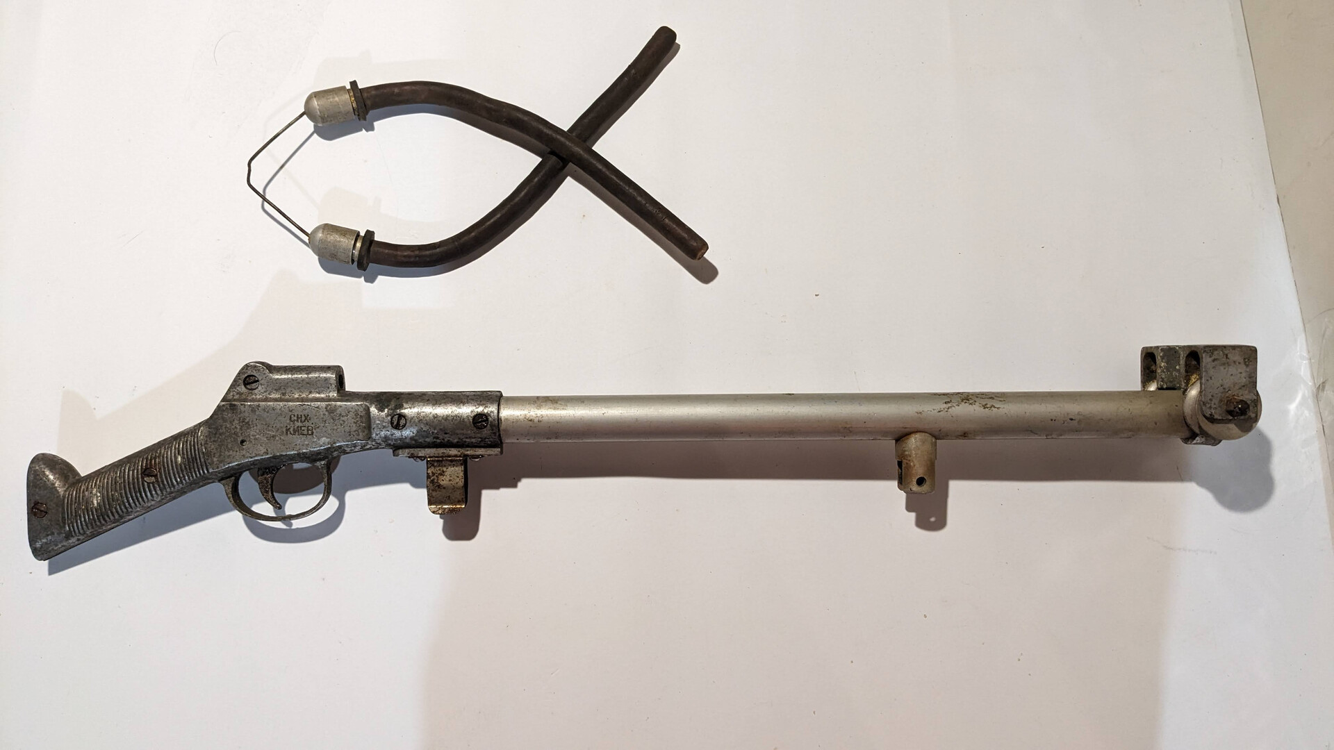 Dear buyers, I want to offer for you an original soviet roller speargun Kiev SNE (Киев СНХ) that was one of the first models of diving rollergun in the USSR. This speargun has roller loaded system. It was produced at “Antonov” plant in Kiev in circa 1956-60 in the order of Kiev SNE (Soviet National Economy). The speargun has stamp marks of name of the plant.