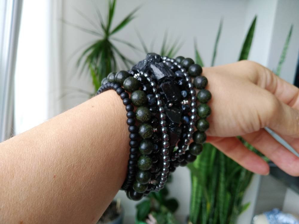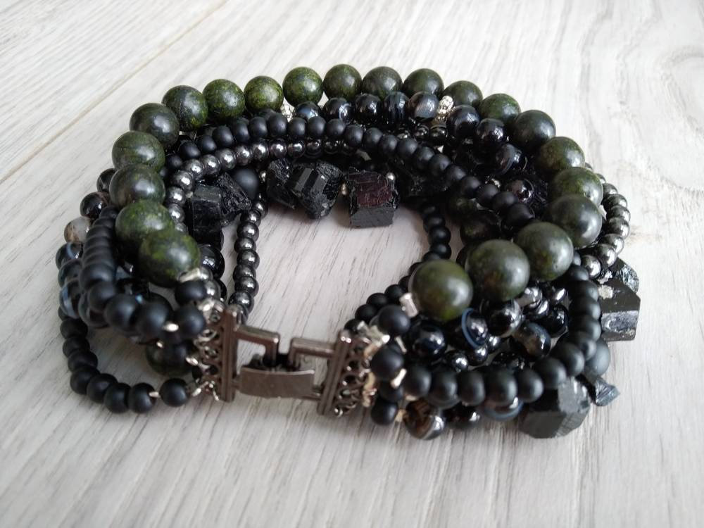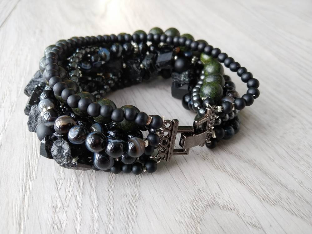 Magnificent bracelet of natural black agate, shungite, black tourmaline raw, hematite. serpentine.