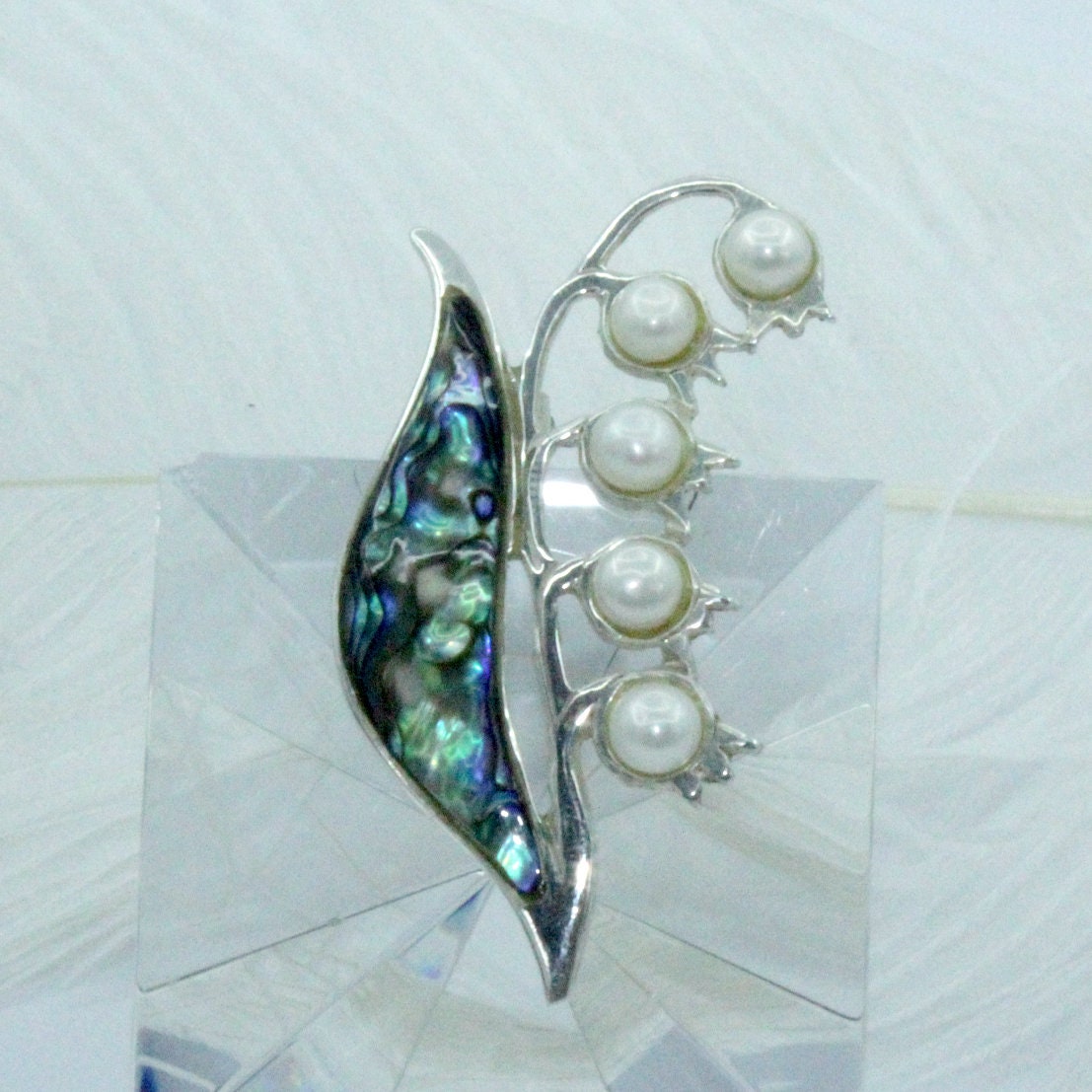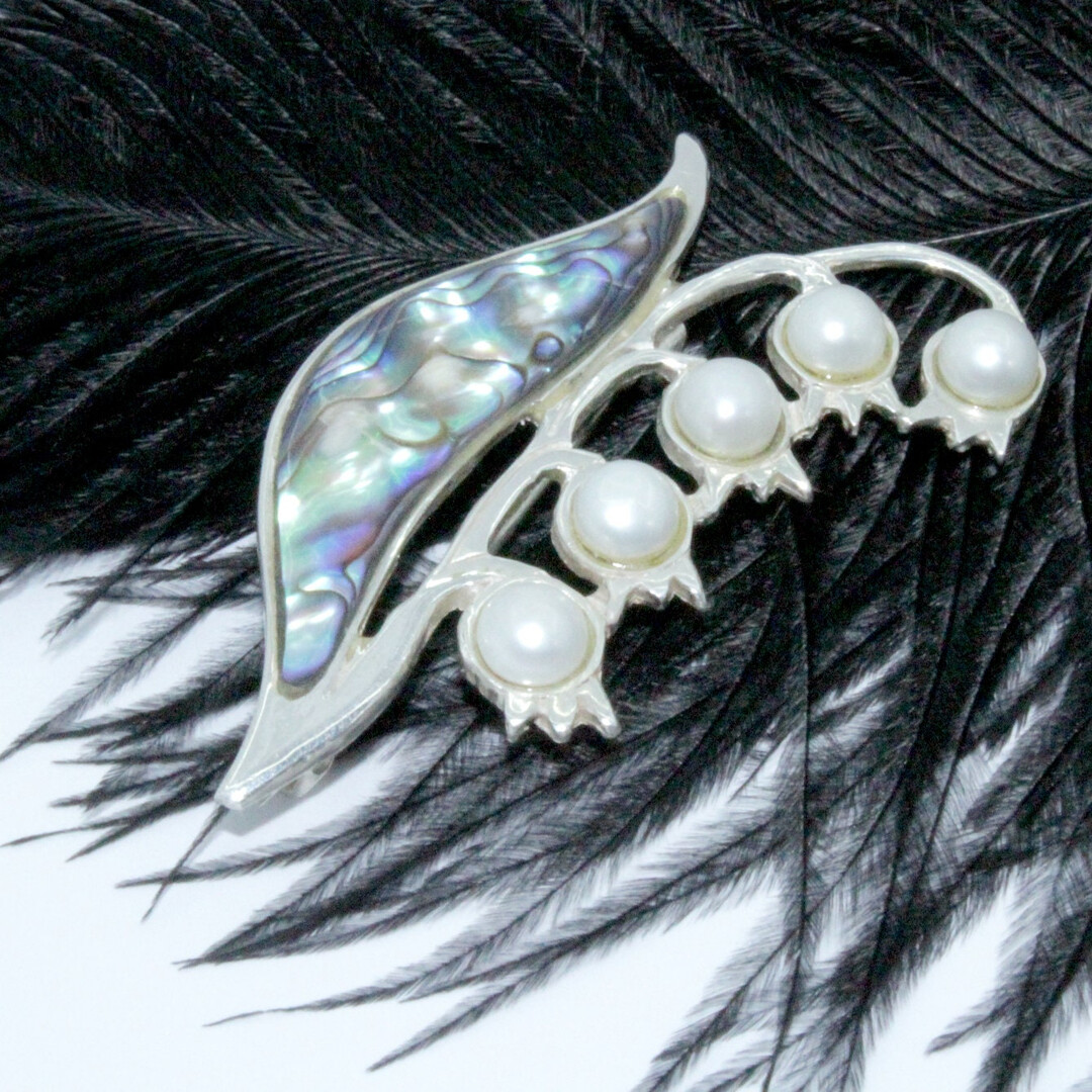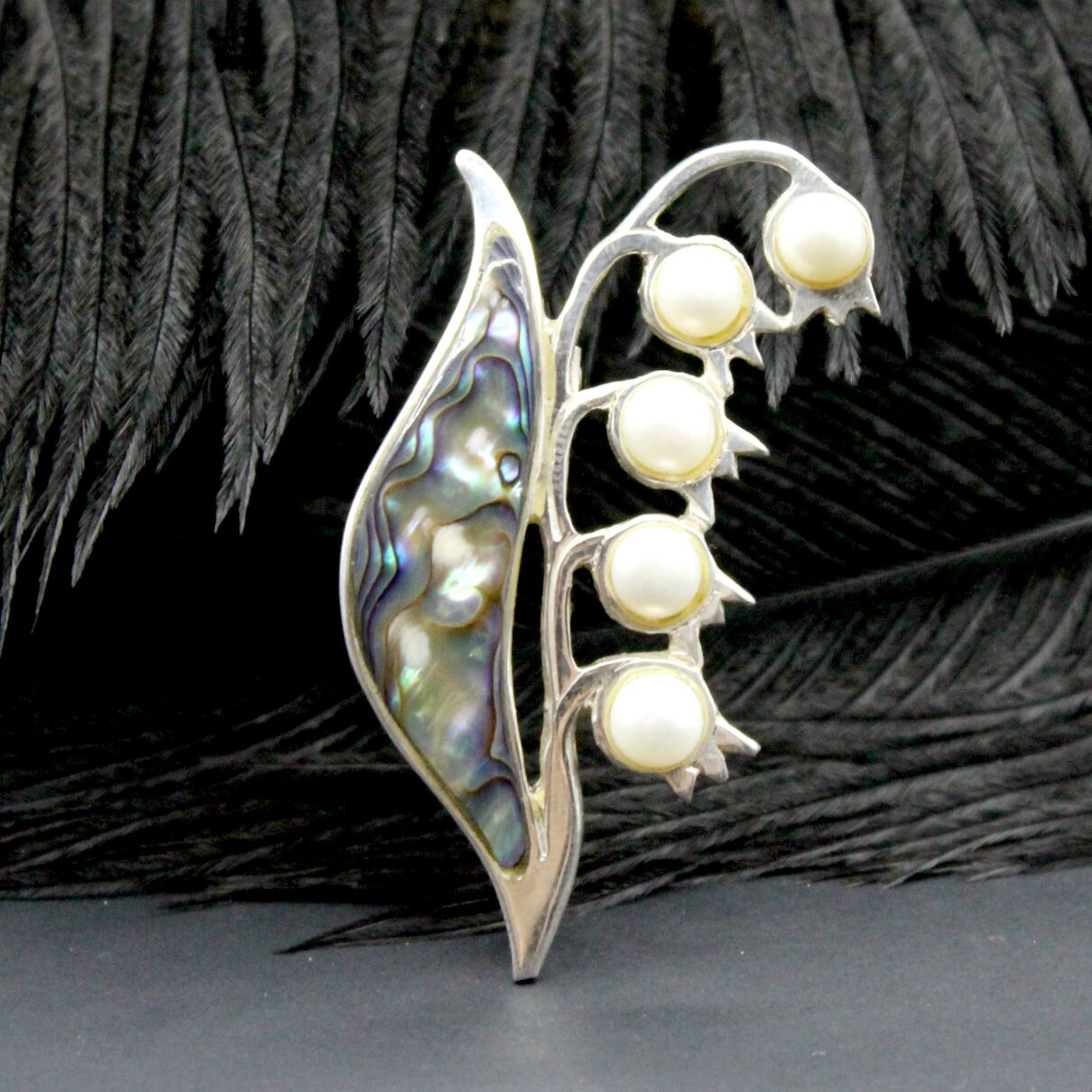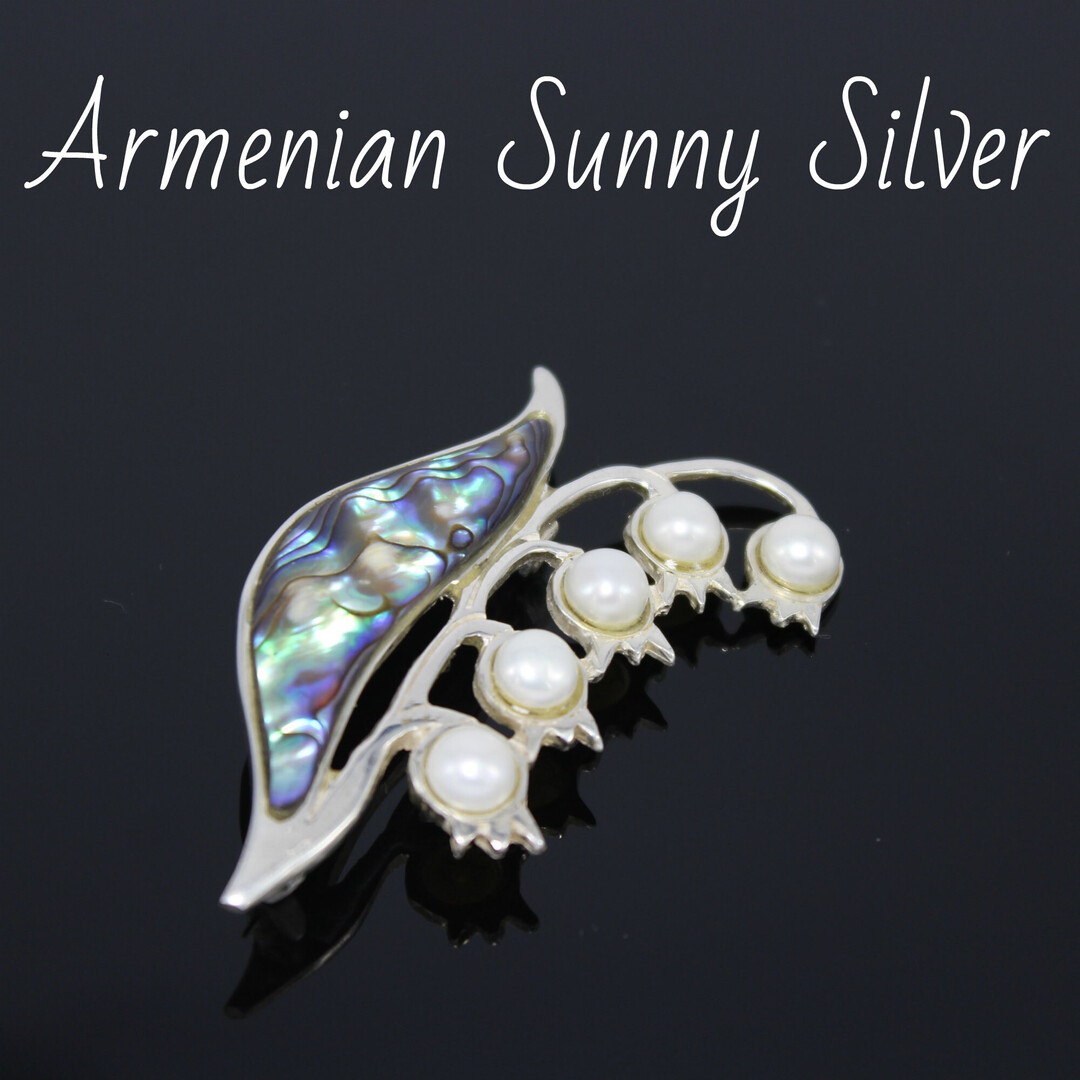 Lily Of The Valley Floral Pearl Silver Brooch Pin Jewelry, Birth Flower Custom Rolling Enamel Mother Of Pearl Beads Armenian Jewelry