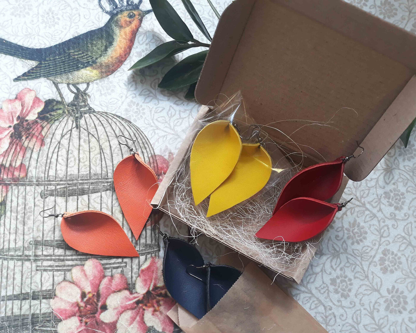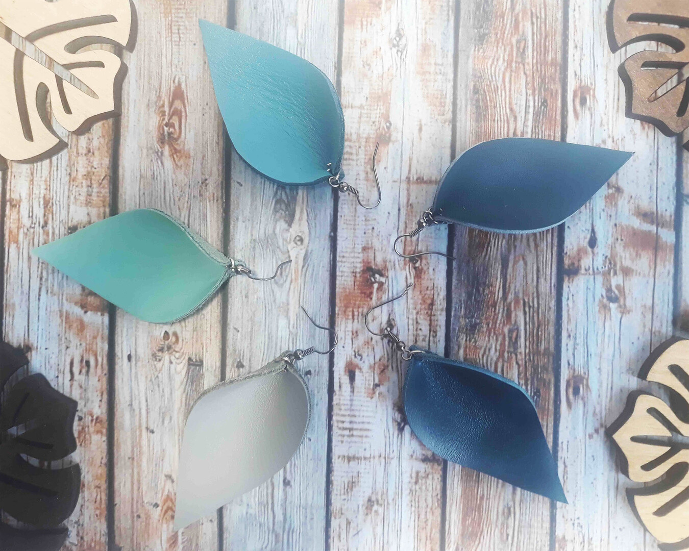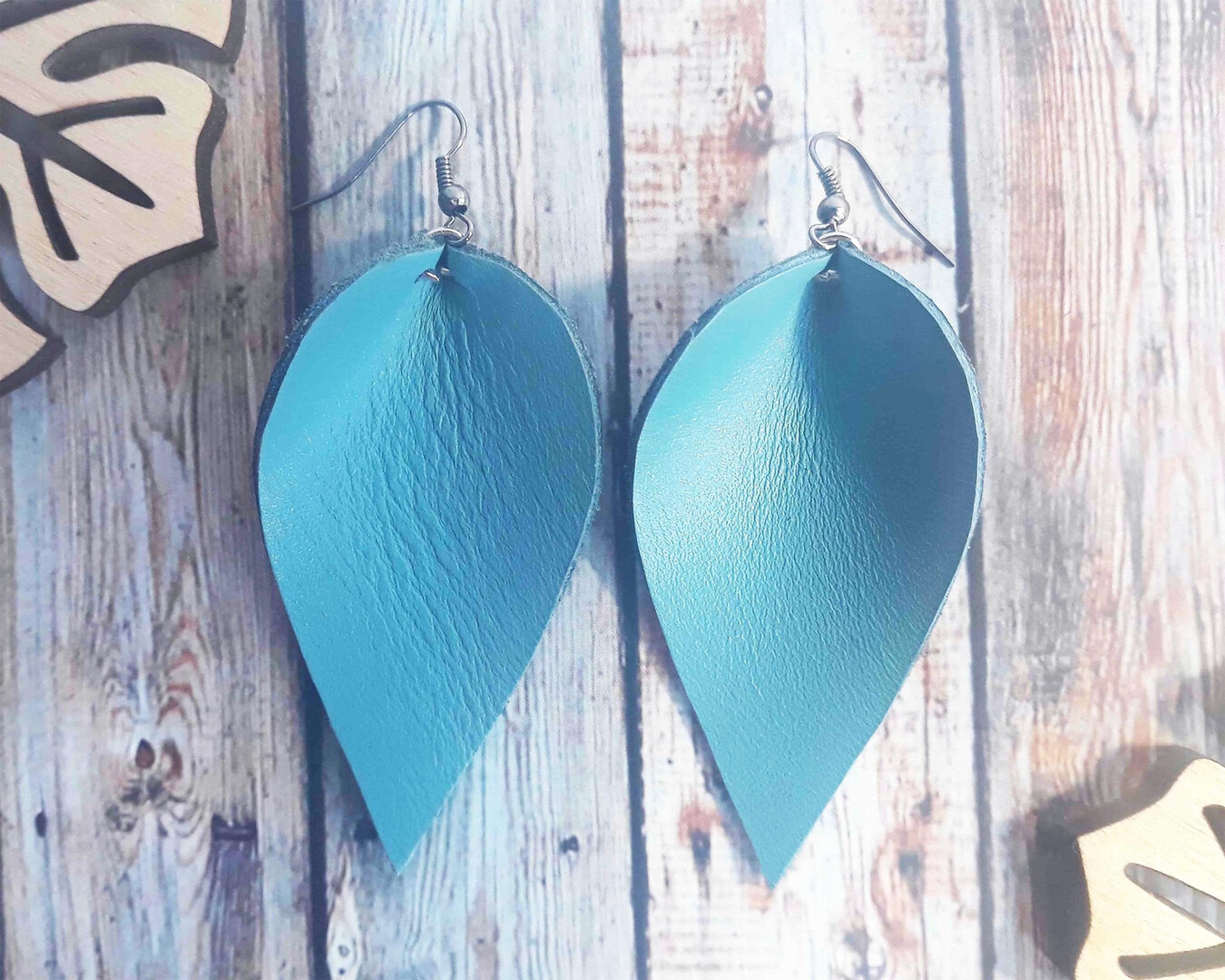 Cyan Leather Leaf Earrings Light Blue Dangle Earrings Vacation Leather Earrings Sea Color Leaf Earrings Boho Earrings Blue Marine Petal