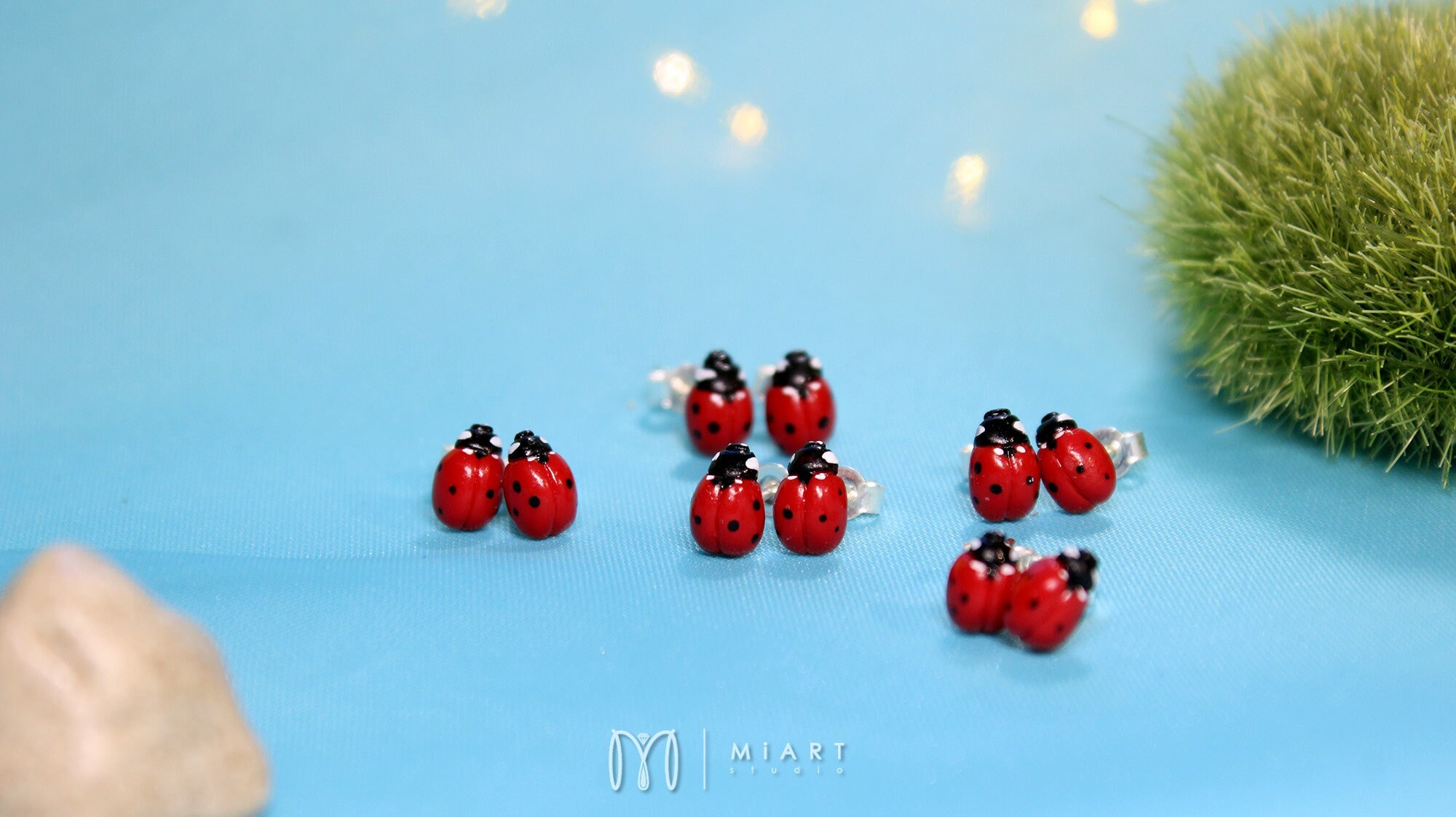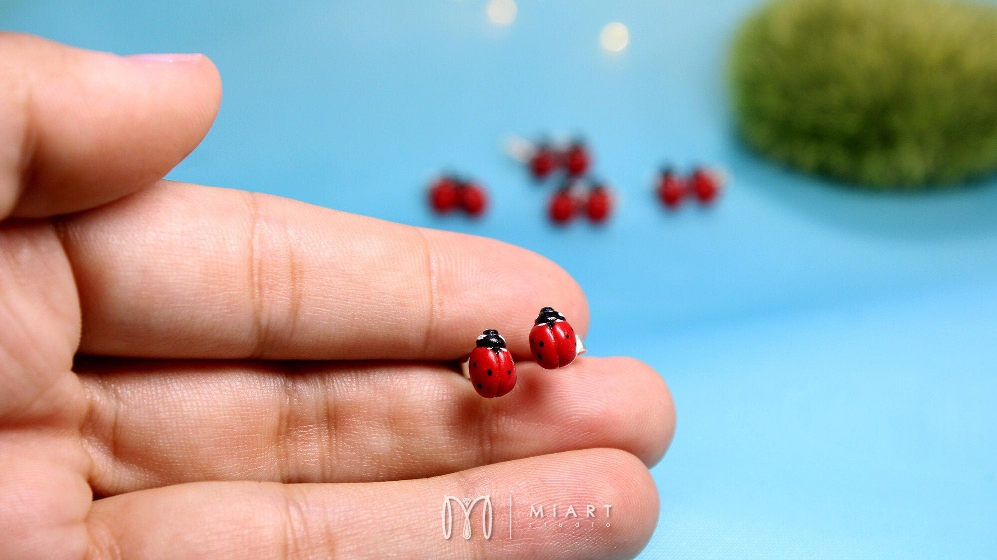 The small, realistic ladybug earrings are handmade in polymer clay.