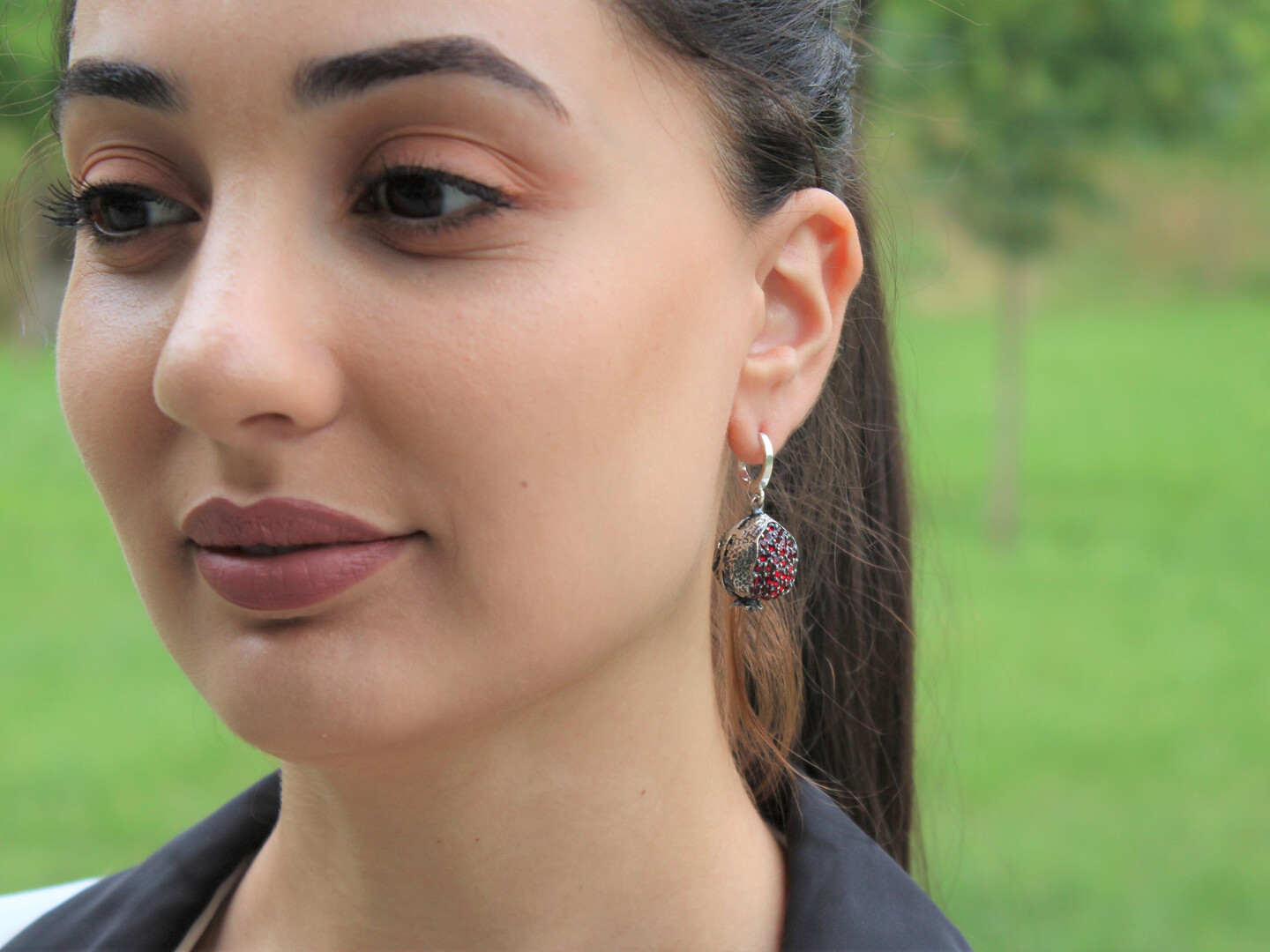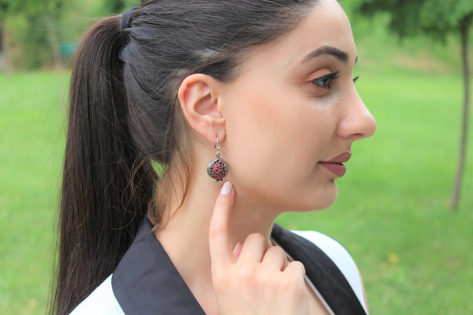 Persephone Pomegranate Fruit Sterling Silver Dangle Earrings, Red Zircon Dangling Drop Garnet Dainty Earrings, Armenian Gift Jewelry