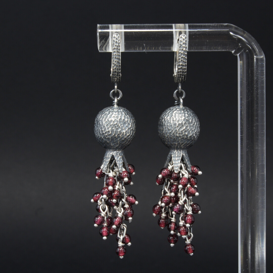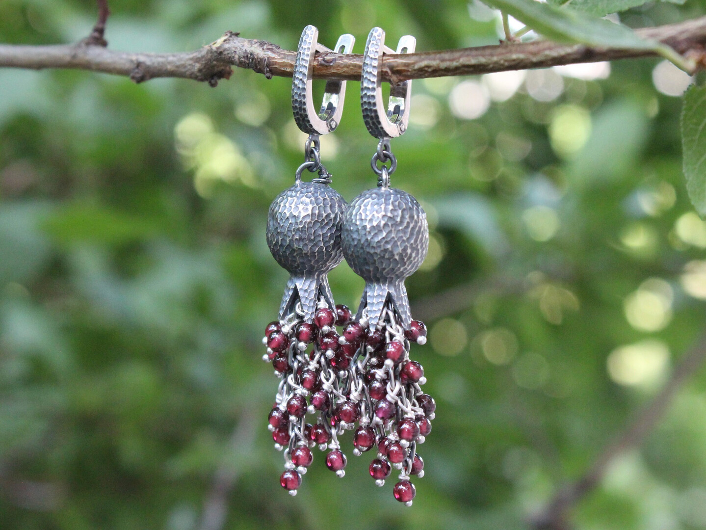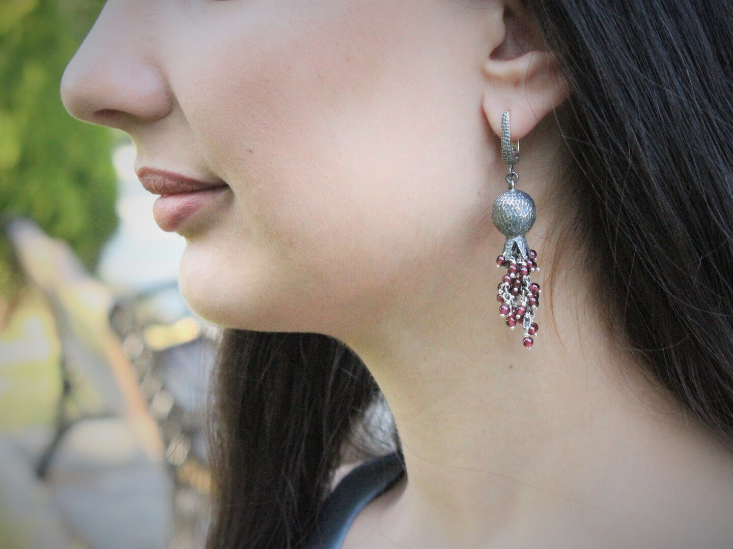 Pomegranate Sterling Silver Garnet Dangle Persephone Earrings, Fruit Drop Silver Earrings, Armenian Jewelry