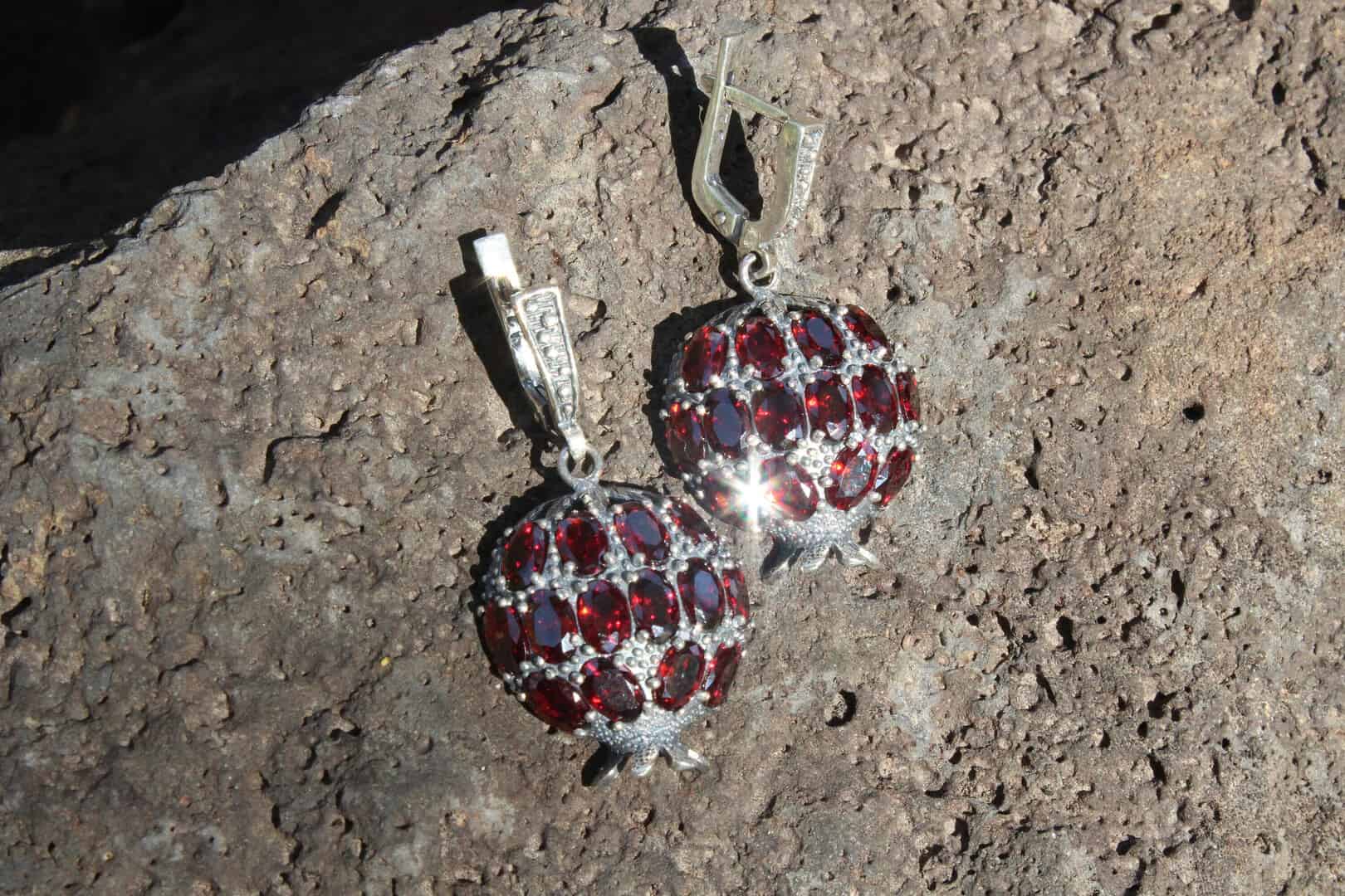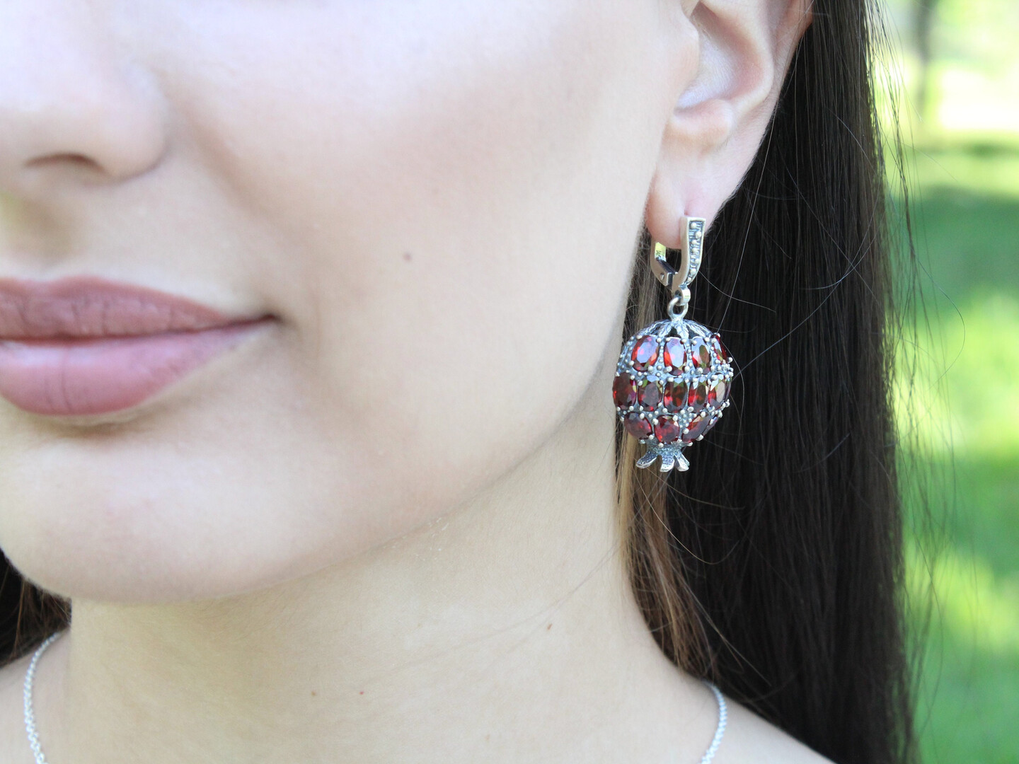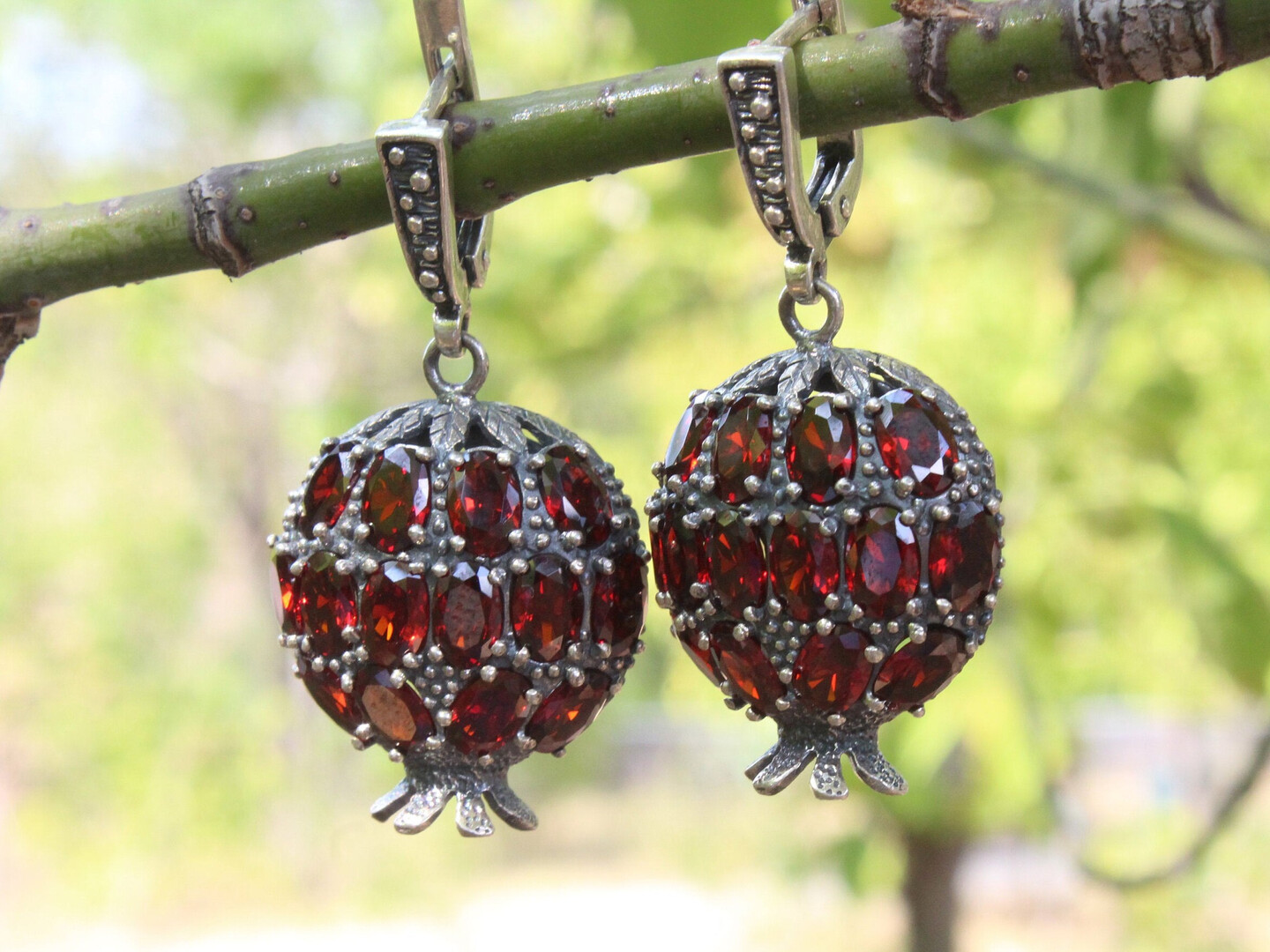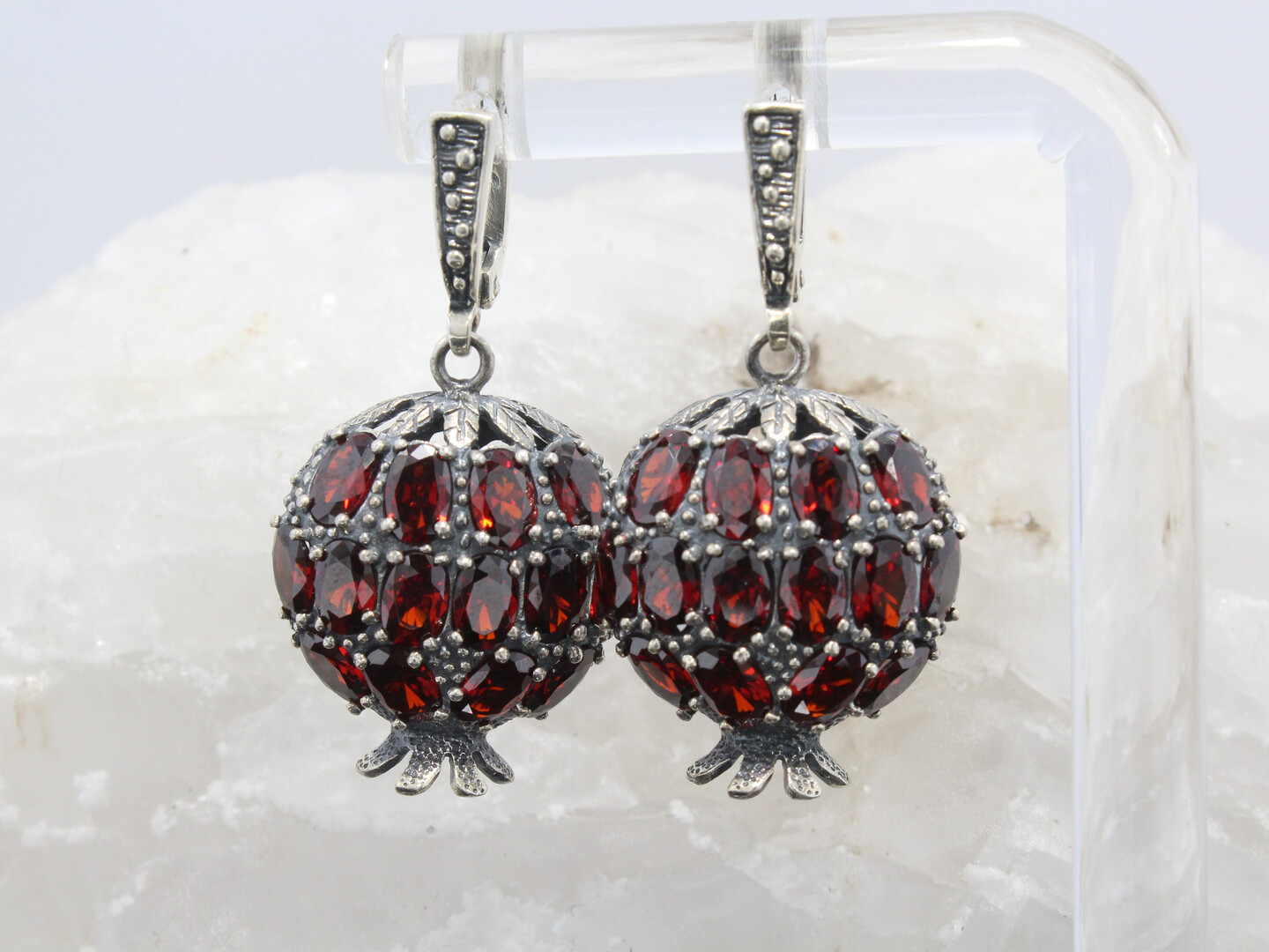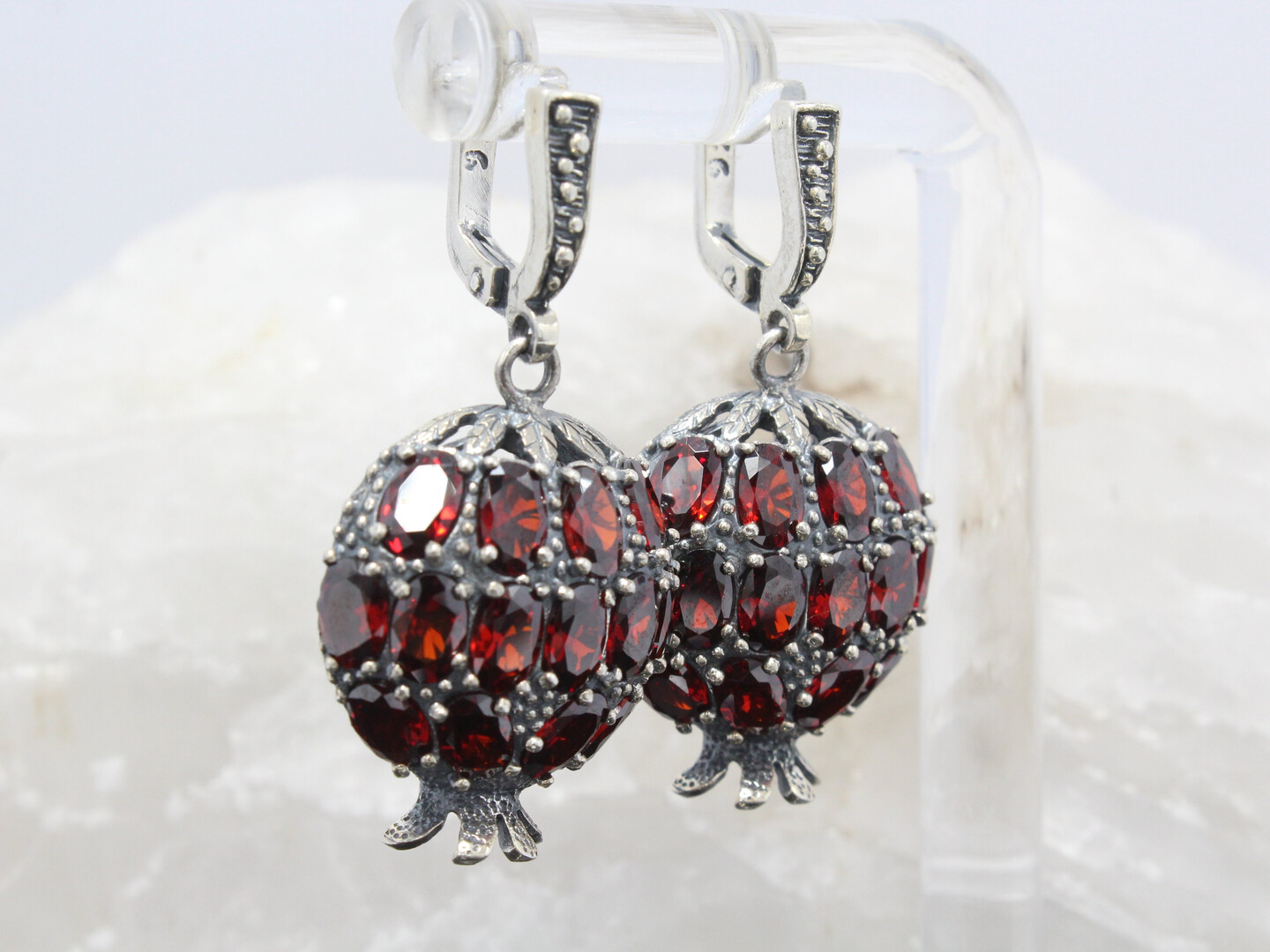 Pomegranate Sterling Silver Garnet Dangle Persephone Earrings, Fruit Drop Silver Earrings, Armenian Jewelry