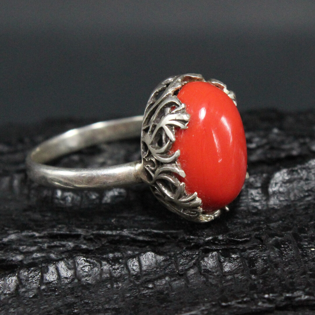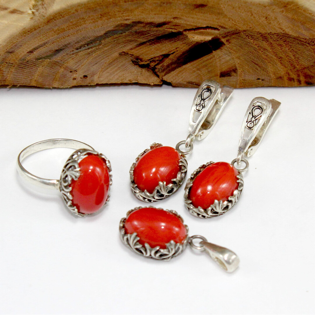 Coral Silver Dangle Earrings Ring And Pendant - Sterling Silver Dainty Jewelry Set, Red Coral Jewelry, Gift For Her, Armenian Silver