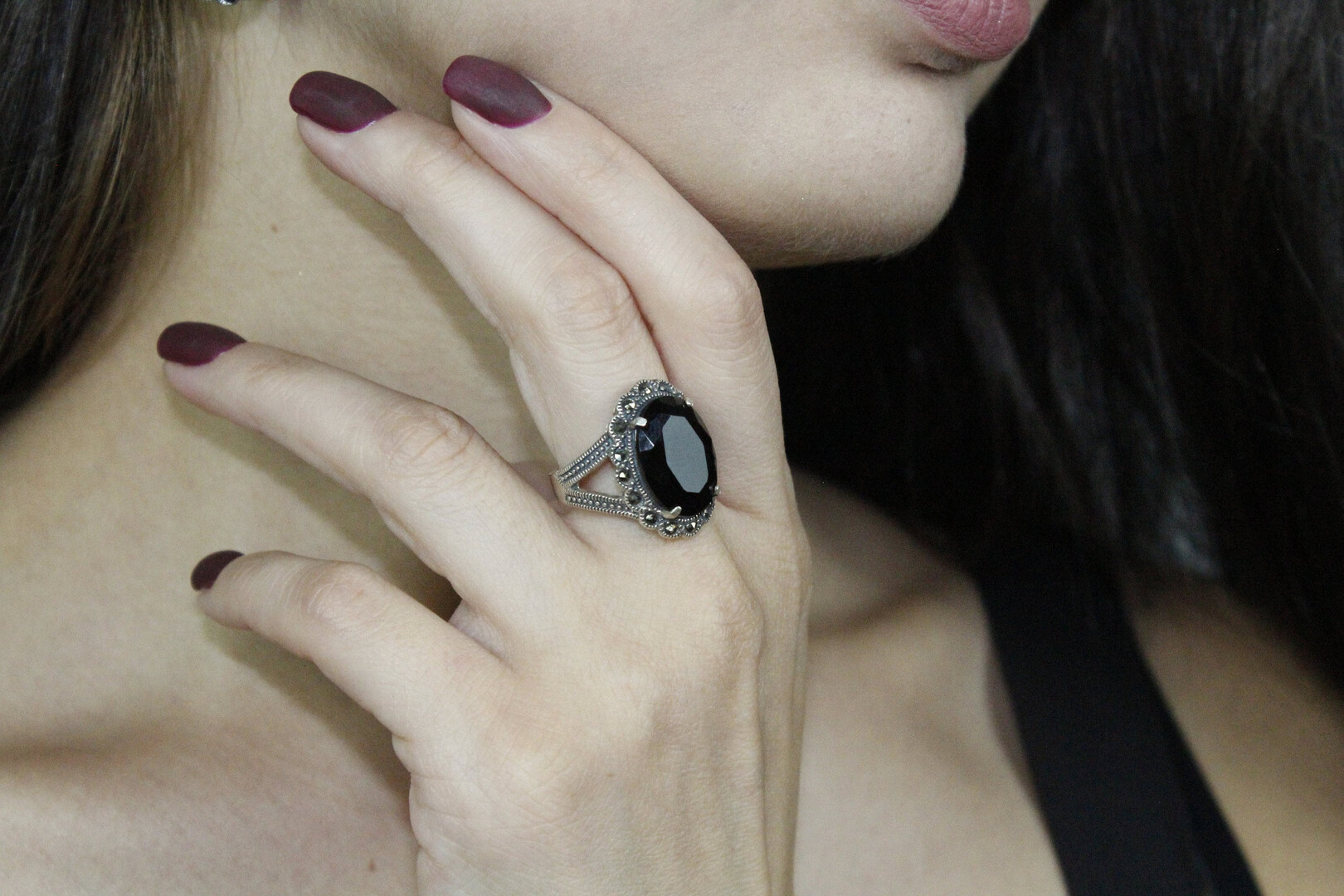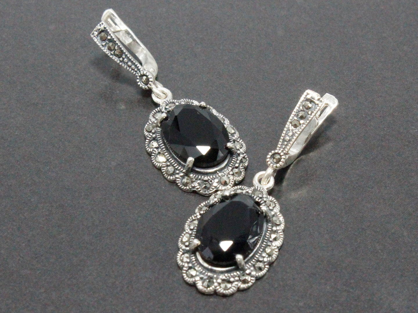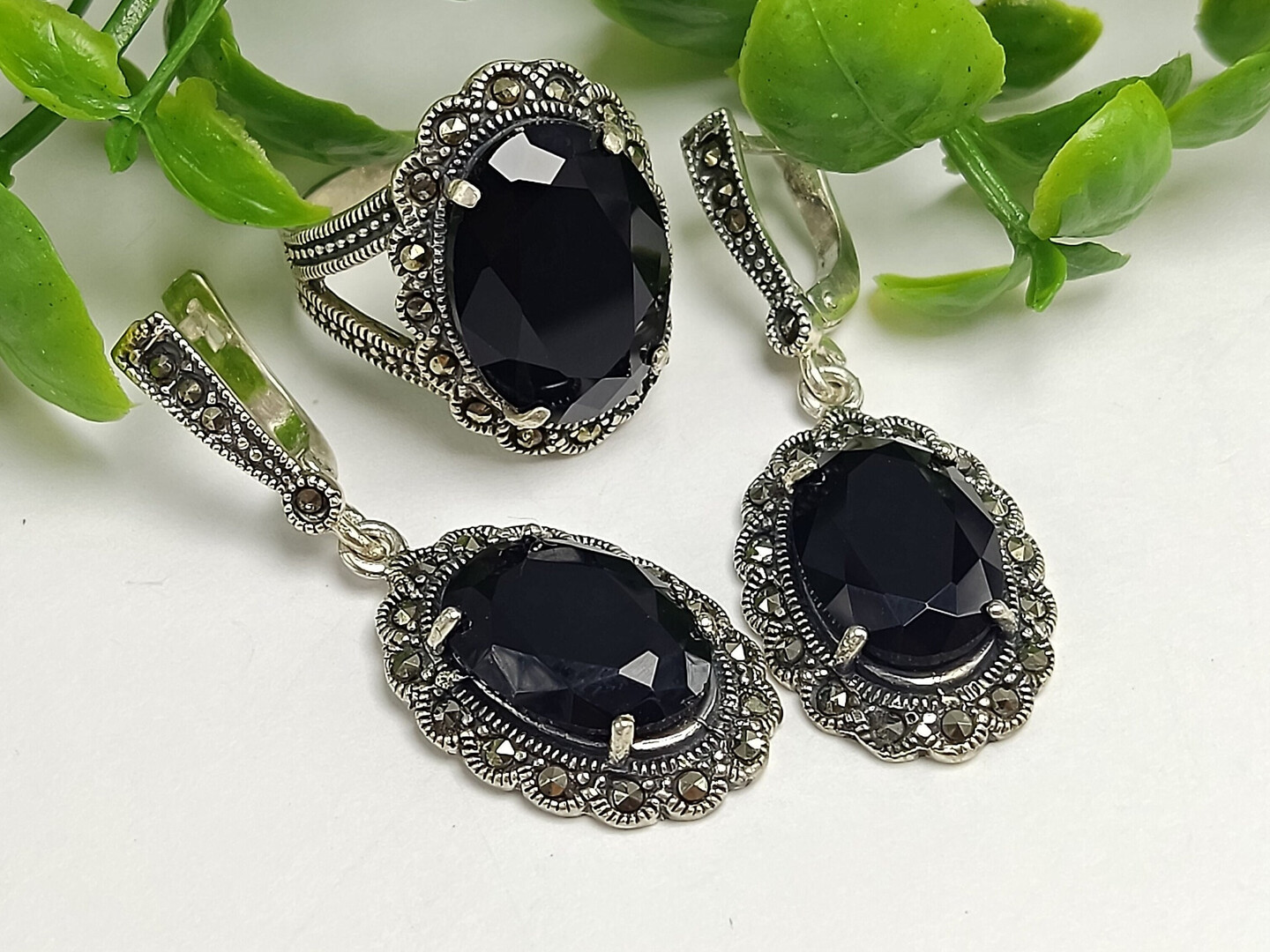 Marcasite Black Oval Stone Marquis Ring Long Dangle Earrings, 925 Sterling Silver Long Drop Evening Earrings, Dainty Statement Armenian Set