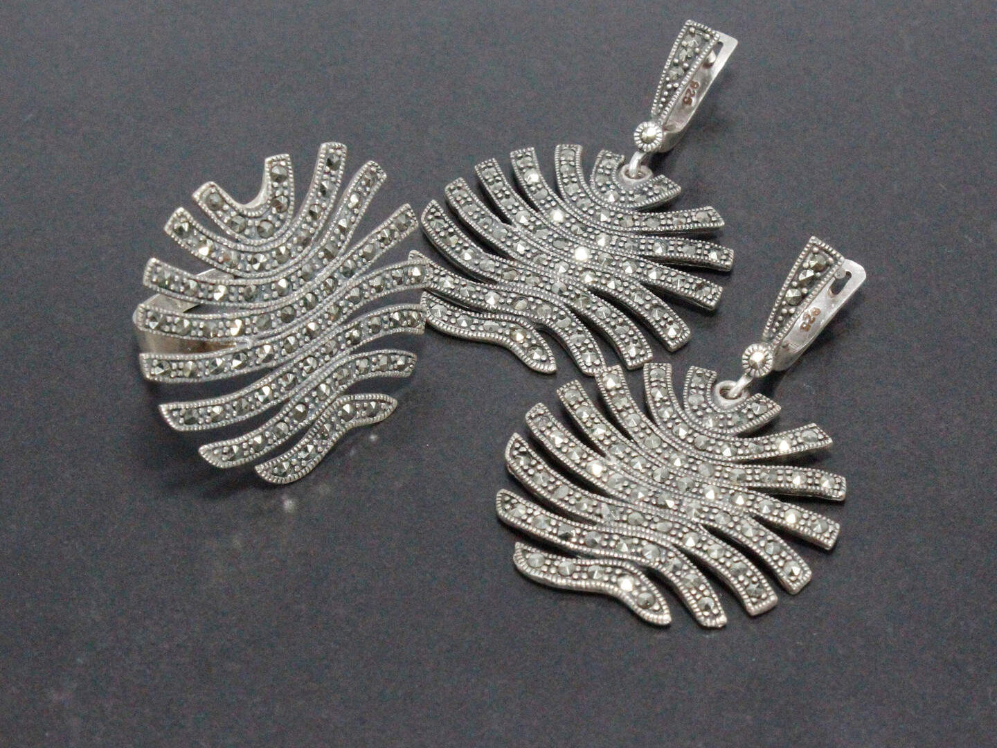 Marcasite Victorian Sun Ring Circle Dangle Evening Earrings, Sterling Silver Long Drop Earrings, Shiny Dainty Homemade Armenian Jewelry Set