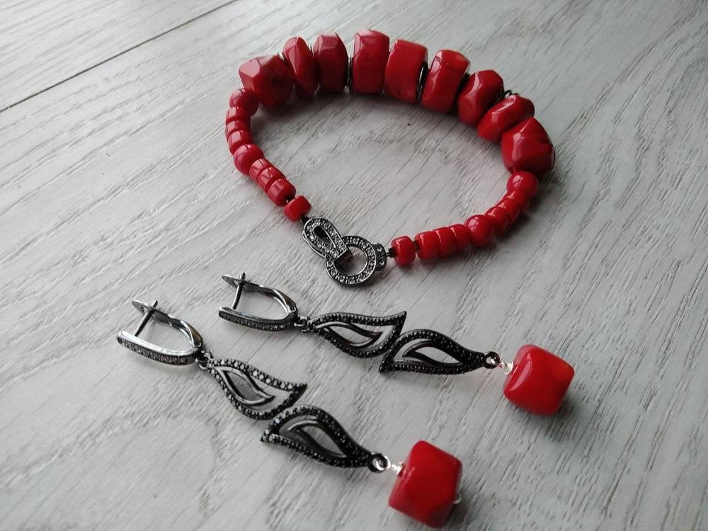 Natural red coral bead bracelet earrings red hot coral beads bracelet Red stone bracelet Red bead bracelet and earrings