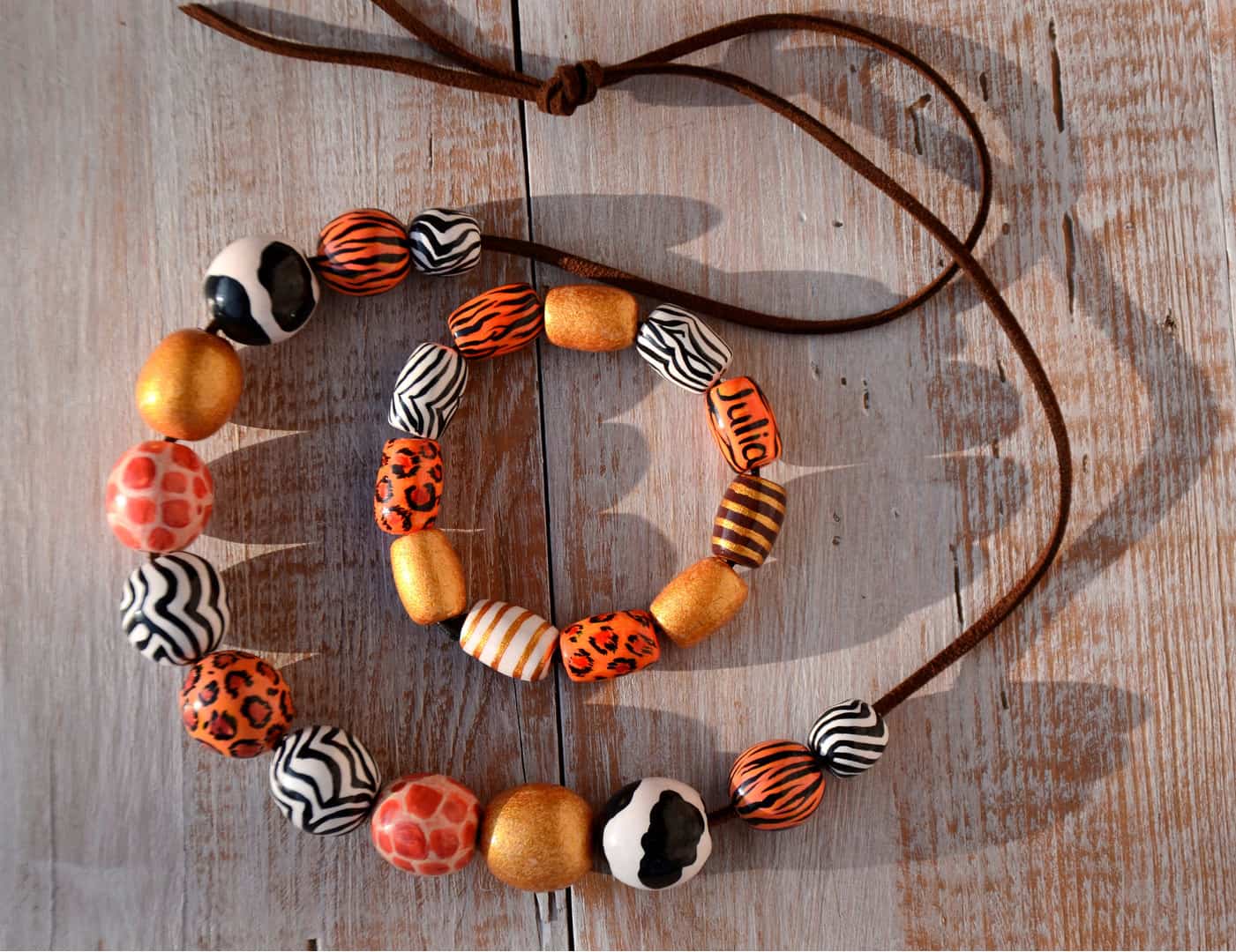 Personalized name bracelet For her/African Animal Safari print/handpainted big bead Stretch Bracelet/Custom gift wooden jewelry SET