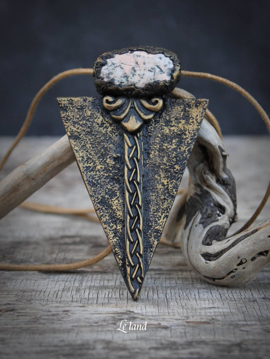 Beautiful pendant in art Deco, made of polymer clay. Black and antique gold color combination. Pendant decorated with natural sea stone. The pendant weighs on a waxed cord.