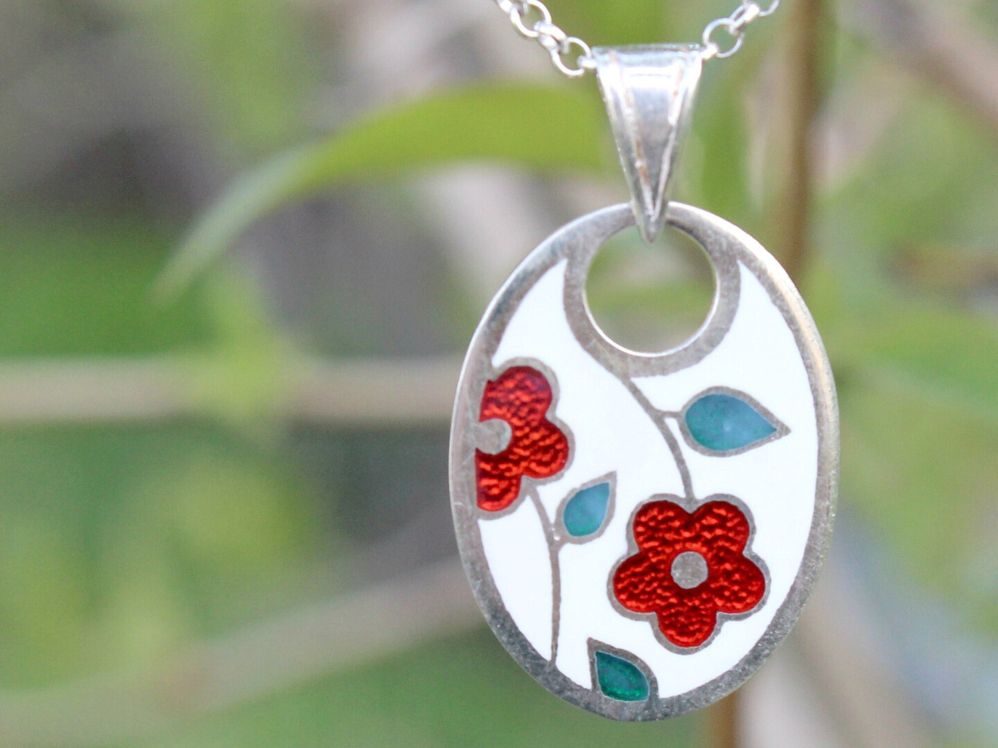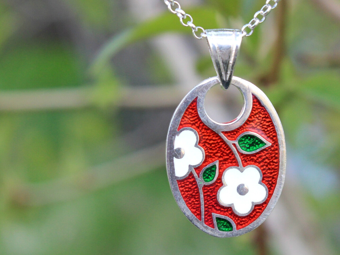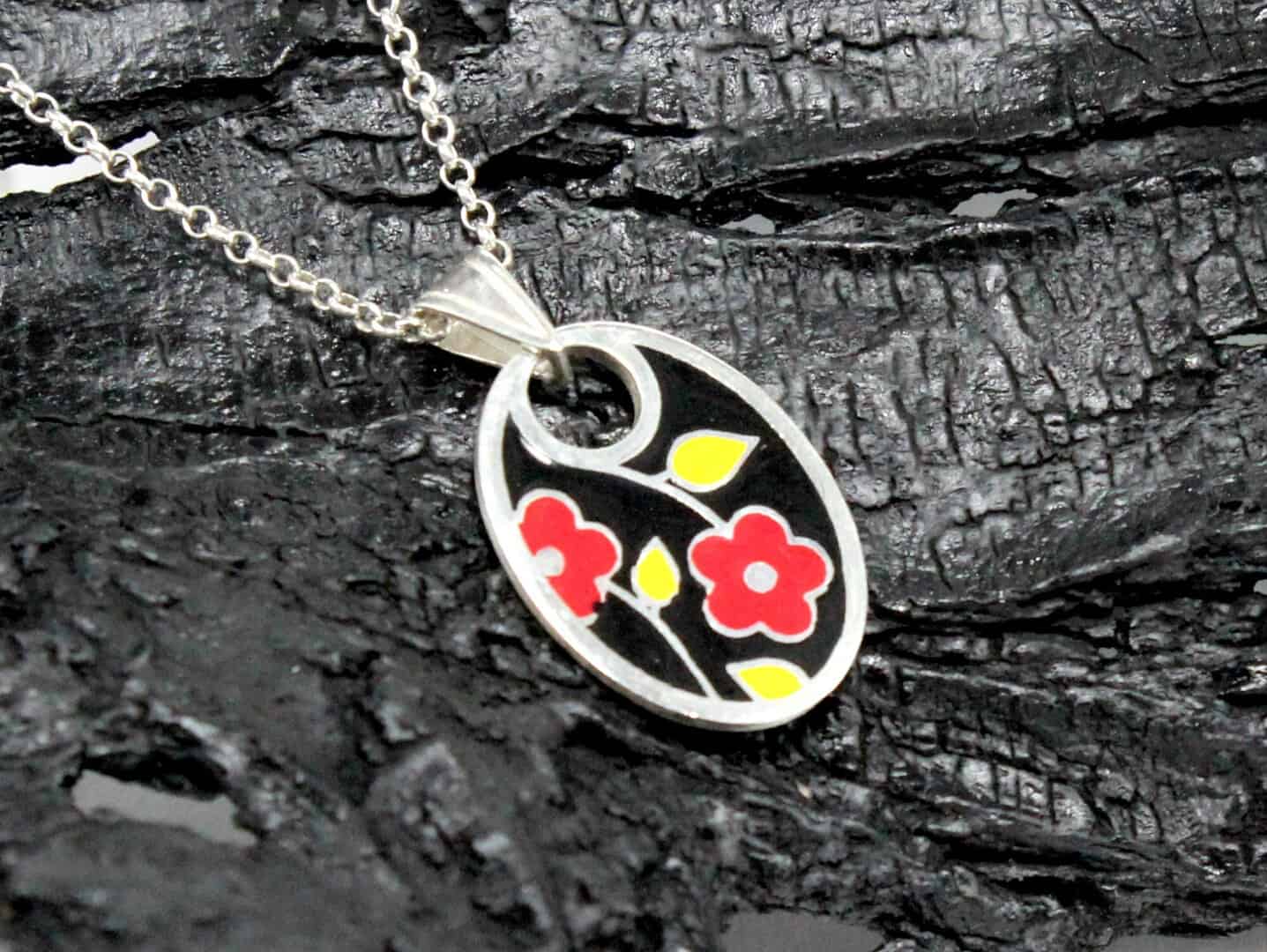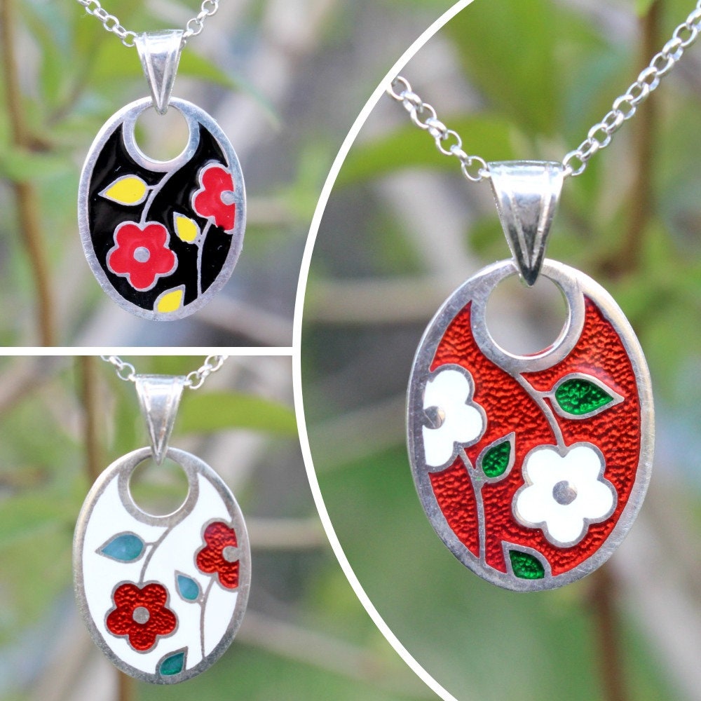Floral Flower Botanical Cloisonne Birth Month Necklace Jewelry, Wildflower Bouquet Oval Chain Pendant, Blossom Black Red White Necklace