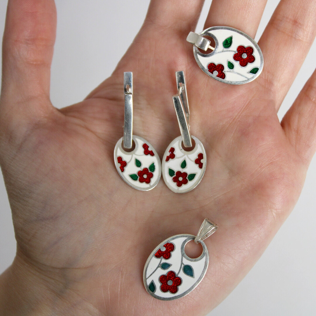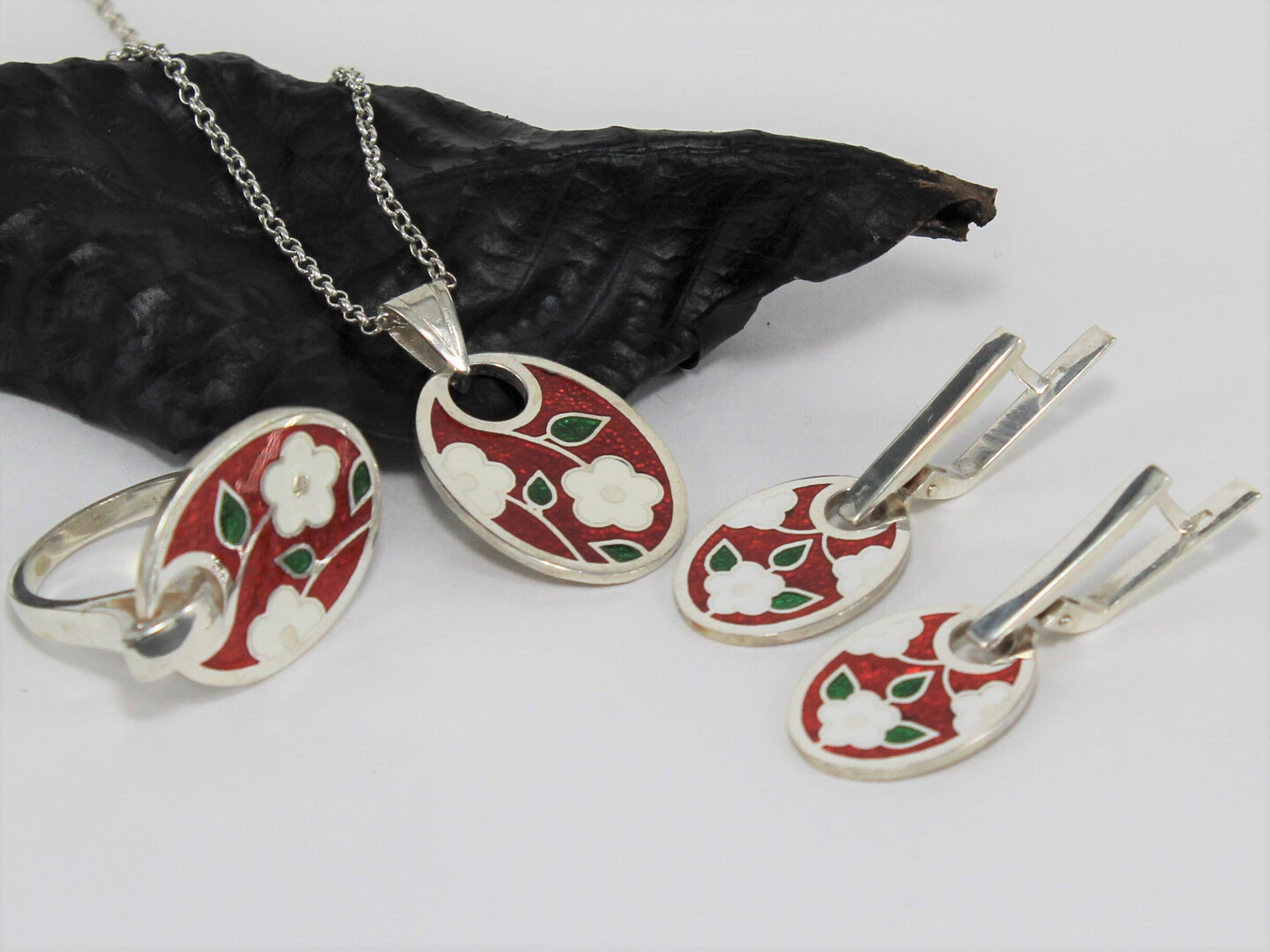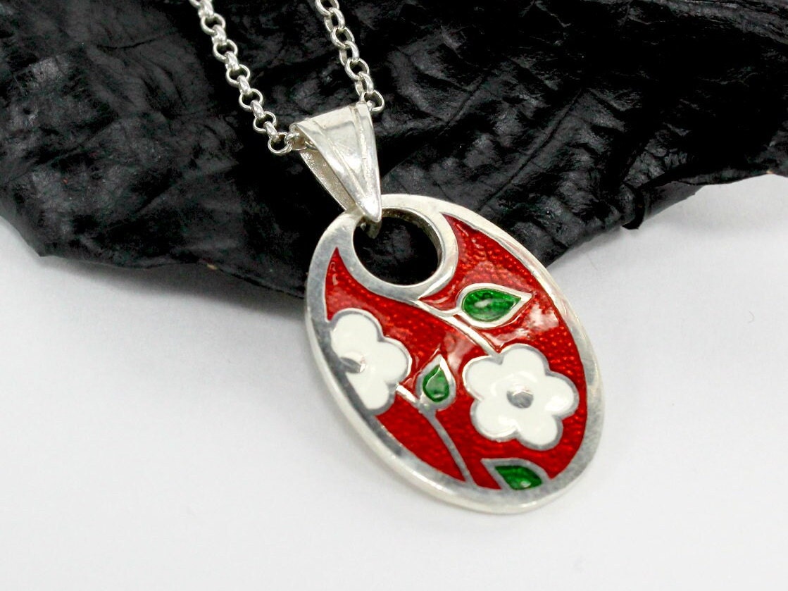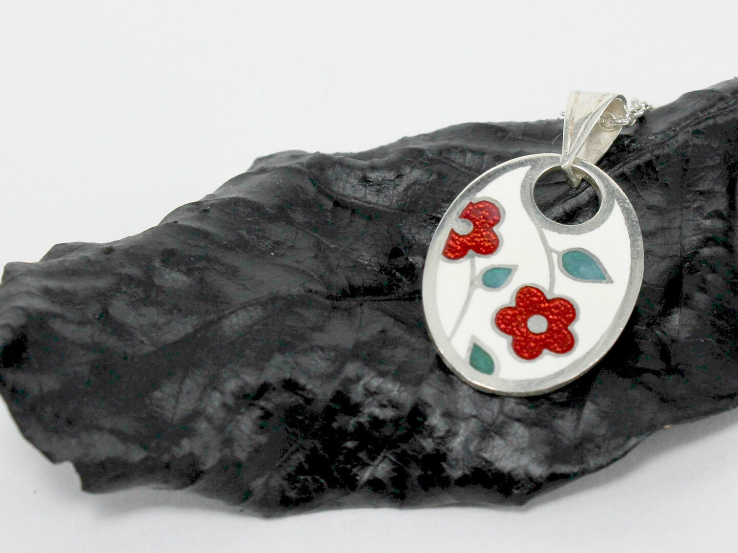 Floral Flower Botanical Cloisonne Birth Month Necklace Jewelry, Wildflower Bouquet Oval Chain Pendant, Blossom Black Red White Necklace