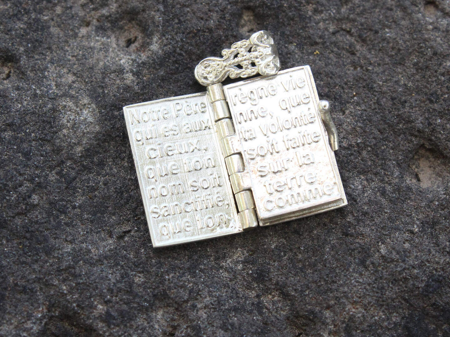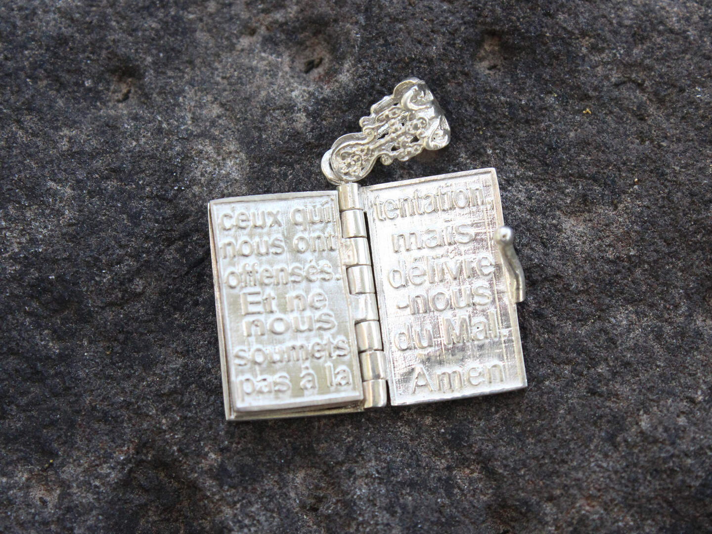 Mini pendentif livre de prière, prière du Seigneur français gravée notre père, livre pendentif en argent sterling 925