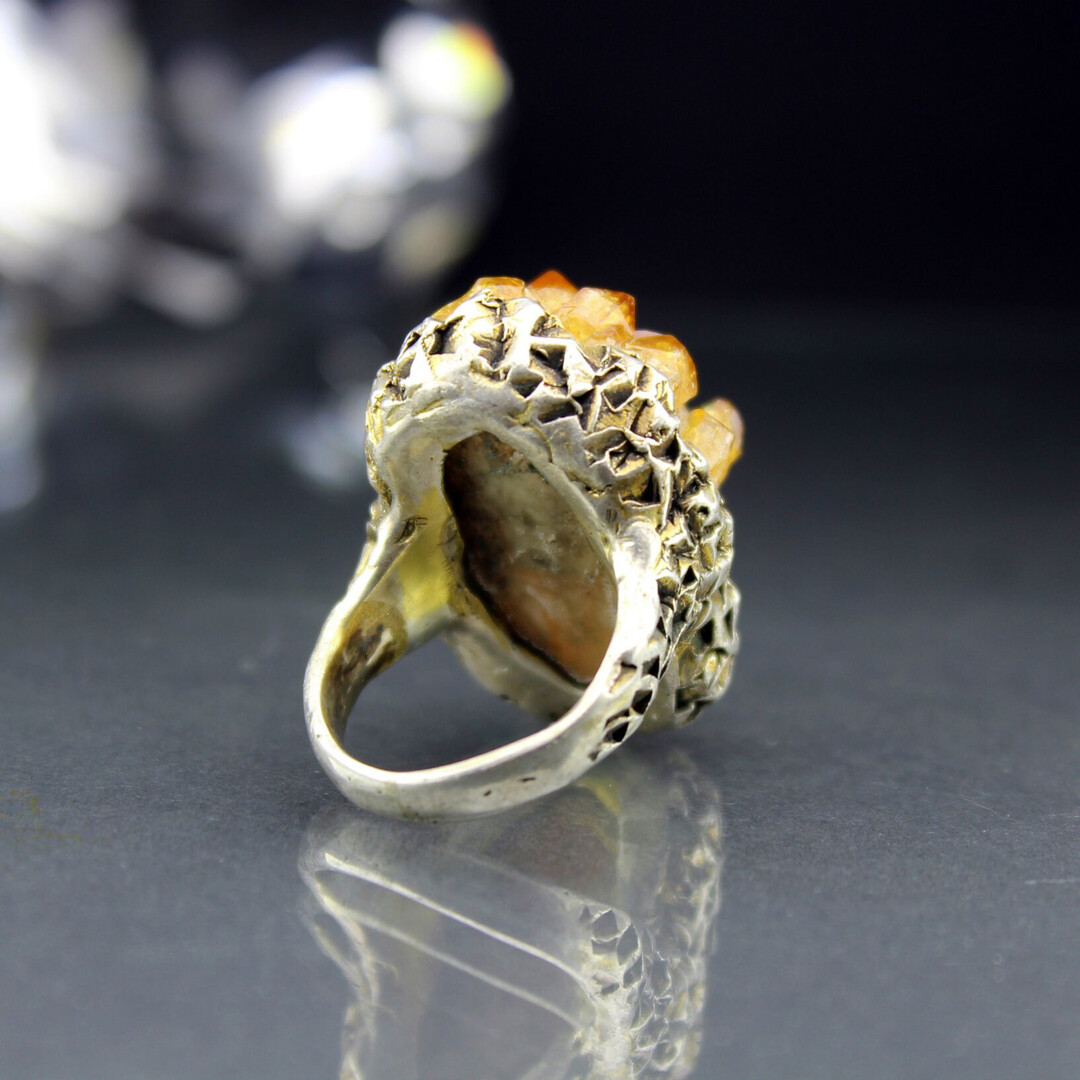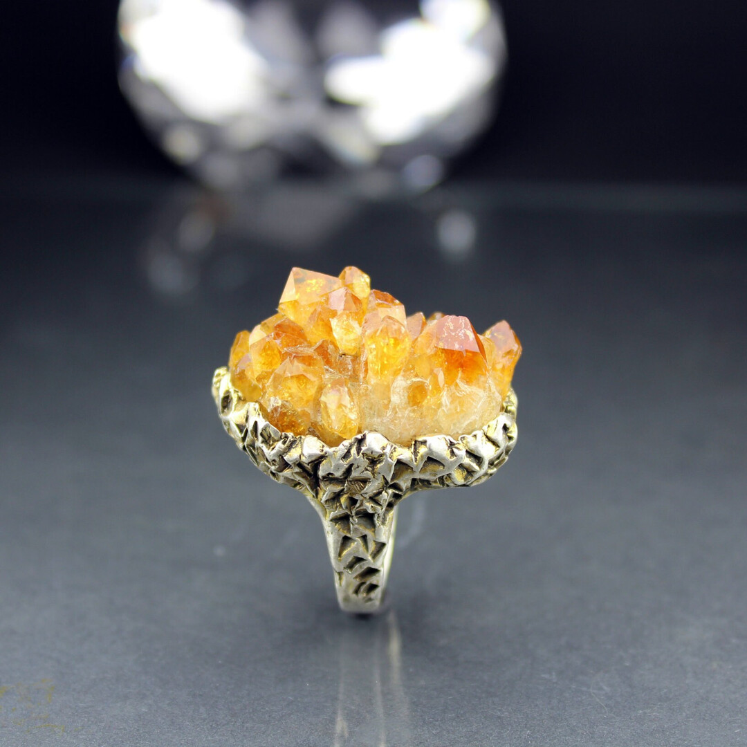 RAW Druzy Citrine Crystal Sterling Silver Oval Gemstone Ring, Statement Cocktail Orange Big Stone Ring, Armenian Jewelry