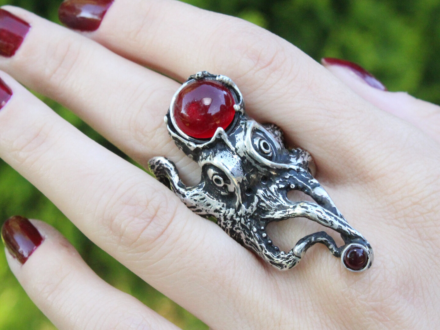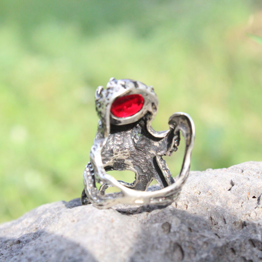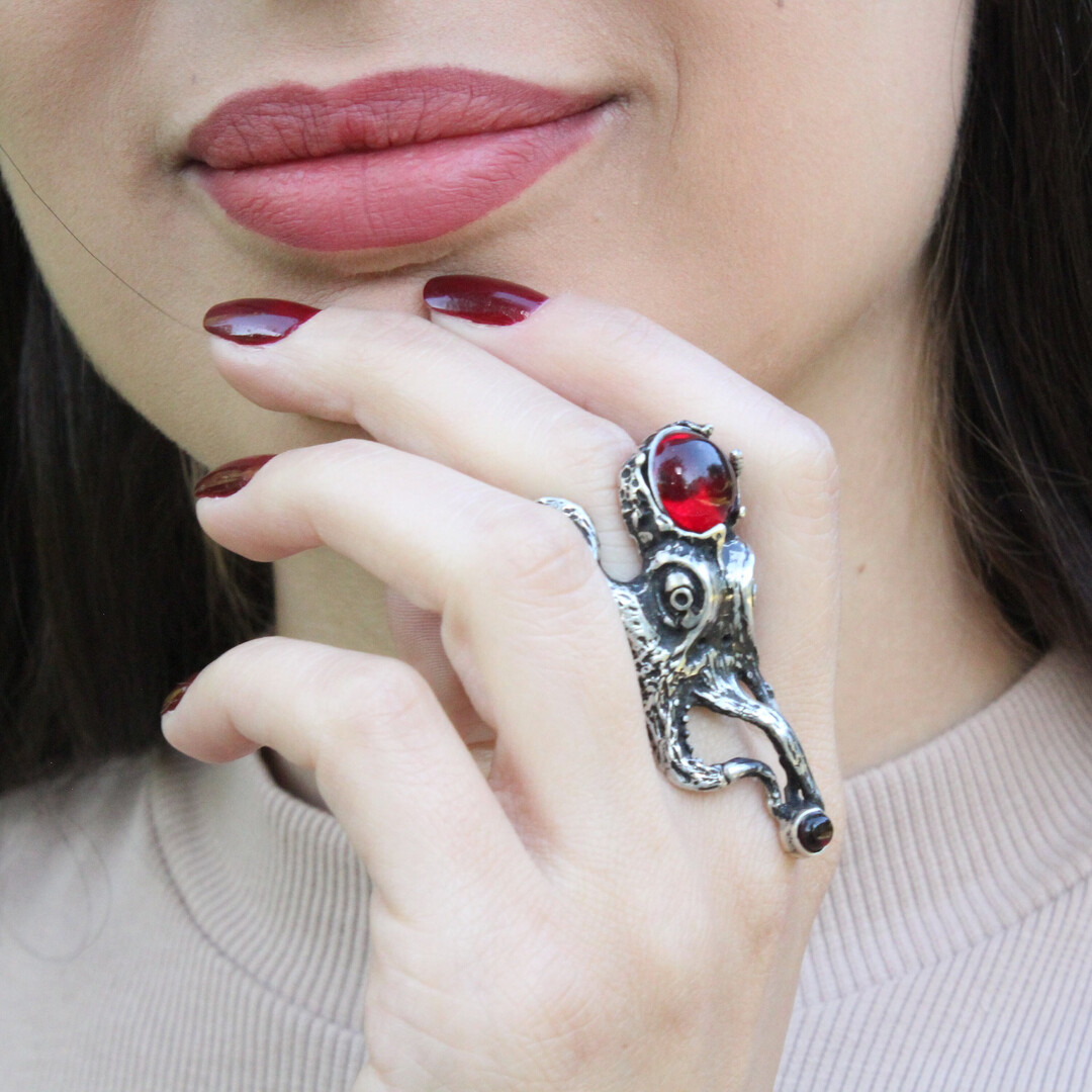 Red Garnet Grunge Avant Garde Sterling Silver Ring, Octopus Garnet Ring, Sterling Silver