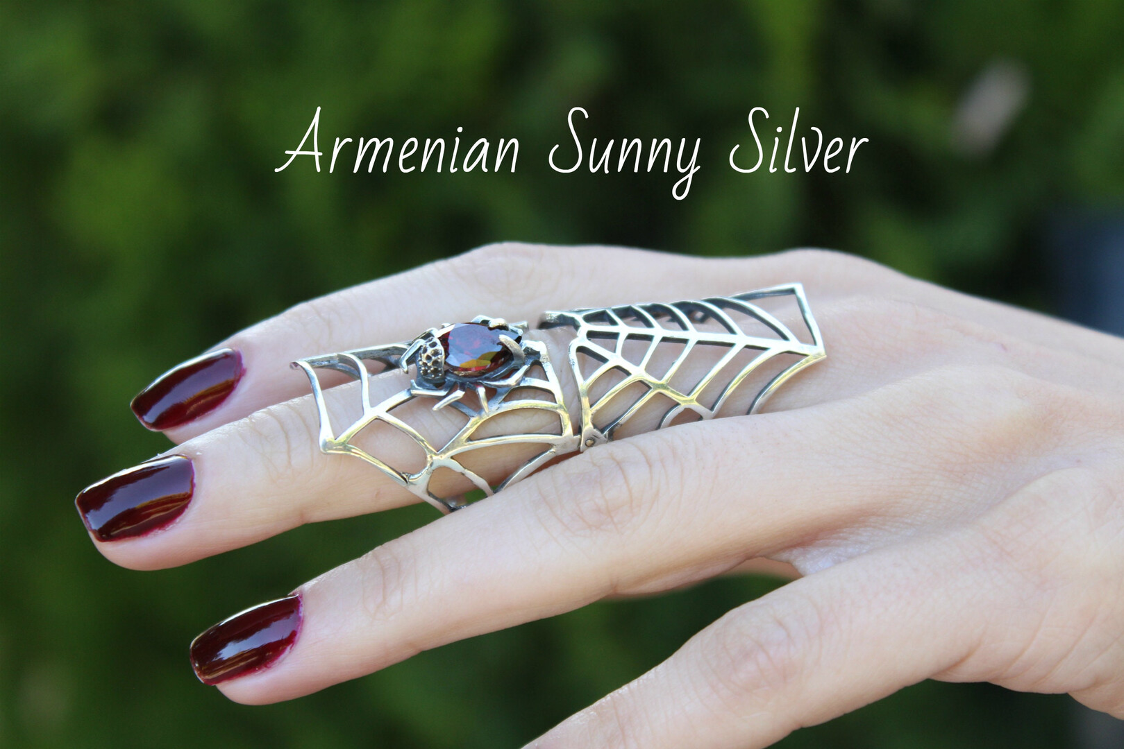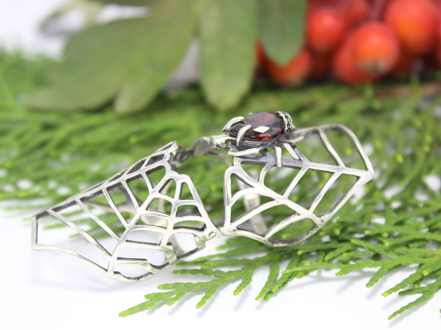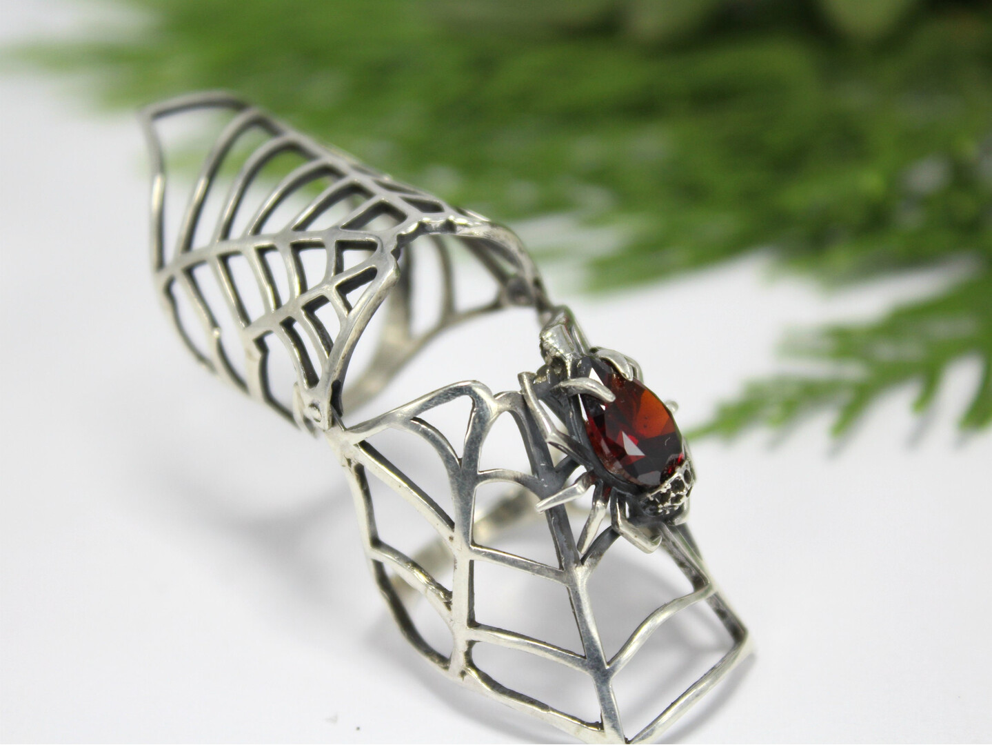 Sterling Silver Full Finger Red Stone Spider Double Armor Ring, Statement Big Boho Knuckles Spider Web Ring, Armenian Jewelry