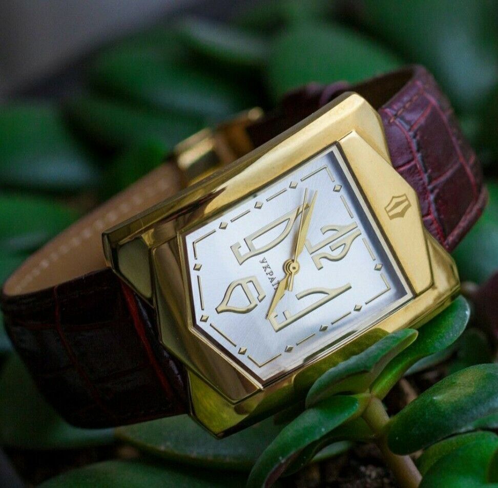 On the dial the style of numbers and their location is outlined with the coat of arms of Ukraine - Trident.