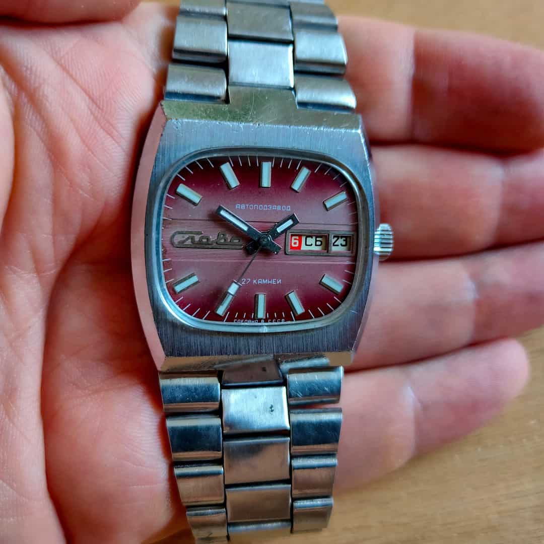 SLAVA TANK, Slava TV, rare red dial, Automatic watch, mens watch, vintage watch, russian watch, red watch, day and date indicator