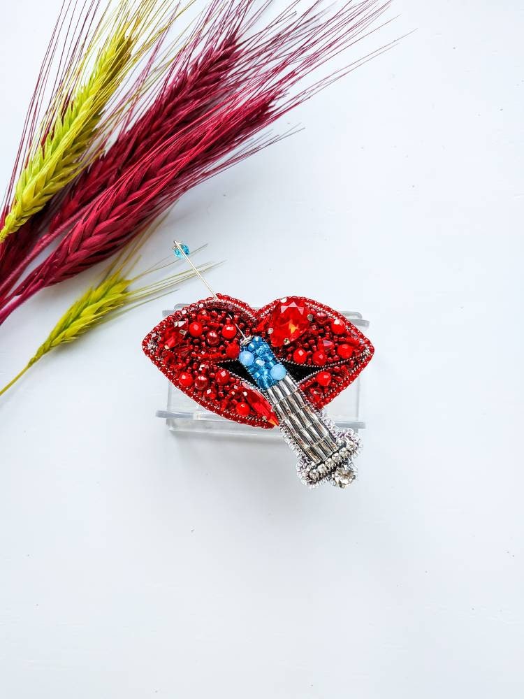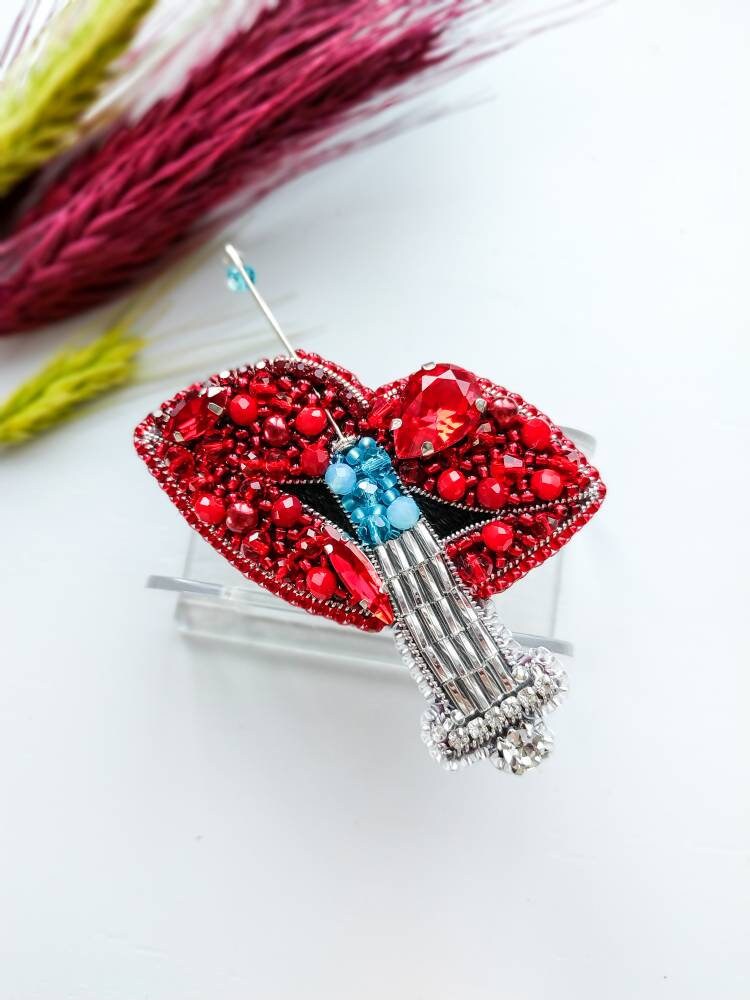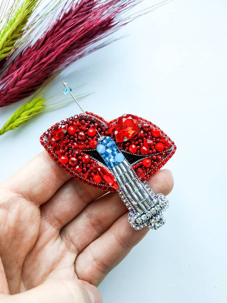 Beaded Lips Brooch: Crystal Syringe Pin, Gift for Cosmetologist