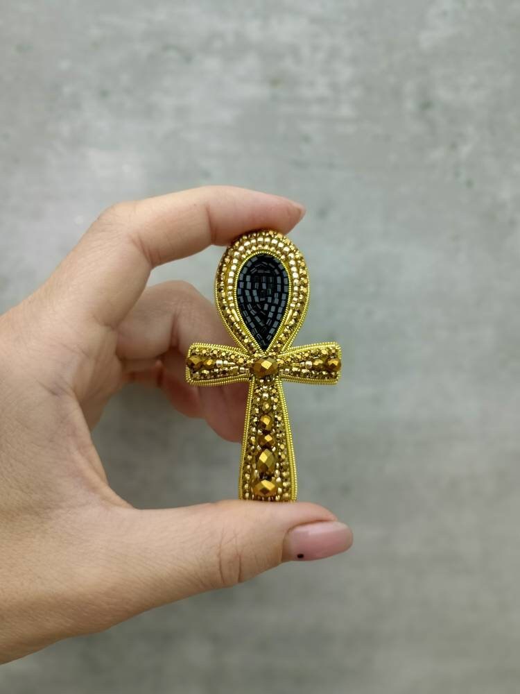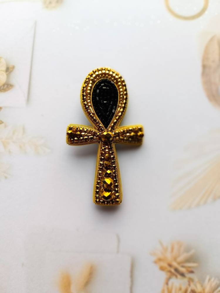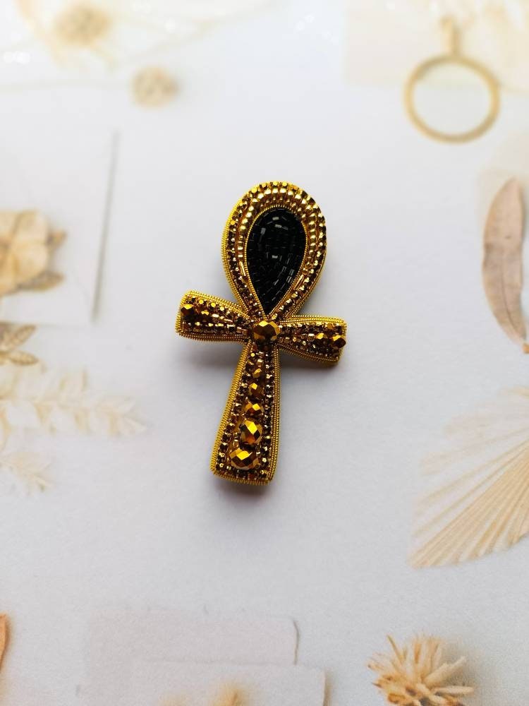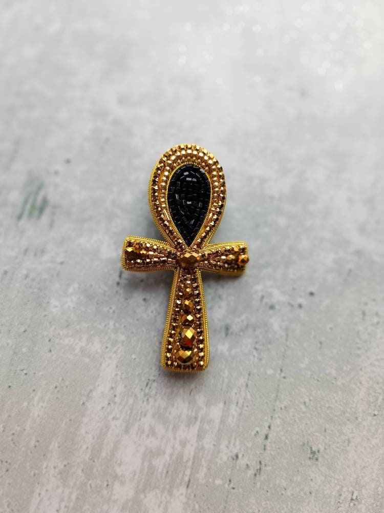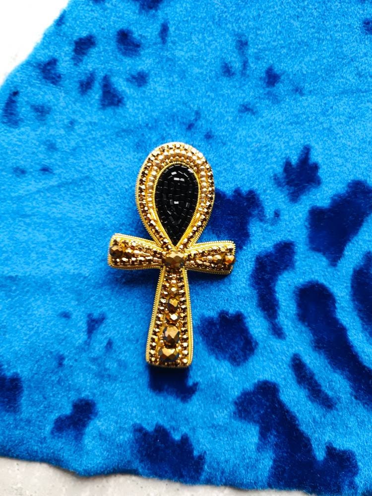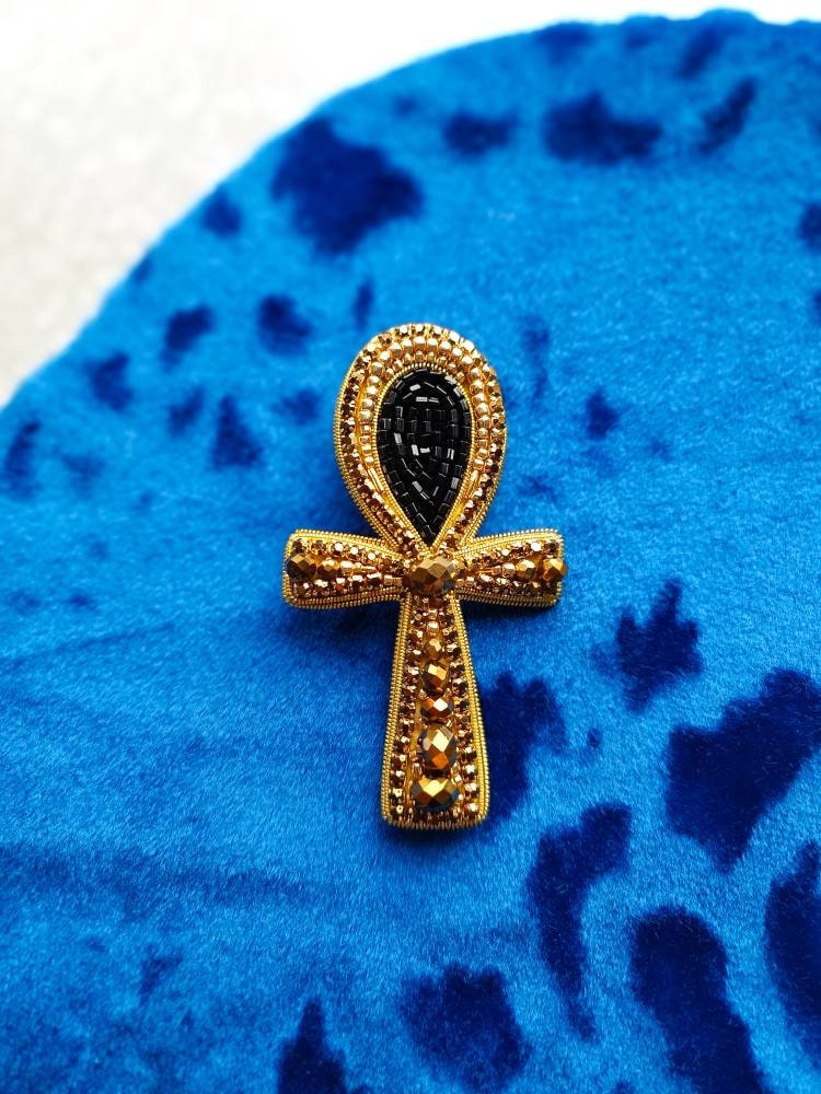 Embroidered Beaded Ankh Brooch: Egyptian Symbol Pin