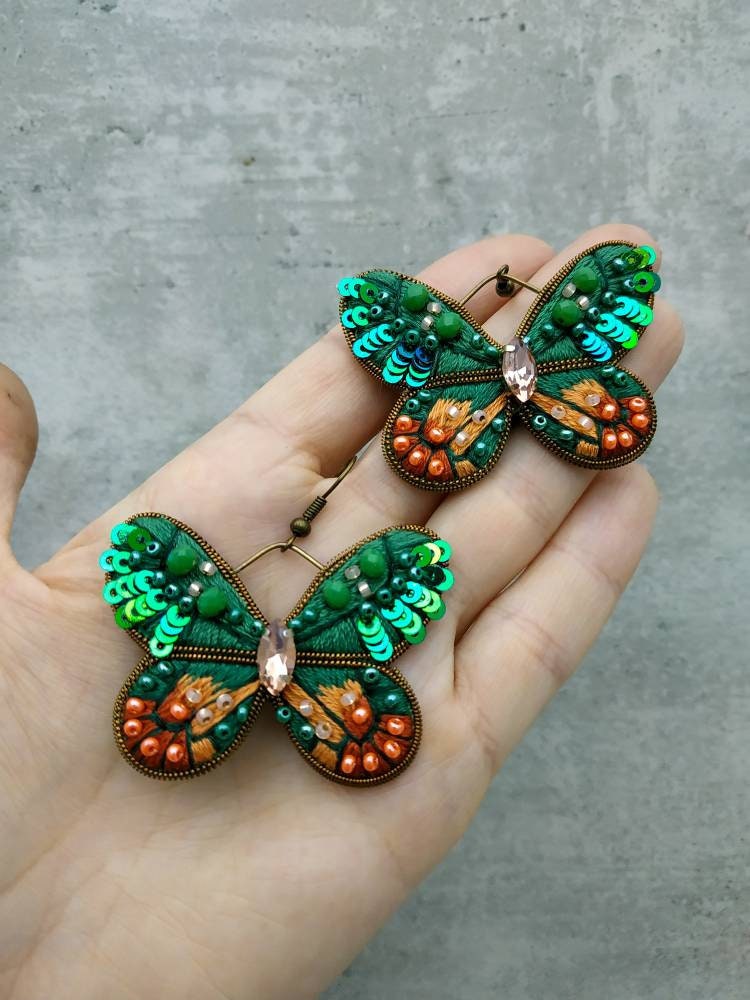 Embroidered Butterfly Jewelry Set: Beaded Insect Brooch and Earrings