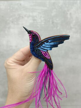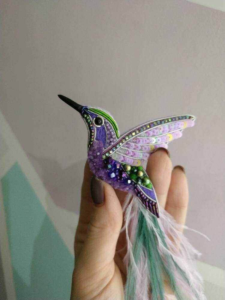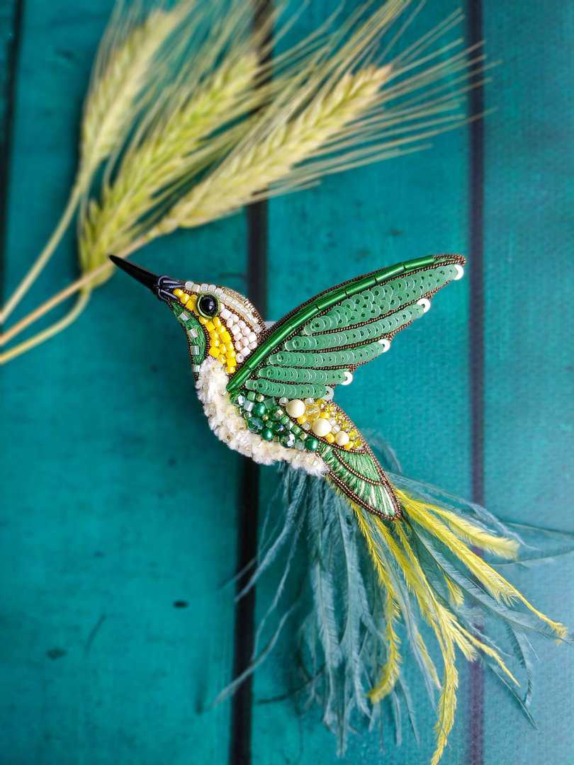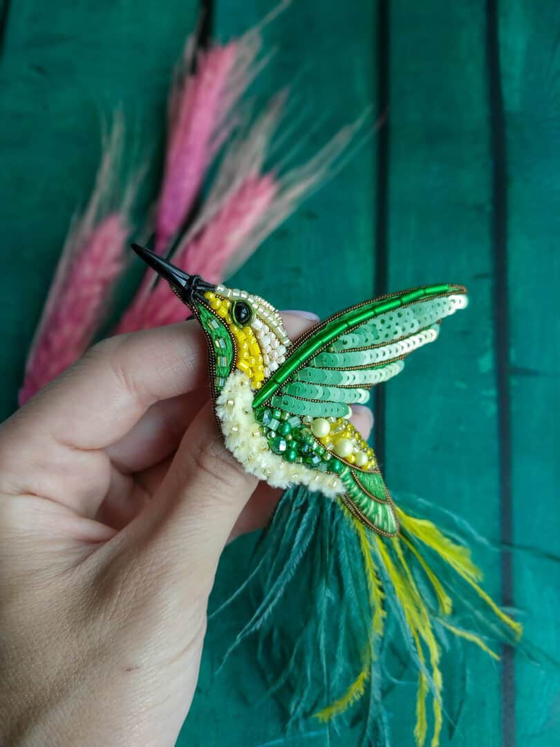 Embroidered hummingbird brooch beaded bird pin green and yellow hummingbird jewelry Christmas gift for her unique jewelry ostrich feather