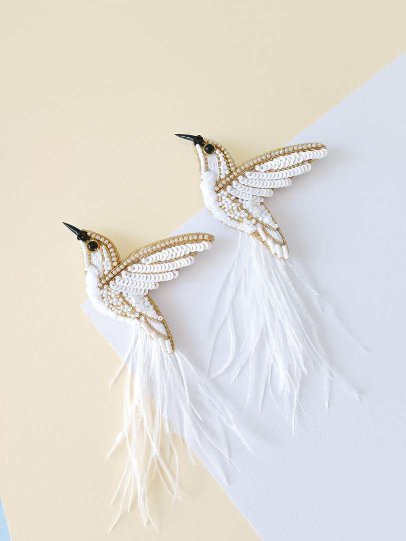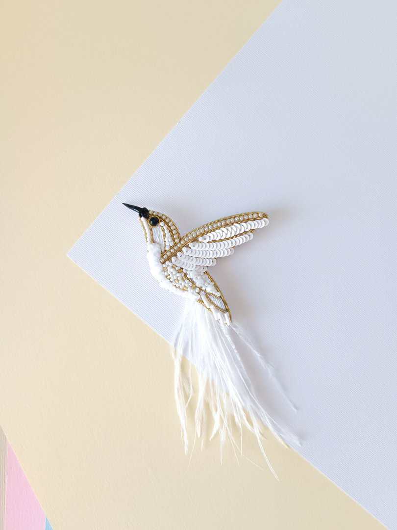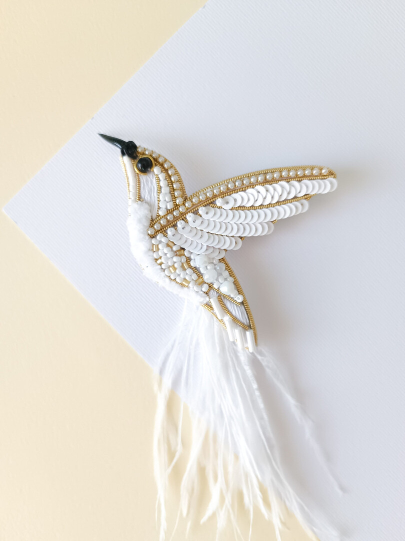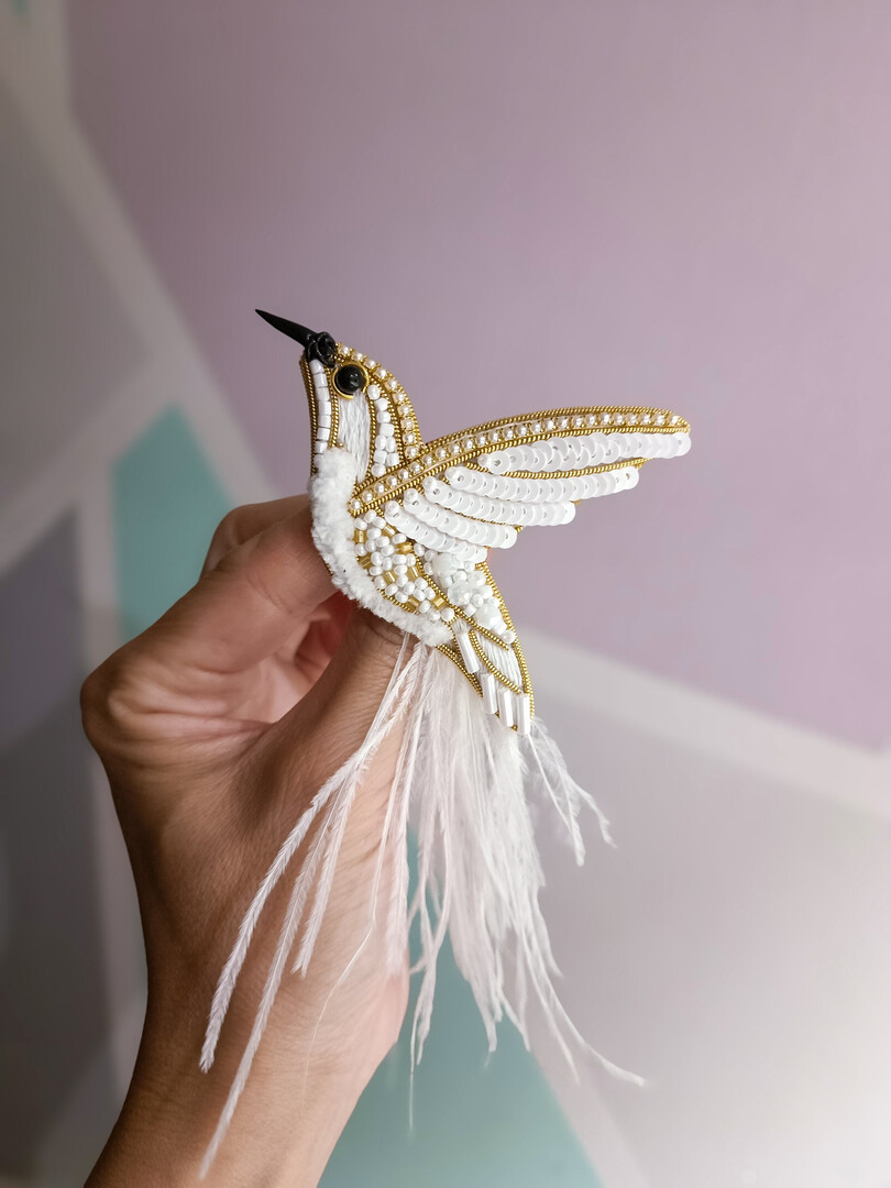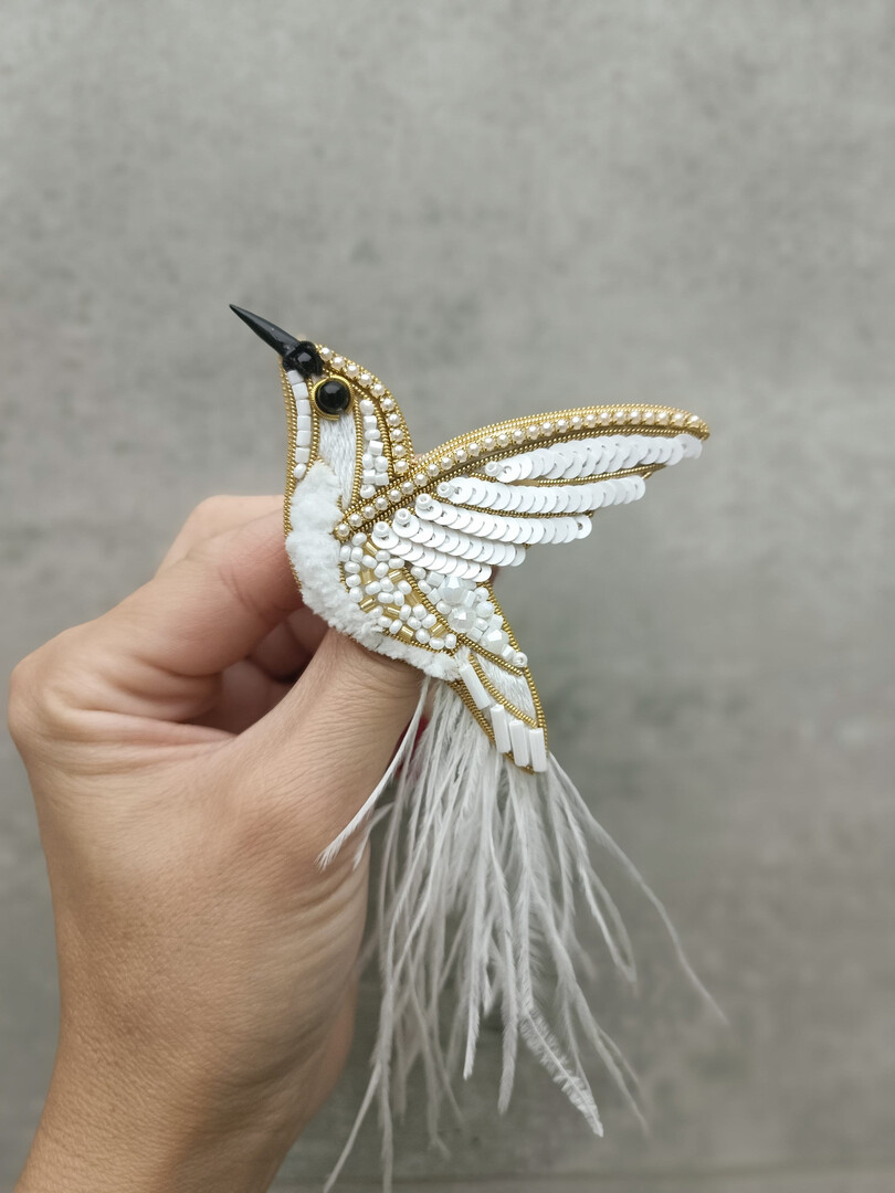 Embroidered hummingbird brooch white bird pin handmade jewelry beaded pin made in Ukraine wedding jewelry ukrainian shop wedding pin