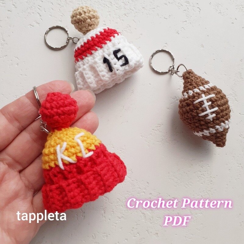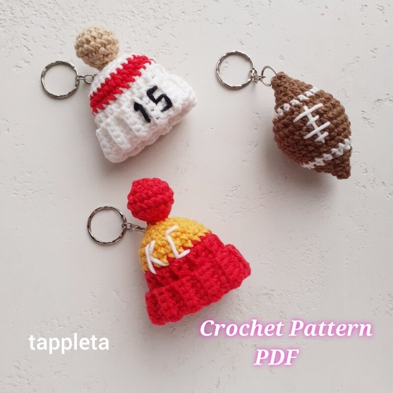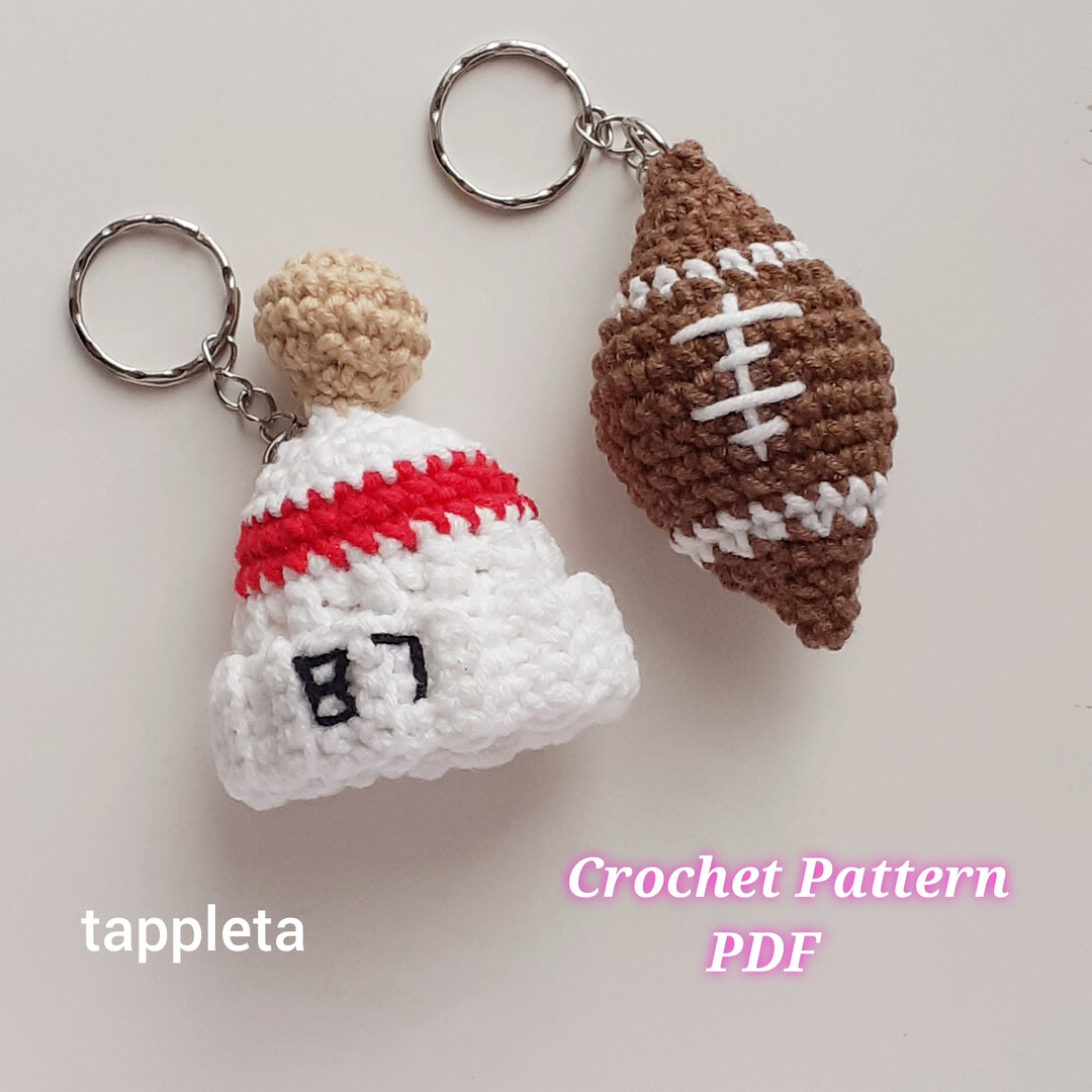Crochet mini Beanie hat and football keychains Crochet Pattern PDF. Mini red striped pom pom hat Chiefs style. Mini Football keychain crochet favors for Super Bowl, Sports fan accessories.
