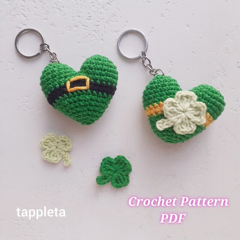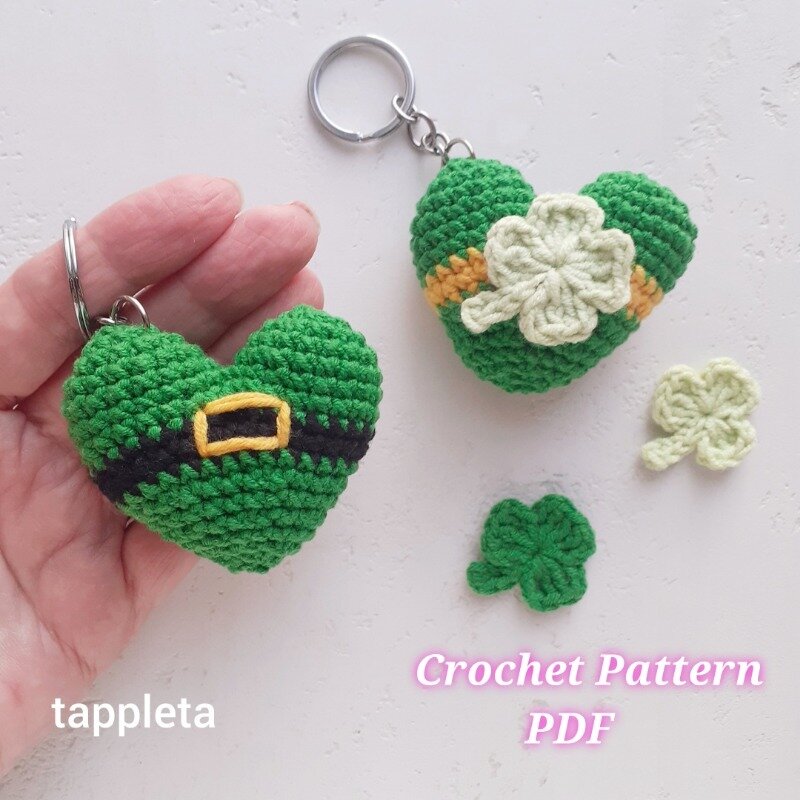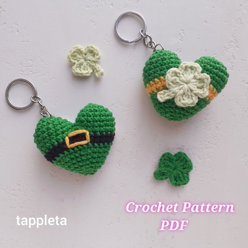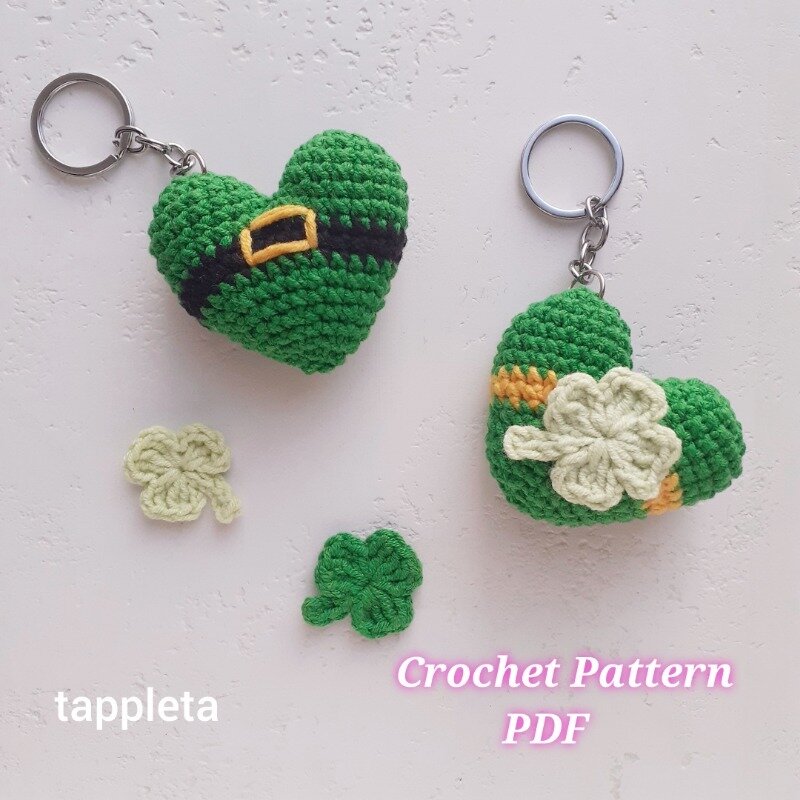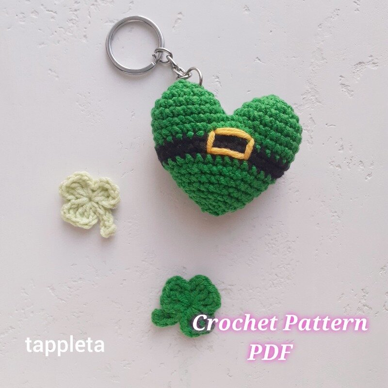 Heart lucky charms St Patricks day crochet pattern, St Patricks Day decor, amigurumi green heart, Leprechaun good luck keychain mini clover